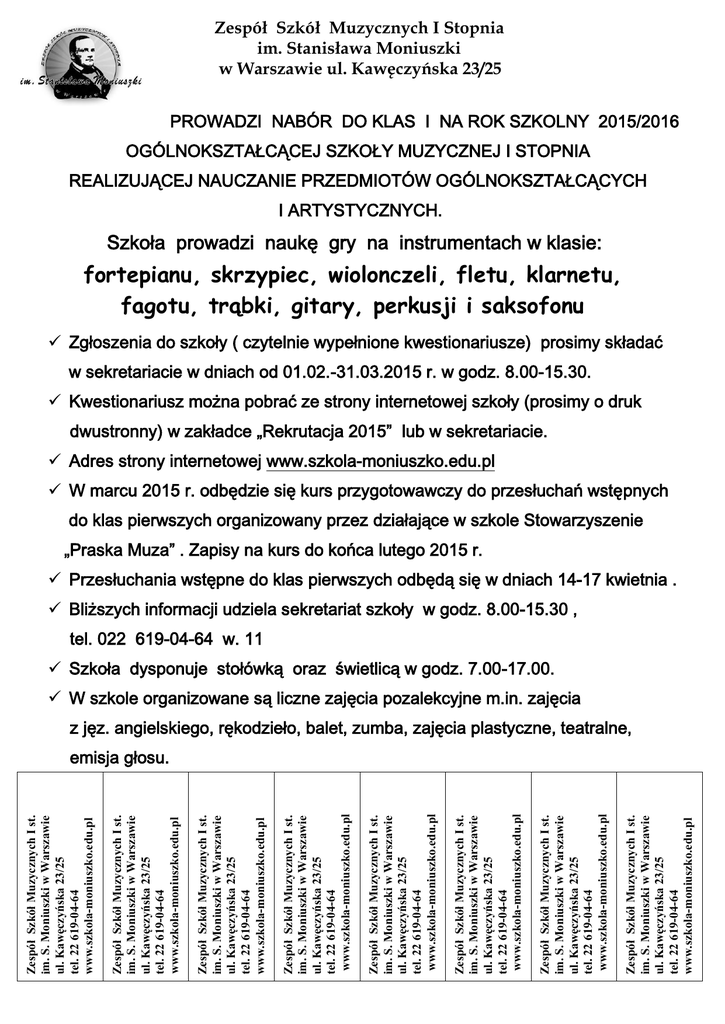 Zespół Szkół Muzycznych I Stopnia im. Stanisława Moniuszki w Warszawie ul. Kawęczyńska 23/25 PROWADZI NABÓR DO KLAS I NA ROK SZKOLNY 2015/2016 OGÓLNOKSZTAŁCĄCEJ SZKOŁY MUZYCZNEJ I STOPNIA REALIZUJĄCEJ NAUCZANIE PRZEDMIOTÓW OGÓLNOKSZTAŁCĄCYCH I ARTYSTYCZNYCH. Szkoła prowadzi naukę gry na instrumentach w klasie: fortepianu, skrzypiec, wiolonczeli, fletu, klarnetu, fagotu, trąbki, gitary, perkusji i saksofonu Zgłoszenia do szkoły ( czytelnie wypełnione kwestionariusze) prosimy składać w sekretariacie w dniach od 01.02.-31.03.2015 r. w godz. 8.00-15.30. Kwestionariusz można pobrać ze strony internetowej szkoły (prosimy o druk dwustronny) w zakładce „Rekrutacja 2015” lub w sekretariacie. Adres strony internetowej www.szkola-moniuszko.edu.pl W marcu 2015 r. odbędzie się kurs przygotowawczy do przesłuchań wstępnych do klas pierwszych organizowany przez działające w szkole Stowarzyszenie „Praska Muza” . Zapisy na kurs do końca lutego 2015 r. Przesłuchania wstępne do klas pierwszych odbędą się w dniach 14-17 kwietnia . Bliższych informacji udziela sekretariat szkoły w godz. 8.00-15.30 , tel. 022 619-04-64 w. 11 Szkoła dysponuje stołówką oraz świetlicą w godz. 7.00-17.00. W szkole organizowane są liczne zajęcia pozalekcyjne m.in. zajęcia z jęz. angielskiego, rękodzieło, balet, zumba, zajęcia plastyczne, teatralne, Zespół Szkół Muzycznych I st. im. S. Moniuszki w Warszawie ul. Kawęczyńska 23/25 tel. 22 619-04-64 www.szkola-moniuszko.edu.pl Zespół Szkół Muzycznych I st. im. S. Moniuszki w Warszawie ul. Kawęczyńska 23/25 tel. 22 619-04-64 www.szkola-moniuszko.edu.pl Zespół Szkół Muzycznych I st. im. S. Moniuszki w Warszawie ul. Kawęczyńska 23/25 tel. 22 619-04-64 www.szkola-moniuszko.edu.pl Zespół Szkół Muzycznych I st. im. S. Moniuszki w Warszawie ul. Kawęczyńska 23/25 tel. 22 619-04-64 www.szkola-moniuszko.edu.pl Zespół Szkół Muzycznych I st. im. S. Moniuszki w Warszawie ul. Kawęczyńska 23/25 tel. 22 619-04-64 www.szkola-moniuszko.edu.pl Zespół Szkół Muzycznych I st. im. S. Moniuszki w Warszawie ul. Kawęczyńska 23/25 tel. 22 619-04-64 www.szkola-moniuszko.edu.pl Zespół Szkół Muzycznych I st. im. S. Moniuszki w Warszawie ul. Kawęczyńska 23/25 tel. 22 619-04-64 www.szkola-moniuszko.edu.pl Zespół Szkół Muzycznych I st. im. S. Moniuszki w Warszawie ul. Kawęczyńska 23/25 tel. 22 619-04-64 www.szkola-moniuszko.edu.pl emisja głosu.