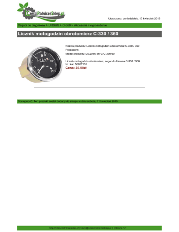Utworzono: poniedziałek, 13 kwiecień 2015 Części do ciągników > URSUS > C-360 > Akcesoria i wyposażenie Licznik motogodzin obrotomierz C-330 / 360 Nazwa produktu: Licznik motogodzin obrotomierz C-330 / 360 Producent: Model produktu: LICZNIK MTG C-330/60 Licznik motogodzin obrotomierz, zegar do Ursusa C-330 / 360 Nr. kat. 50657151 Cena: 39.00zł Dostępność: Ten produkt został dodany do sklepu w dniu sobota, 11 kwiecień 2015 http://czescirolniczesklep.pl | [email protected] | | Strona 1/1