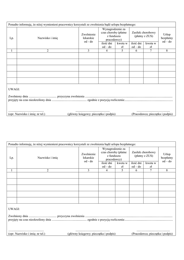 Ponadto informuję, że niżej wymienieni pracownicy korzystali ze zwolnienia bądź urlopu bezpłatnego: Wynagrodzenie za czas choroby (płatne Zasiłek chorobowy Zwolnienie z funduszu (płatny z ZUS) Lp. Nazwisko i imię lekarskie pracodawcy) od - do ilość dni kwota w ilość dni kwota w od – do zł od – do zł 1 2 3 4 5 6 7 Urlop bezpłatny od – do 8 UWAGI: Zwolniony dnia .................................... przyczyna zwolnienia ................................................................................................................. przyjęty na czas nieokreślony dnia ............................................. zgodnie z pozycją rozliczenia:.............................................................. .............................................. (opr. Nazwisko i imię; nr tel.) ............................................ (główny księgowy; pieczątka i podpis) ........................................... (Pracodawca; pieczątka i podpis) Ponadto informuję, że niżej wymienieni pracownicy korzystali ze zwolnienia bądź urlopu bezpłatnego: Wynagrodzenie za czas choroby (płatne Zasiłek chorobowy Zwolnienie z funduszu (płatny z ZUS) Lp. Nazwisko i imię lekarskie pracodawcy) od - do ilość dni kwota w ilość dni kwota w od – do zł od – do zł 1 2 3 4 5 6 7 Urlop bezpłatny od – do 8 UWAGI: Zwolniony dnia .................................... przyczyna zwolnienia ................................................................................................................. przyjęty na czas nieokreślony dnia ............................................. zgodnie z pozycją rozliczenia:.............................................................. .............................................. (opr. Nazwisko i imię; nr tel.) ............................................ (główny księgowy; pieczątka i podpis) ........................................... (Pracodawca; pieczątka i podpis)