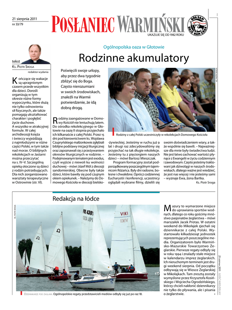 I 21 sierpnia 2011 nr 33/79 UKAZUJE SIĘ OD 1982 ROKU Ogólnopolska oaza w Głotowie Poświęcili swoje urlopy, aby przez dwa tygodnie zbliżyć się do Boga. Często nierozumiani w swoich środowiskach, znaleźli na Warmii potwierdzenie, że idą dobrą drogą. redaktor wydania K ończące się wakacje są upragnionym czasem przede wszystkim dla dzieci. Dorośli organizują w tym okresie różne formy wypoczynku, które służą nie tylko odnowieniu sił fizycznych, ale także pomagają ukształtować charakter i pogłębić życie duchowe. A wszystko w atrakcyjnej formule. W całej archidiecezji księża i świeccy wyjeżdżają z najmłodszymi w różne części Polski, w tym także nad morze. O biblijnych rekolekcjach w Jastarni można przeczytać na s. IV–V. Szczególną opieką otoczone są dzieci z rodzin potrzebujących. Dla nich zorganizowano warsztaty terapeutyczne w Ostrowinie (str. VI). Ks. Piotr Sroga Rodzinne akumulatory tekst Ks. Piotr Sroga R odziny zaangażowane w Domowy Kościół nie leniuchują latem. Do ośrodka rekolekcyjnego w Głotowie na oazę II stopnia przyjechało ich kilkanaście z całej Polski. Przez 15 dni pod kierownictwem ks. Wojsława Czupryńskiego małżonkowie zgłębiali biblijne podstawy inicjacji liturgicznej oraz zapoznawali się z przeżywaniem okresów liturgicznych w rodzinie. – Podejmowanym tematem jest exodus, czyli wyjście z niewoli ku wolności duchowej – mówi Józef Mól z diecezji sandomierskiej. Obecne były także dzieci, które bawiły się pod czujnym okiem opiekunek. – Należymy do Domowego Kościoła w diecezji bielsko- Rodziny z całej Polski uczestniczyły w rekolekcjach Domowego Kościoła -żywieckiej. Jesteśmy w ruchu już 9 lat i drugi raz zdecydowaliśmy się przyjechać na tak długie rekolekcje. Jesteśmy tu z pięciorgiem naszych dzieci – mówi Bartosz Mieszczak. Program formacyjny został podporządkowany poszczególnym tajemnicom Różańca. Były dni radosne, bolesne i chwalebne. Oprócz codziennej Eucharystii i konferencji, uczestnicy oglądali wybrane filmy, dzielili się Ks. Piotr Sroga Redakcja na łódce Ks. Piotr Sroga M azury to wymarzone miejsce do uprawiania sportów wodnych, dlatego co roku gościmy mnóstwo pasjonatów żeglarstwa – mówi marszałek Jacek Protas. W ostatni weekend do Mikołajek zjechali się dziennikarze z całej Polski. Wystartowało kilkadziesiąt jednostek reprezentujących poszczególne media. Organizatorem było Warmińsko-Mazurskie Towarzystwo Żeglarskie. Pierwsze regaty odbyły się w roku 1994 i znalazły stałe miejsce w kalendarzu imprez żeglarskich. Ich nieruchomym terminem jest drugi weekend sierpnia. Od początku odbywają się w Wiosce Żeglarskiej w Mikołajkach. Tam zresztą zostały wymyślone przez Krzysztofa Kosińskiego i Wojciecha Ogrodzińskiego, którzy chcieli nakłonić dziennikarzy nie tylko do pływania, ale i pisania o żeglarstwie. • 21 sierpnia 2011 Gość Niedzielny Dziennikarze pod żaglami. Ogólnopolskie regaty przedstawicieli mediów odbyły się już po raz 18. swoim doświadczeniem wiary, a także wspólnie się bawili. – Najważniejsze dla mnie były świadectwa ludzi. Nie jest łatwo zachować wartości płynące z Ewangelii w życiu codziennym i zawodowym. Często jesteśmy traktowani jak dziwolągi w naszych środowiskach, dlatego ważne jest wiedzieć, że jest nas więcej i nie jesteśmy sami – wyznaje Ewa, żona Bartka. II posłaniec warmiński posłaniec warmiński Rower za podwyżki? Łukasz Czechyra Byle do września Zwiększenie opłat nie podoba się kierowcom, ale raczej nie da się ich uniknąć. Warto pomyśleć nad bardziej ekonomicznym środkiem transportu O lsztyn. Funkcjonujące od lat papierowe karty parkingowe powoli odchodzą do lamusa. Ciągle działają, ale powoli zastępują je parkomaty ustawione w całej strefie płatnego parkowania. Na razie obowiązują stare ceny, ale już wkrótce może się to zmienić – urząd miasta po podwyżce cen biletów autobusowych planuje Zdjęcia Łukasz Czechyra Odkryj legendę Wielbark . W marcu tego roku w gimnazjum w Wielbarku wybuchł pożar. Od razu ruszyły zbiórki pieniędzy – pomoc płynęła od parafian, sąsiednich szkół, gmin, służb publicznych. Teraz swoją cegiełkę dorzucił także polski rząd. Wojewoda warmińsko-mazurski podczas spotkania z dyrekcją i nauczycielami placówki przekazał im decyzję o przyznaniu szkole 300 tys. złotych na odbudowę spalonego budynku. – Poprosiłem premiera o uruchomienie środków finansowych z rezerwy budżetowej, by ta szkoła 1 września rozpoczęła normalną pracę. Aby dzieci mogły uczyć się bezpiecznie, w przyjaznych warunkach — mówił Marian Podziewski. Udał się też do szkoły, gdzie ocenił postępy prac budowlanych i remontowych. – Mam nadzieję, że te 300 tys. pozwoli na dokończenie najpilniejszych prac. Wszystkim państwu – mieszkańcom, władzom, nauczycielom, rodzicom i uczniom – dziękuję przede wszystkim za determinację i podejmowane inicjatywy, które z pewnością przyczyniły się do tego, że możliwe było tak szybkie przeprowadzenie prac remontowych w spalonym budynku – mówił wojewoda. Bud Łukasz Czechyra [email protected] Już wkrótce olsztyńska katedra będzie się prezentować jeszcze okazalej Adres redakcji: ul. S. Pieniężnego 22, 10-006 Olsztyn Telefon (89) 524 71 62 Redagują: ks. Piotr Sroga – dyrektor oddziału, tel. 664 124 798, Krzysztof Kozłowski, tel. 664 126 989, Łukasz Czechyra, tel. 664 126 993 W czasach reformacji pierwsza kaplica została zburzona, a słynna lipa ścięta Renowacja sanktuarium w Świętej Lipce Może być nawet zielona Bazylika nie jest już biało-żółta, tylko czerwona. Niektórzy kręcą nosem, ale i tak stoją w kolejce do wejścia. W końcu nie dla koloru ścian tu przyjechali. ko poprawili wygląd obiektów, ale, co najważniejsze, usunęli przyczynę zniszczeń. Nowy design Dzięki kompleksowym rozwiązaniom nie bę