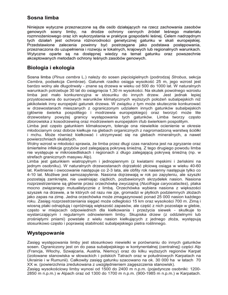 Sosna limba Niniejsze wytyczne przeznaczone są dla osób działających na rzecz zachowania zasobów genowych sosny limby, na drodze ochrony cennych źródeł leśnego materiału rozmnożeniowego oraz ich wykorzystania w praktyce gospodarki leśnej. Celem nadrzędnym tych działań jest ochrona różnorodności genetycznej gatunku w skali europejskiej. Przedstawione zalecenia powinny być postrzegane jako podstawa postępowania, przeznaczona do uzupełnienia i rozwoju w lokalnych, krajowych lub regionalnych warunkach. Wytyczne oparte są na dostępnej wiedzy na temat gatunku oraz powszechnie akceptowanych metodach ochrony leśnych zasobów genowych. Biologia i ekologia Sosna limba (Pinus cembra L.) należy do sosen pięcioigielnych (podrodzaj Strobus, sekcja Cembra, podsekcja Cembrae). Gatunek rzadko osiąga wysokość 25 m, jego wzrost jest bardzo wolny ale długotrwały - znane są drzewa w wieku od 500 do 1000 lat. W naturalnych warunkach potrzebuje 30 lat do osiągnięcia 1,30 m wysokości. Na skutek powolnego wzrostu limba jest mało konkurencyjna w stosunku do innych drzew. Jest jednak lepiej przystosowana do surowych warunków klimatycznych wyższych położeń subalpejskich niż jakikolwiek inny europejski gatunek drzewa. W związku z tym może skutecznie konkurować w drzewostanach mieszanych z ograniczonym udziałem innych gatunków subalpejskich (głównie świerka pospolitego i modrzewia europejskiego) oraz tworzyć może lite drzewostany powyżej granicy występowania tych gatunków. Limba tworzy często zbiorowiska z kosodrzewiną oraz modrzewiem europejskim i/lub świerkiem pospolitym. Limba jest często gatunkiem klimaksowym, toleruje ona niewielkie ocienienie w okresie młodocianym oraz dobrze kiełkuje na glebach organicznych z nagromadzoną warstwą ściółki i mchu. Może również kiełkować i utrzymywać się na glebach mineralnych, a nawet powierzchniach skalistych. Wolny wzrost w młodości sprawia, że limba przez długi czas narażona jest na zgryzanie oraz śmiertelne infekcje grzybów pod zalegającą pokrywą śnieżną. Z tego drugiego powodu limba nie występuje w mikrosiedliskach i regionach z długo zalegającą pokrywą śnieżną (np. w strefach granicznych masywu Alp). Limba jest gatunkiem wiatropylnym i jednopiennym (z kwiatami męskimi i żeńskimi na jednym osobniku). W naturalnych drzewostanach dojrzałość płciową osiąga w wieku 40-60 lat. Kwitnienie i owocowanie następuje co 2-3 lata, ale obfity rok nasienny następuje tylko co 4-10 lat. Możliwe jest samozapylenie. Nasiona dojrzewają w rok po zapyleniu, ale szyszki pozostają zamknięte, nie uwalniając ciężkich, pozbawionych skrzydełek nasion. Nasiona rozprzestrzeniane są głównie przez orzechówkę zwyczajną (Nucifraga caryocatactes), ptaka mocno związanego mutualistycznie z limbą. Orzechówka wybiera nasiona z większości szyszek na drzewie, a te których od razu nie zje, gromadzi w płytkich podziemnych złożach jako zapas na zimę. Jedna orzechówka może zmagazynować ponad 25 000 nasion każdego roku. Zasięg rozprzestrzeniania sięgać może odległości 15 km oraz wysokości 700 m. Zimą i wiosną ptaki odnajdują i opróżniają większość zapasów, ale część z nich pozostaje w glebie, często w miejscach odpowiednich dla kiełkowania i przeżycia siewek - skutkuje to wystarczającym i regularnym odnowieniem limby. Skupiska drzew (z oddzielnymi lub zrośniętymi pniami) powstałe z wielu nasion kiełkujących z jednego złoża, występują stosunkowo często i poprawiaj stabilność subalpejskiego pietra roślinnego. Występowanie Zasięg występowania limby jest stosunkowo niewielki w porównaniu do innych gatunków sosen. Ograniczony jest on do pasa subalpejskiego w kontynentalnej (centralnej) części Alp (Francja, Włochy, Szwajcaria, Austria, Niemcy) oraz do kilku wyższych regionów Karpat (izolowane stanowiska w słowackich i polskich Tatrach oraz w południowych Karpatach na Ukrainie i w Rumunii). Całkowity zasięg gatunku szacowano na ok. 30 000 ha w latach 70 XX w. (powierzchnia zredukowana z uwzględnieniem zagęszczenia stanowisk). Zasięg wysokościowy limby wynosi od 1500 do 2400 m n.p.m. (pojedyncze osobniki: 12002850 m n.p.m.) w Alpach oraz od 1300 do 1700 m n.p.m. (900-1985 m n.p.m.) w Karpatach. Dolna granica ograniczona jest konkurencją innych gatunków drzew (głównie świerka pospolitego), granica górna z kolei stanowi fizjologiczną granicą klimatyczną. Za pierwotny region pochodzenia limby uważana jest Syberia, gdzie rozległe obszary pokrywa jej najbliższy krewny - sosna syberyjska (opisywana przez niektórych autorów jako P. cembra var. sibirica lub P. cembra subsp. sibirica). Uważa się, że ostatnie zlodowacenie limba przetrwała w pobliżu Alp i Karpat, skąd we wczesnej fazie postglacjalnej rozprzestrzeniła się na duże obszary. Z niższych położeń była później wypierana. Znaczenie i zastosowanie W obszarach naturalnego występowania limba współtworzy najwyższe górskie piętro lasu, w formie mieszanych lub litych drzewostanów. W związku z tym ma istotną funkcję ochronną dla przyległych obszarów. Obecność zimozielonych drzew w tej strefie wysokościowej pomaga zminimalizować ryzyko lawin i erozji gleby. Limba jest zatem cenionym czynnikiem stabilizującym, często wykorzystywanym w zalesianiu wyższych położeń górskich. Bory limbowe (lite i mieszane) w wielu regionach słynących z turystyki letniej i zimowej posiadają wysokie walory estetyczne i ozdobne. Oprócz funkcji ochronnych i estetycznych, wysoko cenione jest również drewno limby. Z powodu szczególnych cech (miękkość, lekkość, odporność, ciepła czerwonawa barwa, zapach żywicy) przeznaczane jest głównie na boazerie, rzeźby i tradycyjne meble. Obrotowi handlowemu podlegają jednak stosunkowo niewielkie ilości surowca (głównie na potrzeby lokalnych rynków). Wiedza genetyczna Zgodnie z przyjętą lokalizacją refugiów ostatn