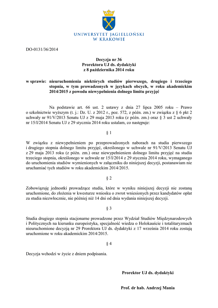 DO-0131/36/2014 Decyzja nr 36 Prorektora UJ ds. dydaktyki z 8 października 2014 roku w sprawie: nieuruchomienia niektórych studiów pierwszego, drugiego i trzeciego stopnia, w tym prowadzonych w językach obcych, w roku akademickim 2014/2015 z powodu niewypełnienia dolnego limitu przyjęć Na podstawie art. 66 ust. 2 ustawy z dnia 27 lipca 2005 roku – Prawo o szkolnictwie wyższym (t. j.: Dz. U. z 2012 r., poz. 572, z późn. zm.) w związku z § 6 pkt 2 uchwały nr 91/V/2013 Senatu UJ z 29 maja 2013 roku (z późn. zm.) oraz § 3 ust 2 uchwały nr 15/I/2014 Senatu UJ z 29 stycznia 2014 roku ustalam, co następuje: §1 W związku z niewypełnieniem po przeprowadzonych naborach na studia pierwszego i drugiego stopnia dolnego limitu przyjęć, określonego w uchwale nr 91/V/2013 Senatu UJ z 29 maja 2013 roku (z późn. zm.) oraz niewypełnieniem dolnego limitu przyjęć na studia trzeciego stopnia, określonego w uchwale nr 15/I/2014 z 29 stycznia 2014 roku, wymaganego do uruchomienia studiów wymienionych w załączniku do niniejszej decyzji, postanawiam nie uruchamiać tych studiów w roku akademickim 2014/2015. §2 Zobowiązuję jednostki prowadzące studia, które w wyniku niniejszej decyzji nie zostaną uruchomione, do złożenia w kwesturze wniosku o zwrot wniesionych przez kandydatów opłat za studia niezwłocznie, nie później niż 14 dni od dnia wydania niniejszej decyzji. §3 Studia drugiego stopnia stacjonarne prowadzone przez Wydział Studiów Międzynarodowych i Politycznych na kierunku europeistyka, specjalność wiedza o Holokauście i totalitaryzmach nieuruchomione decyzją nr 29 Prorektora UJ ds. dydaktyki z 17 września 2014 roku zostają uruchomione w roku akademickim 2014/2015. §4 Decyzja wchodzi w życie z dniem podpisania. Prorektor UJ ds. dydaktyki Prof. dr hab. Andrzej Mania Załącznik do decyzji nr 36 Prorektora UJ ds. dydaktyki z 8 października 2014 r. Niestacjonarne studia pierwszego stopnia prowadzone w języku polskim nieuruchomione w roku akademickim 2014/2015 Wydział Specjalność Kierunek Filologiczny neofilologia Nauk o Zdrowiu pielęgniarstwo (pomostowe) Studiów Międzynarodowych i Politycznych kulturoznawstwo Specjalizacja filologia w zakresie języka włoskiego kulturoznawstwo międzynarodowe Niestacjonarne studia drugiego stopnia prowadzone w języku polskim nieuruchomione w roku akademickim 2014/2015 Wydział Fizyki, Astronomii i Informatyki Stosowanej Studiów Międzynarodowych i Politycznych Studiów Międzynarodowych i Politycznych Specjalność Kierunek informatyka informatyka stosowana amerykanistyka Ameryka Północna Specjalizacja produkcja gier wideo relacje międzykulturowe Zarządzania i Komunikacji Społecznej zarządzanie zarządzanie w sektorze publicznym i pozarządowym Zarządzania i Komunikacji Społecznej zarządzanie zarządzanie w sporcie Stacjonarne studia drugiego stopnia prowadzone w języku obcym nieuruchomione w roku akademickim 2014/2015 Wydział Specjalność Kierunek Matematyki i Informatyki matematyka Polonistyki międzykierunkowe studia magisterskie z zakresu polonistyki, judaistyki i historii Studiów Międzynarodowych i Politycznych europeistyka Specjalizacja ogólna Unia Europejska/Rządy Prawa, przywództwo i demokracja Niestacjonarne studia trzeciego stopnia prowadzone w języku obcym nieuruchomione w roku akademickim 2014/2015 Wydział Polonistyki Dziedzina nauki humanistyczne Dyscyplina literaturoznawstwo Dodatkowa informacja studia niestacjonarne prowadzone w języku obcym Prorektor UJ ds. dydaktyki Prof. dr hab. Andrzej Mania