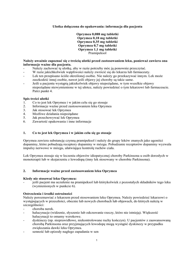 Ulotka dołączona do opakowania: informacja dla pacjenta Oprymea 0,088 mg tabletki Oprymea 0,18 mg tabletki Oprymea 0,35 mg tabletki Oprymea 0,7 mg tabletki Oprymea 1,1 mg tabletki Pramipeksol Należy uważnie zapoznać się z treścią ulotki przed zastosowaniem leku, ponieważ zawiera ona informacje ważne dla pacjenta. Należy zachować tę ulotkę, aby w razie potrzeby móc ją ponownie przeczytać. W razie jakichkolwiek wątpliwości należy zwrócić się do lekarza lub farmaceuty. Lek ten przepisano ściśle określonej osobie. Nie należy go przekazywać innym. Lek może zaszkodzić innej osobie, nawet jeśli objawy jej choroby są takie same. Jeśli u pacjenta wystąpią jakiekolwiek objawy niepożądane, w tym wszelkie objawy niepożądane niewymienione w tej ulotce, należy powiedzieć o tym lekarzowi lub farmaceucie. Patrz punkt 4. Spis treści ulotki 1. Co to jest lek Oprymea i w jakim celu się go stosuje 2. Informacje ważne przed zastosowaniem leku Oprymea 3. Jak stosować lek Oprymea 4. Możliwe działania niepożądane 5. Jak przechowywać lek Oprymea 6. Zawartość opakowania i inne informacje 1. Co to jest lek Oprymea i w jakim celu się go stosuje Oprymea zawiera substancję czynną pramipeksol i należy do grupy leków znanych jako agoniści dopaminy, które pobudzają receptory dopaminy w mózgu. Pobudzanie receptorów dopaminy wyzwala impulsy nerwowe w mózgu, ułatwiające kontrolę ruchów ciała. Lek Oprymea stosuje się w leczeniu objawów idiopatycznej choroby Parkinsona u osób dorosłych w monoterapii lub w skojarzeniu z lewodopą (inny lek stosowany w chorobie Parkinsona). 2. Informacje ważne przed zastosowaniem leku Oprymea Kiedy nie stosować leku Oprymea: jeśli pacjent ma uczulenie na pramipeksol lub którykolwiek z pozostałych składników tego leku (wymienionych w punkcie 6). Ostrzeżenia i środki ostrożności Należy porozmawiać z lekarzem przed stosowaniem leku Oprymea. Należy powiedzieć lekarzowi o występujących w przeszłości, obecnie lub nowych chorobach lub objawach, do których należą w szczególności: choroba nerek. halucynacje (widzenie, słyszenie lub odczuwanie rzeczy, które nie istnieją). Większość halucynacji to omamy wzrokowe. dyskinezy (np. nieprawidłowe, niekontrolowane ruchy kończyn). U pacjentów z zaawansowaną chorobą Parkinsona oraz przyjmujących lewodopę mogą wystąpić dyskinezy w przypadku zwiększania dawki leku Oprymea. senność lub epizody nagłego zapadania w sen 1 - psychozy (np. porównywalne z objawami schizofrenii) zaburzenia widzenia. Podczas leczenia lekiem Oprymea należy poddawać się regularnym badaniom okulistycznym. ciężka choroba serca lub naczyń krwionośnych. Należy regularnie kontrolować ciśnienie tętnicze krwi, zwłaszcza na początku leczenia, w celu uniknięcia wystąpienia niedociśnienia ortostatycznego (spadek ciśnienia tętniczego krwi podczas wstawania). Należy powiedzieć lekarzowi, w przypadku gdy pacjent lub jego rodzina/opiekun zauważy, że pacjent zaczyna chęć lub pragnienie zachowywania się w sposób nietypowy oraz, gdy pacjent nie może się oprzeć impulsowi, popędowi lub pokusie podjęcia aktywności, które mogą zaszkodzić jemu lub innym. Powyższe zjawiska są nazywane zaburzeniami kontroli impulsów i mogą się objawiać zachowaniem, takim jak: nałogowy hazard, nadmierny apetyt lub potrzeba wydawania pieniędzy, zbyt duży popęd seksualny lub zwiększenie częstości i natężenia myśli lub odczuć o tematyce seksualnej. Lekarz może uznać za stosowne zmienić dawkę lub odstawić lek. Należy powiadomić lekarza, jeżeli pacjent albo jego rodzina/opiekun zauważy wystąpienie stanu pobudzenia maniakalnego (pobudzenie, euforia, nadmierne podniecenie) lub majaczenia (zmniejszona świadomość, dezorientacja, utrata kontaktu z rzeczywistością). Lekarz prowadzący może zmienić dawkę lub odstawić lek. Dzieci i młodzież Lek Oprymea nie jest zalecany do stosowania u dzieci i młodzieży w wieku poniżej 18 lat. Lek Oprymea a inne leki Należy powiedzieć lekarzowi lub farmaceucie o wszystkich lekach przyjmowanych przez pacjenta obecnie lub ostatnio, a także o lekach, które pacjent planuje przyjmować. Dotyczy to także leków, produktów ziołowych, zdrowej żywności lub suplementów, które wydawane są bez recepty. Należy unikać przyjmowania leku Oprymea jednocześnie z lekami przeciwpsychotycznymi. Należy zachować ostrożność w przypadku przyjmowania następujących leków: cymetydyna (stosowana w leczeniu nadmiernej kwasowości żołądka lub wrzodów żołądka); amantadyna (stosowana w leczeniu choroby Parkinsona); meksyletyna (stosowana w leczeniu nieregularnych uderzeń serca, stanu znanego jako niemiarowość komorowa); zydowudyna (stosowana w leczeniu zespołu nabytego upośledzenia odporności (AIDS), choroby ludzkiego układu odpornościowego); cisplatyna (stosowana w leczeniu różnych typów nowotworów); chinina (stosowana w prewencji bolesnych nocnych kurczów nóg oraz w leczeniu typu malarii, znanego jako malaria tropikalna (malaria złośliwa)); prokainamid (stosowany w leczeniu nieregularnego tętna). U pacjentów przyjmujących lewodopę zaleca się zmniejszenie dawki lewodopy przed rozpoczęciem stosowania leku Oprymea. Należy zachować ostrożność w razie stosowania leków, które mogą wywoływać senność, a także spożywając alkohol. W takich przypadkach lek Oprymea może wpływać na zdolność prowadzenia pojazdów oraz obsługiwania urządzeń mechanicznych. Stosowanie leku Oprymea z jedzeniem, piciem i alkoholem Należy zachować ostrożność podczas spożywania alkoholu w trakcie stosowania leku Oprymea. Oprymea może być przyjmowany z pokarmem lub bez. Ciąża i karmienie piersią Jeśli pacjentka jest w ciąży lub karmi piersią, przypuszcza że może być w ciąży lub gdy planuje mieć dziecko, powinna poradzić się lekarza lub farmaceuty przed zastosowaniem tego leku. Lekarz omówi z p
