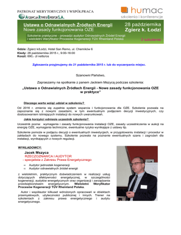 PATRONAT MERYTORYCZNY I WSPÓŁPRACA Gdzie: Zgierz k/Łodzi, Hotel San Remo, ul. Chemików 6 Kiedy: 28 października 2015 r., 9:00-16:00 Koszt: 690,- zł netto/os Zgłoszenia przyjmujemy do 21 października 2015 r. lub do wyczerpania miejsc. Szanowni Państwo, Zapraszamy na spotkanie z panem Jackiem Mszycą podczas szkolenia: „Ustawa o Odnawialnych Źródłach Energii - Nowe zasady funkcjonowania OZE w praktyce” Dlaczego warto wziąć udział w szkoleniu? Od 2016 r. zmienia się zupełnie system wsparcia i funkcjonowania dla OZE. Szkolenie pozwala na zapoznanie się z nowymi zasadami, w tym ewentualnym podjęciem decyzji inwestycyjnych, czy dostosowaniem istniejących instalacji do nowych uwarunkowań. Jakie korzyści odniesie uczestnik szkolenia? Uczestnik pozna: wymagania i zasady funkcjonowania instalacji OZE, zasady uczestniczenia w aukcji na energię OZE, wymagania techniczne, ewentualne ryzyka wynikające z ustawy itp. Szkolenie pomoże w podjęciu decyzji o ewentualnych inwestycjach, w przygotowaniu instalacji i procedur w zakładach do nowego systemu. Szkolenie pozwala na poznanie ewentualnych szans i zagrożeń dla instalacji, wynikających z nowych regulacji. WYKŁADOWCY: Jacek Mszyca RZECZOZNAWCA I AUDYTOR - specjalista z Zakresu Prawa Energetycznego • • Audytor jednostek kogeneracji Audytor odnawialnych źródeł energii z wieloletnim, praktycznym doświadczeniem w realizacji usług dotyczących efektywności energetycznej, w szczególności kogeneracji, audytów energetycznych oraz organizacji i zarządzania przedsiębiorstwem energetycznym. Wieloletni Weryfikator Procesów Kogeneracji TÜV Rheinland Polska. Autor i współautor kilkuset wdrożonych opracowań w obiektach przemysłowych, użyteczności publicznej i innych. Trener na szkoleniach z zakresu prawa energetycznego i audytu energetycznego. PATRONAT: Szkolenie przeznaczone jest dla: • Osób zajmujących się zarządzaniem gospodarką energetyczną w zakładach przemysłowych, w tym energetycznych i ciepłowniczych • Osób zarządzających już istniejącymi instalacjami OZE • Wszystkich, którzy planują i biorą pod uwagę inwestycje w odnawialne źródła energii (OZE) Dla przedsiębiorstw wytwarzających i sprzedających energię elektryczną oraz ciepło odbiorcom końcowym, oraz przemysłowych odbiorców energii, ciepła, właścicieli instalacji OZE i wszystkich zainteresowanych prezentowaną tematyką. PROGRAM RAMOWY: Część I Wykład szkoleniowy 1. Wybrane pojęcia wprowadzone ustawą o OZE nowe pojęcia wprowadzone w ustawie zmiany w zakresie dotychczasowych definicji oraz ich konsekwencje 2. Nowe zasady wsparcia instalacji OZE wsparcie wytwarzania energii w mikroinstalacjach wsparcie wytwarzania energii w instalacjach innych niż mikroinstalacje skutki modernizacji instalacji 3. Zasady funkcjonowania systemy aukcyjnego warunki przystąpienia do aukcji procedura oceny formalnej instalacji przystępujących do aukcji ceny referencyjne i sposób ich określania tryb i zasady przeprowadzenia aukcji procedury po rozstrzygnięciu aukcji, procedura weryfikacji ofert 4. Zmiany w dotychczasowym systemie wsparcia w OZE mechanizmy zapobiegające nadpodaży świadectw pochodzenia nowe warunki obowiązku wytwarzania i zakupu energii elektrycznej z OZE zmiany dotyczące świadectwa pochodzenia energii z OZE wymagania pomiarowe 5. Istniejące instalacje OZE w nowym systemie rodzaje istniejących instalacji podlegających wsparciu w nowym systemie zasady przejścia z systemu certyfikatów do systemu aukcyjnego modernizacja instalacji a uczestnictwo w systemie wsparcia 6. Zmiany w ustawie – Prawo energetyczne Część II Dyskusja i omówienie typowych problemów właścicieli i użytkowników instalacji na podstawie ankiet Uczestników szkolenia. Ankiety wysyłamy po otrzymaniu zgłoszenia. - Konsultacje indywidualne Część III Zakończenie - sprawdzenie wiedzy - wręczenie certyfikatów - lunch W przerwach między wykładami Uczestnicy będą mogli skorzystać z przerw kawowych. CENA OBEJMUJE: uczestnictwo w szkoleniu, materiały szkoleniowe, przerwy kawowe, lunch, imienny certyfikat uczestnictwa. Szkolenie Techniczne: „Ustawa o Odnawialnych Źródłach Energii - Nowe zasady funkcjonowania OZE-” PARTNER MERYTORYCZNY: ________________________________________________________________________________________________________________________________________________ Gdzie: Zgierz k/Łodzi, Hotel San Remo, ul. Chemików 6 Kiedy: 28 października 2015 r., 9:00-16:00 Koszt: 690,- zł netto/os Zgłoszenia przyjmujemy do 21 października 2015 r. lub do wyczerpania miejsc. ■ Zgłaszam udział przedstawicieli Firmy: NAZWA FIRMY /do faktury/:.............................................................................................................................. adres:................................................................................................................................................................. telefon:................................................................................NIP:....................................................................... 1. IMIĘ I NAZWISKO:........................................................................................................................ . stanowisko:........................................................................................................................................ telefon:....................................................... e-mail:.......................................................................... 2. IMIĘ I NAZWISKO:........................................................................................................................ . stanowisko:........................................................................................................................................ telefon:....................................................... e-mail:....................................