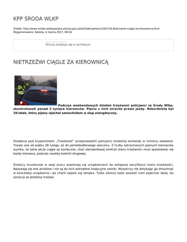 KPP ŚRODA WLKP Źródło: http://www.sroda-wielkopolska.policja.gov.pl/w25/aktualnosci/162135,Nietrzezwi-ciagle-za-kierownica.html Wygenerowano: Sobota, 4 marca 2017, 08:54 Strona znajduje się w archiwum. NIETRZEŹWI CIĄGLE ZA KIEROWNICĄ Podczas weekendowych działań trzeźwość policjanci ze Środy Wlkp. skontrolowali ponad 3 tysiące kierowców. Pięciu z nich straciło prawo jazdy. Rekordzistą był 29-latek, który pijany wjechał samochodem w słup energetyczny. Działania pod kryptonimem „Trzeźwość” przeprowadzili policjanci średzkiej komendy w miniony weekend. Trwały one od piątku 28 lutego, aż do poniedziałkowego wieczoru. Z liczby zatrzymanych pijanych kierowców wynika, że takie akcje ciągle są konieczne, choć standardowej kontroli stanu trzeźwości musi spodziewać się każdy kierowca, podczas zwykłej kontroli drogowej. Średzcy mundurowi w swej pracy wspierają się urządzeniami do wstępnej weryfikacji stanu trzeźwości. Nazywają się one alcoblow i nie są do nich potrzebne tradycyjne ustniki. Wystarczy nie dotykając go dmuchnąć w końcówkę urządzenia i po chwili zapala się lampka. Tylko zielony kolor pozwoli nam pojechać dalej, bo oznacza że jesteśmy trzeźwi. Dzięki możliwości bardzo szybkiego testowania kierowców policjanci przeprowadzić mogą w krótkim czasie ogromną liczbę sprawdzeń. Tak na przykład w piątek 28 lutego czternastu funkcjonariuszy sprawdziło stan trzeźwości blisko 2,5 tys. kierowców. Podczas działań pięciokrotnie zapaliła się lampka żółta bądź czerwona, bo kierowcy znajdowali się pod działaniem alkoholu. I tak rankiem 28 lutego około godziny 6.20 na ulicy Kórnickiej zatrzymany został kierowca skody fabia. W organizmie 53-lata było 0,38 promila alkoholu. Funkcjonariusze ruchu drogowego wykonali ze sprawcą wykroczenia czynności. Sprawa znajdzie swój finał w sądzie. Dzień później 1 marca około godz. 10.00 na ulicy Kilińskiego w Środzie policjanci zatrzymali 22-letniego kierującego pojazdem m-ki seat ibiza, który prowadził pojazd mając w organizmie 0,26 promila alkoholu. Kolejny dzień pozwolił wyeliminować z ruchu kolejnego pijanego kierowcę. Poza czynnościami wynikającymi z popełnionego przestępstwa tj. kierowania pojazdem w stanie nietrzeźwości policjanci musieli obsłużyć zdarzenie drogowe, które spowodował 29-letni kierowca. Mężczyzna prowadząc volkswagena passata uderzył w słup energetyczny. W organizmie miał dwa promile alkoholu. Akcję zakończyło zatrzymanie w poniedziałkowy poranek dwóch kierowców, którzy jechali na kacu. 3 marca o g. 7.10 w Chłapowie policjanci zatrzymali 38-letniego kierowcę audi. Mężczyzna prowadził pojazd mając w orgazmie 0,26 promila alkoholu. 30 minut później w tym samym miejscu urządzenie do badania stanu trzeźwości wykazało 0,72 promila alkoholu w organizmie kierowcy forda ka. 42-letni mieszkaniec powiatu wrzesińskiego stracił prawo jazdy a za popełnione przestępstwo odpowie przed sądem. Ocena: 0/5 (0) Tweetnij