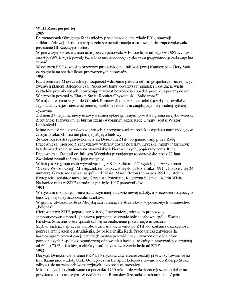 W III Rzeczpospolitej 1989 Po rozmowach Okrągłego Stołu między przedstawicielami władz PRL, opozycji solidarnościowej i kościoła rozpoczęła się transformacja ustrojowa, która zapoczątkowała powstanie III Rzeczypospolitej. W pierwszym okresie zmian ustrojowych panowała w Polsce hiperinflacja (w 1989 wyniosła ona +639,6%), występowały też olbrzymie niedobory rynkowe, a gospodarce groziła zupełna zapaść. W czerwcu PKP zawiesiło przewozy pasażerskie na linii kolejowej Kamieniec – Złoty Stok ze względu na spadek ilości przewożonych pasażerów. 1990 Rząd premiera Mazowieckiego rozpoczął wdrażanie pakietu reform gospodarczo-ustrojowych zwanych planem Balcerowicza. Procesowi temu towarzyszył upadek i likwidacja wielu zakładów produkcyjnych, powodujący wzrost bezrobocia i spadek produkcji przemysłowej. W styczniu powstał w Złotym Stoku Komitet Obywatelski „Solidarność”. W maju powołano w gminie Ośrodek Pomocy Społecznej, zatrudniający 4 pracowników. Jego zadaniem jest niesienie pomocy osobom i rodzinom znajdującym się trudnej sytuacji życiowej. Z dniem 27 maja, na mocy ustawy o samorządzie gminnym, powstała gmina miejsko-wiejska Złoty Stok. Pierwszym jej burmistrzem (wybranym przez Radę Gminy) został Wiktor Lubieniecki. Mimo poniesienia kosztów związanych z przygotowaniem projektu wyciągu narciarskiego w Złotym Stoku, Gmina nie planuje już jego budowy. 26 czerwca rozstrzygnięto konkurs na Dyrektora ZTiF, zorganizowany przez Radę Pracowniczą. Spośród 5 kandydatów wybrany został Zdzisław Kryczka, młody informatyk bez doświadczenia w pracy na stanowiskach kierowniczych, popierany przez Radę Pracowniczą. Zastąpił on Juliusza Woźniaka piastującego to stanowisko przez 22 lata. Zwolnieni zostali też trzej jego zastępcy. W listopadzie grupa osób wywodząca się z KO „Solidarność” wydała pierwszy numer "Gazety Złotostockiej". Miesięcznik ten ukazywał się do października 1992 r. (ukazały się 24 numery). Gazetę redagował zespół w składzie: Marek Boroń (do marca 1991 r.), Adam Konopacki (redaktor naczelny), Czesława Potemkin, Katarzyna Silarska i Maria Wisła. Na koniec roku w ZTiF zatrudnionych było 1007 pracowników. 1991 W styczniu rozpoczęto prace na zatrzymanej budowie nowej szkoły, a w czerwcu rozpoczęto budowę miejskiej oczyszczalni ścieków. W gminie utworzono Straż Miejską zatrudniającą 2 strażników wyposażonych w samochód „Polonez”. Kierownictwo ZTiF, poparte przez Radę Pracowniczą, odrzuciło propozycję sprywatyzowania przedsiębiorstwa poprzez utworzenie jednoosobowej spółki Skarbu Państwa. Stracono w ten sposób szansę na znalezienie prywatnego inwestora. Szybko malejąca sprzedaż wyrobów zmusiła kierownictwo ZTiF do szukania oszczędności, poprzez zmniejszenie zatrudnienia. 24 października Rada Pracownicza zatwierdziła harmonogram prywatyzacji przedsiębiorstwa przewidujący utworzenie z oddziałów pomocniczych 8 spółek z ograniczoną odpowiedzialnością, w których pracownicy otrzymają od 60 do 70 % udziałów, a obiekty produkcyjne dzierżawić będą od ZTiF. 1992 Decyzją Dyrekcji Generalnej PKP z 15 stycznia zawieszone zostały przewozy towarowe na linii Kamieniec – Złoty Stok. Od tego czasu transport kolejowy towarów do Złotego Stoku odbywa się na zasadach komercyjnych jako obsługa bocznicy. Miasto sprzedało zbudowane na początku 1990 roku i nie wykończone jeszcze obiekty na przystanku autobusowym. W części z nich Bronisław Szczucki uruchomił bar „Apetit” czynny całą dobę. Na wniosek burmistrza Rada Miasta podjęła decyzję o przeniesieniu żłobka do przedszkola i sprzedanie jego dotychczasowego budynku osobie prywatnej. Do końca czerwca utworzono w ZTiF spółki: „Stokpol” (budowlana). „Jard” (transportowa), „Ekskol” (ekspedycji towarów), „Akord” (stołówka i Dom Kultury), „Umewar” (w-t remontowy w Złotym Stoku), „Remoplast” (w-t remontowy w Mąkolnie), „Elektryk” (w-t elektryczny w Złotym Stoku) i „Elektromat” (w-t elektryczny w Mąkolnie). W wyniku tej reorganizacji zwolniono w zakładzie 320 pracowników, z których tylko 194 znalazło pracę w utworzonych spółkach. Pod kierownictwem Agaty Pawłowskiej-Król połączono szkoły podstawowe Nr 1 i Nr 2 w Złotym Stoku. W czerwcu Rada Pracownicza i Ogólne Zebranie Delegatów Załogi ZTiF akceptuje wniosek kierownictwa zakładu, do Ministerstwa Przemysłu i Handlu, o likwidacje przedsiębiorstwa państwowego i oddanie go w odpłatne użytkowanie spółce kapitałowej, którą utworzą jego pracownicy. We wniosku proponowano pozostawienie istniejącego zarządu. Deklarację zakupu akcji złożyło 82,8 % załogi. Realizację tego wniosku zablokowała Komisja Zakładowa NSZZ „Solidarność”, podejmując uchwałę promującą prywatyzacje ZTiF poprzez utworzenie jednoosobowej spółki Skarbu Państwa. Pożar lasu na górze Jawornik doprowadził do wieloletniego ogołocenia z drzew jej szczytu. 1993 Lucyna Kowalska wydzierżawiła dotychczasowy budynek przedszkola urządzając w nim prywatne przedszkole "Bajka" dotowane z budżetu Gminy. Po wykończeniu dwóch głównych segmentów nowej szkoły (budowanej od 1988 roku) przeniesiono do niej uczniów ze szkół podstawowych nr 1 i 2. Józef Gieniec w byłej remizie strażackiej uruchomił zakład "PETERS ELEKTRONIK". produkujący moduły urządzeń elektronicznych. Grzegorz Jędrkowiak w dawnym magazynie ZTiF uruchomił Zakład Krawiecki "AGATOM" produkujący odzież na eksport. Przedsiębiorstwo Gospodarki Komunalnej i Mieszkaniowej przekształcono Uchwałą Rady Miejskiej w spółki: „KOMA” (gospodarka mieszkaniowa i oczyszczanie miasta) i "WODKAN” (eksploatacja wodociągów i kanalizacji). W ZTiF utworzono kolejną spółkę zależną (100% udziałów) o nazwie „Złoty Granitol”, wyposażoną w urządzenia do produkcji folii dzierżawione od firmy „Granitol” z Czech. 199