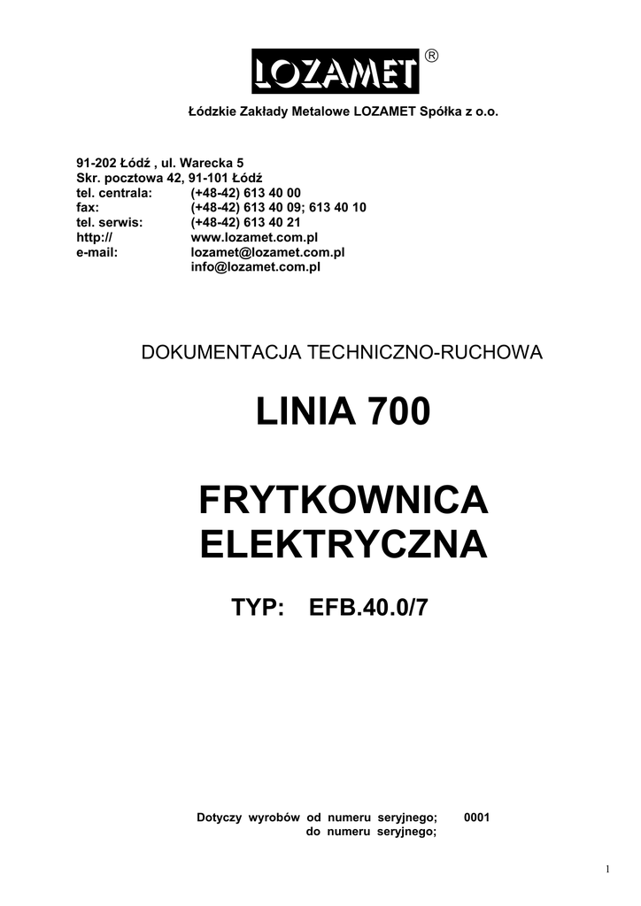LOZAMEt Łódzkie Zakłady Metalowe LOZAMET Spółka z o.o. 91-202 Łódź , ul. Warecka 5 Skr. pocztowa 42, 91-101 Łódź tel. centrala: (+48-42) 613 40 00 fax: (+48-42) 613 40 09; 613 40 10 tel. serwis: (+48-42) 613 40 21 http:// www.lozamet.com.pl e-mail: [email protected] [email protected] DOKUMENTACJA TECHNICZNO-RUCHOWA LINIA 700 FRYTKOWNICA ELEKTRYCZNA TYP: EFB.40.0/7 Dotyczy wyrobów od numeru seryjnego; do numeru seryjnego; 0001 1 SPIS TREŚCI Strona 1 CHARAKTERYSTYKA ...................................................................................................................3 1.1 1.2 1.3 2 ZASTOSOWANIE ..........................................................................................................................3 CHARAKTERYSTYKA TECHNICZNA ................................................................................................3 OGÓLNY OPIS .............................................................................................................................3 INSTRUKCJA MONTAŻU...............................................................................................................4 2.1 USTAWIENIE ...............................................................................................................................4 2.2 PRZYŁĄCZENIE DO INSTALACJI .....................................................................................................4 2.1.1 Wentylacja ..........................................................................................................................4 2.1.2 Przyłączenie do instalacji elektrycznej ...............................................................................4 3 INSTRUKCJA OBSŁUGI ................................................................................................................5 3.1 PRZYGOTOWANIE FRYTKOWNICY DO PRACY .................................................................................5 3.2 PRÓBNY ROZRUCH ......................................................................................................................6 3.3 CZYNNOŚCI PODCZAS PRACY ......................................................................................................6 3.3.1 Włączenie frytkownicy ........................................................................................................6 3.2.2 Czynności podczas smażenia ............................................................................................6 3.2.3 Odprowadzanie oleju (frytury) ze zbiornika ........................................................................7 3.4 CZYNNOŚCI PO ZAKOŃCZENIU PRACY ..........................................................................................7 3.5 UWAGI EKSPLOATACYJNE ............................................................................................................8 4 WSKAZANIA BEZPIECZEŃSTWA I HIGIENY PRACY .................................................................9 5 INSTRUKCJA KONSERWACJI I NAPRAWY ..............................................................................10 5.1 5.2 5.3 5.4 KONSERWACJA BIEŻĄCA............................................................................................................10 KONSERWACJA OKRESOWA .......................................................................................................10 NAPRAWY I REMONTY ................................................................................................................10 WYKAZ TYPOWYCH USZKODZEŃ I ZALECANE SPOSOBY NAPRAWY ................................................10 6 WYPOSAŻENIE STANDARDOWE I DODATKOWE ...................................................................11 7 WYKAZ CZĘŚCI ZAMIENNYCH ..................................................................................................11 8 RYSUNKI I SCHEMATY ELEKTRYCZNE....................................................................................12 2 1 CHARAKTERYSTYKA 1.1 Zastosowanie Frytkownica jest urządzeniem elektrycznym przeznaczonym do zanurzeniowego smażenia w oleju spożywczym (fryturze) frytek, ziemniaków na frytki lub innych produktów takich jak ryby, mięso czy warzywa. Urządzenia te przeznaczone są do eksploatacji w zakładach zbiorowego żywienia. 1.2 Charakterystyka techniczna Typ, wersja, odmiana EFB.40.0/7 DANE TECHNICZNE Wymiary gabarytowe [mm] Całkowita moc znamionowa [kW] Ilość elementów grzewczych [szt] Zasilanie Zakres regulacji temperatury [°C] Czas nagrzewania 190°C [min] Obciążenie cieplne elementów grzejnych [W/cm2] Ilość zbiorników [szt] Wymiary zbiornika [mm] Maksymalna ilość oleju [dm3] Objętość użytkowa oleju* [dm3] Standardowo szt.2 [mm] Kosze Wsad jednostkowy Zabezpieczenie Masa [kg] [A] [kg] szerokość 400 x głębokość 700 x wysokość x 270/430 2 x 3,0 = 6,0 2 400 V 3N AC 50 Hz 100 ÷ 190 22 3,47 2 125 x 340 x 170 2 x 4,8 2 x 2,6 95 x 270 x 110 2 x 0,85 16 22 * objętość użytkowa oleju jest to ilość oleju (frytury), która znajduje się w zbiorniku frytkownicy pomiędzy górną powierzchnią elementów grzejnych a znakiem maksymalnego poziomu oleju. 1.3 Ogólny opis Frytkownice elektryczne wykonane są jako moduły górne linii 700 przeznaczone do ustawienia na module dolnym linii np. szafce, lub jako urządzenia wolnostojące ustawione bezpośrednio na stole roboczym. Do ważniejszych zespołów należą: - - Obudowa wykonana ze stali nierdzewnej. Płyta górna wykonana ze stali kwasoodpornej posiada dwa zbiorniki na olej (fryturę) z możliwością niezależnego sterowania pracą każdego z nich. Układ grzewczy zbiornika składa się z zespołu grzałek o łącznej mocy 3kW. Pracą grzałek steruje regulator temperatury zapewniający regulację temperatury frytury. Przed nadmiernym wzrostem temperatury np. przy awarii regulatora temperatury urządzenie i układ grzewczy zabezpiecza ogranicznik temperatury. Frytkownice dwuzbiornikowe posiadają dwa niezależne ukła