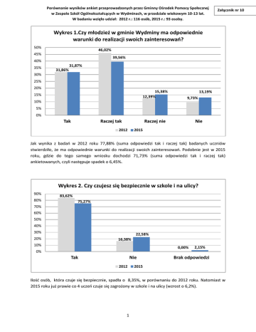 Porównanie wyników ankiet przeprowadzonych przez Gminny Ośrodek Pomocy Społecznej w Zespole Szkół Ogólnokształcących w Wydminach, w przedziale wiekowym 10-13 lat. W badaniu wzięło udział: 2012 r.: 116 osób, 2015 r.: 93 osoby. Załącznik nr 10 Wykres 1.Czy młodzież w gminie Wydminy ma odpowiednie warunki do realizacji swoich zainteresowań? 50% 46,02% 45% 39,56% 40% 35% 31,87% 31,86% 30% 25% 20% 15,38% 12,39% 15% 10% 13,19% 9,73% 5% 0% Tak Raczej tak Raczej nie 2012 Nie 2015 Jak wynika z badań w 2012 roku 77,88% (suma odpowiedzi tak i raczej tak) badanych uczniów stwierdziło, że ma odpowiednie warunki do realizacji swoich zainteresowań. Podobnie jest w 2015 roku, gdzie do tego samego wniosku dochodzi 71,73% (suma odpowiedzi tak i raczej tak) ankietowanych, czyli następuje spadek o 6,45%. Wykres 2. Czy czujesz się bezpiecznie w szkole i na ulicy? 90% 80% 83,62% 75,27% 70% 60% 50% 40% 30% 22,58% 20% 16,38% 10% 0,00% 2,15% 0% Tak Nie 2012 Brak odpowiedzi 2015 Ilość osób, która czuje się bezpiecznie, spadła o 8,35%, w porównaniu do 2012 roku. Natomiast w 2015 roku już prawie co 4 uczeń czuje się zagrożony w szkole i na ulicy (wzrost o 6,2%). 1 Porównanie wyników ankiet przeprowadzonych przez Gminny Ośrodek Pomocy Społecznej w Zespole Szkół Ogólnokształcących w Wydminach, w przedziale wiekowym 10-13 lat. W badaniu wzięło udział: 2012 r.: 116 osób, 2015 r.: 93 osoby. Załącznik nr 10 Wykres 3. Miejsca, w których młodzież czuje się zagrożona 45% 40,00% 40,00% 40% 35% 30% 31,43% 25,00% 25% 20,00% 20% 15,00% 15% 10,00% 5,71% 10% 10,00% 5% 2,86% 0% szkoła w trakcie zajęć w godzinach kiedy uczestniczę w do godziny 15.00 popołudniowych, na dyskotekach czy ulicy innych imprezach późno popołudniowych organizowanych przez szkołę 2012 w domu w czasie wolnym od zajęć, kiedy jestem sam/a 2015 Liczba udzielonych odpowiedzi w 2012 r.: 20 Liczba udzielonych odpowiedzi w 2015 r.: 35 W porównaniu do 2012 roku, spośród ilości udzielonych odpowiedzi (wykres nr 2 wzrost odpowiedzi „NIE” z 16,38% na 22,58%) znacząco zwiększyło się poczucie niebezpieczeństwa w szkole, podczas zajęć lekcyjnych o 15%. Również więcej o 16,43% osób czuje się zagrożonych w godzinach popołudniowych, na ulicy. Natomiast zmniejszyło się poczucie zagrożenia podczas dyskotek i innych imprez późno popołudniowych organizowanych przez szkołę o 4,29%. Dzieci również czują się bezpieczniej w domu o 7,14% oraz kiedy przebywają same o 20%. Wykres 4.Relacja młodzieży z rodzicami 70% 60,00% 54,17% 60% 50% 34,78% 28,47% 40% 30% 20% 10% 0% 8,33% 0,87% nie rozumieją mnie 4,17% 1,74% 4,86% 2,61% nie mają dla mnie często się kłócimy dużo czasu rozmawiamy ze sobą 2012 Liczba udzielonych odpowiedzi w 2012 r.: 144 są dla mnie autorytetem 2015 Liczba udzielonych odpowiedzi w 2015 r.: 115 Jak wynika z analizy danych, uczniowie mają dobre relacje ze swoimi rodzicami. W porównaniu do 2012 roku, według liczby udzielonych odpowiedzi, wzrósł o 5,83% odsetek osób, który deklaruje, że dużo rozmawia ze swoimi rodzicami. Nastąpił również wzrost o 6,31% uczniów, dla których rodzice są autorytetem. Coraz mniej (o 2,25%) młodzieży kłóci się ze swoimi rodzicami. Następuje spadek liczby uczniów o 7,46%, który spotyka się z niezrozumieniem. Również (o 2,43%) występuje mniej odpowiedzi twierdzących, że rodzice nie mają dla nich czasu. 2 Porównanie wyników ankiet przeprowadzonych przez Gminny Ośrodek Pomocy Społecznej w Zespole Szkół Ogólnokształcących w Wydminach, w przedziale wiekowym 10-13 lat. W badaniu wzięło udział: 2012 r.: 116 osób, 2015 r.: 93 osoby. Załącznik nr 10 Wykres 5.Czy masz z kim porozmawiać o swoich problemach? 100% 87,93% 91,40% 80% 60% 40% 20% 9,48% 2,59% 7,53% 1,08% 0% Tak Nie 2012 Brak odpowiedzi 2015 Większość uczniów ma z kim porozmawiać o swoich problemach. W porównaniu z 2012 rokiem wzrosła nieznacznie liczba osób o 3,47%, która rozmawia o swoich zmartwieniach z bliskimi. Adekwatnie spadł odsetek osób o 1,95%, którzy sami muszą sobie radzić ze swoimi kłopotami. Wykres 6.Czy rodzice znają Twoje problemy? 100% 80% 82,76% 84,95% 60% 40% 17,24% 20% 15,05% 0% Tak Nie 2012 2015 Dzieci i młodzież chętnie rozmawiają ze swoimi rodzicami, więc znają oni problemy swojego potomstwa. W nawiązaniu do 2012 roku minimalnie wzrosła o 2,19% liczba uczniów stwierdzających, że rodzice znają ich problemy. Natomiast o 2,19% spadł odsetek dzieci, twierdzących brak znajomości problemów przez dorosłych. 3 Porównanie wyników ankiet przeprowadzonych przez Gminny Ośrodek Pomocy Społecznej w Zespole Szkół Ogólnokształcących w Wydminach, w przedziale wiekowym 10-13 lat. W badaniu wzięło udział: 2012 r.: 116 osób, 2015 r.: 93 osoby. 35% Wykres 7. Osoby, z którymi młodzież rozmawia o swoich 37,31% problemach 33,48% 30% 24,89% 25% 19,23% 20% 20,81% 13,85% 15% 10,86% 8,08% 10% 5,38% 4,52% 3,62% 3,08% 5% 11,92% 0,00% Liczba udzielonych odpowiedzi w 2012 r.: 260 z pracownikiem Gminnego Ośrodka Pomocy Społecznej w Wydminach z rodzeństwem (bratem, siostrą) 2015 z przyjaciółmi/ kolegami/koleżankami z pedagogiem szkolnym 2012 z wychwowawcą z dziadkami z nauczycielami z rodzicami 0% 1,81% 1,15% z innymi osobami 40% Załącznik nr 10 Liczba udzielonych odpowiedzi w 2015 r.: 221 W porównaniu z 2012 rokiem młodzież nadal chętnie zwierza się rodzicom (spadek o 3,83%). Coraz częściej rozmawia z przyjaciółmi/ kolegami/ koleżankami ( wzrost o 5,66%), z rodzeństwem (wzrost o 8,89%), z dziadkami (wzrost o 2,78%), z nauczycielami (wzrost o 0,54%). Uczniowie przestają całkowicie rozmawiać z pedagogiem szkolnym (spadek z 13,85% w 2012 r. do 0% w 2015 r.) Ankietowani nie rozmawiają w ogóle o swoich problemach z pracownikami Gminnego Ośrodka Pomocy Społecznej w Wydminach. Wykres 8.Odsetek osób, które uważa, że dzieci są zdane tylko na siebie i nikt sie nimi nie opiekuje 