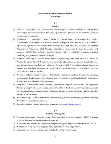 Regulamin promocji dla konsumentów „Promocja” §1 Definicje 1) Promocja – promocja dla konsumentów dokonujących zakupu Tabletów i Smartphonów oznaczonych znakiem towarowym Samsung, organizowana i prowadzona na zasadach opisanych w niniejszym regulaminie. 2) Organizator - Audioteka Poland spółka z ograniczoną odpowiedzialnością (dalej: „Zleceniodawca”) z siedzibą w Warszawie, przy ul. Postępu 18 (bud. Neptun), 02-676 Warszawa, wpisaną do rejestru przedsiębiorców prowadzonego przez Sąd Rejonowy dla miasta stołecznego Warszawy w Warszawie, XIII Wydział Gospodarczy Krajowego Rejestru Sądowego, pod numerem 0000305704, REGON 14143845400000, NIP 5213489157, posiadającą kapitał zakładowy w wysokości 1 855 000,00 złotych. 3) Fundator - Samsung Electronics Polska spółka z ograniczoną odpowiedzialnością z siedzibą w Warszawie, adres: 02-674 Warszawa, ul. Marynarska 15, wpisana do rejestru przedsiębiorców prowadzonego przez Sąd Rejonowy dla m. st. Warszawy, XIII Wydział Gospodarczy Krajowego Rejestru Sądowego pod numerem KRS 0000128080, kapitał zakładowy 52.759.500 zł, NIP 52610-44-039, REGON 011612810. 4) Produkt – wybrane modele Tabletów i Smartfonów oznaczone znakiem towarowym Samsung, wprowadzane do obrotu przez Organizatora na terytorium Rzeczpospolitej Polskiej i wymienione w załączniku nr 1 do niniejszego regulaminu. 5) Uczestnik – pełnoletnia osoba fizyczna, posiadająca miejsce zamieszkania na terytorium Rzeczpospolitej Polskiej, dokonująca zakupu Produktu w Punkcie handlowym, która zapoznała się z treścią niniejszego regulaminu i zaakceptowała jego postanowienia oraz spełniła wszystkie warunki w nim określone. 6) Punkt handlowy – sklep na terytorium Rzeczpospolitej Polskiej prowadzący sprzedaż detaliczną Produktów, w tym sklep internetowy. 7) Strona internetowa – strona internetowa o adresie: www.czytelnia.samsung.pl §2 Postanowienia ogólne 1) Promocja prowadzona jest na terytorium Rzeczpospolitej w okresie od dnia 01.02.2015 do dnia 31.07.2015 (termin zakupu Produktu w Promocji). 2) W stosunku do Uczestników Organizator jest przyrzekającym nagrodę w rozumieniu art. 919 kc. 3) Promocja nie łączy się z innymi promocjami ogłaszanymi przez Organizatora. 4) Organizator ma prawo do zmiany listy audiobooków objętych promocją. 1 5) Organizator zwraca uwagę, że w celu skorzystania z promocji może zachodzić konieczność nawiązania połączenia przez Produkt z siecią telekomunikacyjną oraz może dojść do transmisji danych, za które może zostać pobrana opłata zgodnie z cennikiem dostawcy usług telekomunikacyjnych. §3 Zasady przystąpienia do Promocji 1) W okresie trwania promocji posiadaczom wybranych produktów (załącznik) przysługiwać będzie nagroda w postaci sześciu audiobooków o łącznej wartości do 200 zł.brutto (słownie: dwustu złotych brutto). 2) Każdego z miesiąca uczestnik może pobrać jeden audiobook ze specjalnie przygotowanej puli o nazwie KOLEKCJA SAMSUNG. 3) Niepobranie audiobooka w danym miesiącu powoduje utratę prawa do jego wykorzystania, prawo to nie podlega przywróceniu. 4) Wartość świadczenia jest zwolniona z podatku dochodowego od osób fizycznych na podstawie art. 21 ust. 1 pkt 68a ustawy z dnia 26 lipca 1991 r. o podatku dochodowym od osób fizycznych (t.j. Dz. U. z 2010 r., Nr 51, poz. 307). 5) Celem uzyskania nagrody Uczestnik powinien: 1) Być posiadaczem wybranego produktu (lista w załączniku) 2) Pobrać aplikację Audioteka ze sklepu GALAXY Apps 3) Wejść w zakładkę KOLEKCJA SAMSUNG 4) Wybrać miesięcznie jeden audiobook z KOLEKCJI SAMSUNG 6) Organizator nie przewiduje możliwości zamiany nagród w Promocji na ich ekwiwalent pieniężny lub na inne nagrody. §5 Reklamacje 1) Wszelkie reklamacje powinny być przesyłane w okresie trwania Promocji pocztą na adres Organizatora: Audioteka Poland Sp. z o.o., ul. Postępu 18 (budynek Neptun), 02-672 Warszawa, z dopiskiem „Promocja Audioteka w Samsung – reklamacja”, lub pocztą elektroniczną na adres: [email protected]. Organizator może zwrócić się do Uczestnika o podanie następujących danych: imię, nazwisko, adres korespondencyjny oraz poprosić o opis okoliczności stanowiących podstawę reklamacji. 2) Złożone reklamacje rozpatrywane będą w terminie 14 dni roboczych od daty otrzymania reklamacji. Zainteresowani zostaną powiadomieni o sposobie rozpatrzenia reklamacji w formie odpowiadającej formie, w jakiej została złożona reklamacja, niezwłocznie po jej rozpatrzeniu. §6 2 Postanowienia końcowe 1) Pełna treść niniejszego Regulaminu będzie dostępna na Stronie internetowej. Podstawowe informacje o Promocji i jej zasadach zawarte będą w materiałach promocyjnych rozpowszechnianych przez Organizatora w związku z Promocją. 2) W przypadku korespondencji o dotrzymaniu terminu decyduje data nadania, chyba że inaczej zastrzeżono w treści niniejszego Regulaminu. 3) W sprawach nieuregulowanych niniejszym Regulaminem zastosowanie znajdują powszechnie obowiązujące przepisy prawa. 3 Załącznik nr 1 – modele biorące udział w promocji Smartfony: GALAXY Ace 2, GALAXY S3 mini, GALAXY S3 mini VE, GALAXY Core, GALAXY S, GALAXY S Plus, GALAXY Grand Neo, GALAXY Grand Neo Plus, GALAXY Grand, GALAXY S2, GALAXY S2 Plus, GALAXY S4 mini, GALAXY Nexus, GALAXY S4 Active, GALAXY S3, GALAXY S3 Neo, GALAXY S3 LTE, GALAXY S4, GALAXY Note 2, GALAXY Young, GALAXY Ace 3, GALAXY Trend Lite, GALAXY Trend, GALAXY S Duos, GALAXY Trend Plus, GALAXY, Xcover 2, GALAXY A3, GALAXY A5, GALAXY K zoom, GALAXY Pocket 2, GALAXY Trend 2, GALAXY Core Plus, GALAXY Core 2, GALAXY Ace 4, GALAXY Core Prime, GALAXY Core LTE, GALAXY Grand Prime, GALAXY Grand 2, GALAXY S5 mini, GALAXY Alpha, GALAXY S5 Active, GALAXY S5, GALAXY Note 3 Neo, GALAXY Note 3, GALAXY Note 4, GALAXY Note Edge, Tablety: GALAXY Tab S 10.5, GALAXY Tab S 8.4, GALAXY Tab 4 7.0, GALAXY Tab 4 10.1, GALAXY Tab 4 7.0, GALAXY Tab, Active 8.0, G