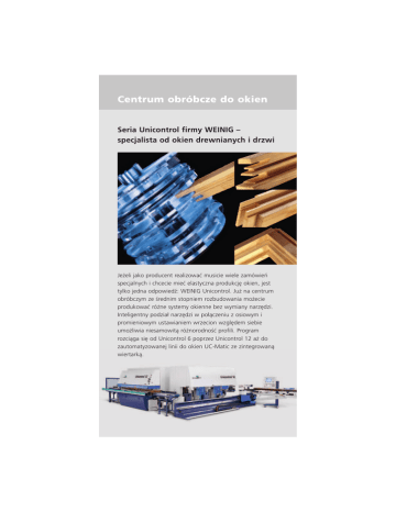 Centrum obróbcze do okien Seria Unicontrol firmy WEINIG – specjalista od okien drewnianych i drzwi Jeżeli jako producent realizować musicie wiele zamówień specjalnych i chcecie mieć elastyczna produkcję okien, jest tylko jedna odpowiedź: WEINIG Unicontrol. Już na centrum obróbczym ze średnim stopniem rozbudowania możecie produkować różne systemy okienne bez wymiany narzędzi. Inteligentny podział narzędzi w połączeniu z osiowym i promieniowym ustawianiem wrzecion względem siebie umożliwia niesamowitą różnorodność profili. Program rozciąga się od Unicontrol 6 poprzez Unicontrol 12 aż do zautomatyzowanej linii do okien UC-Matic ze zintegrowaną wiertarką.