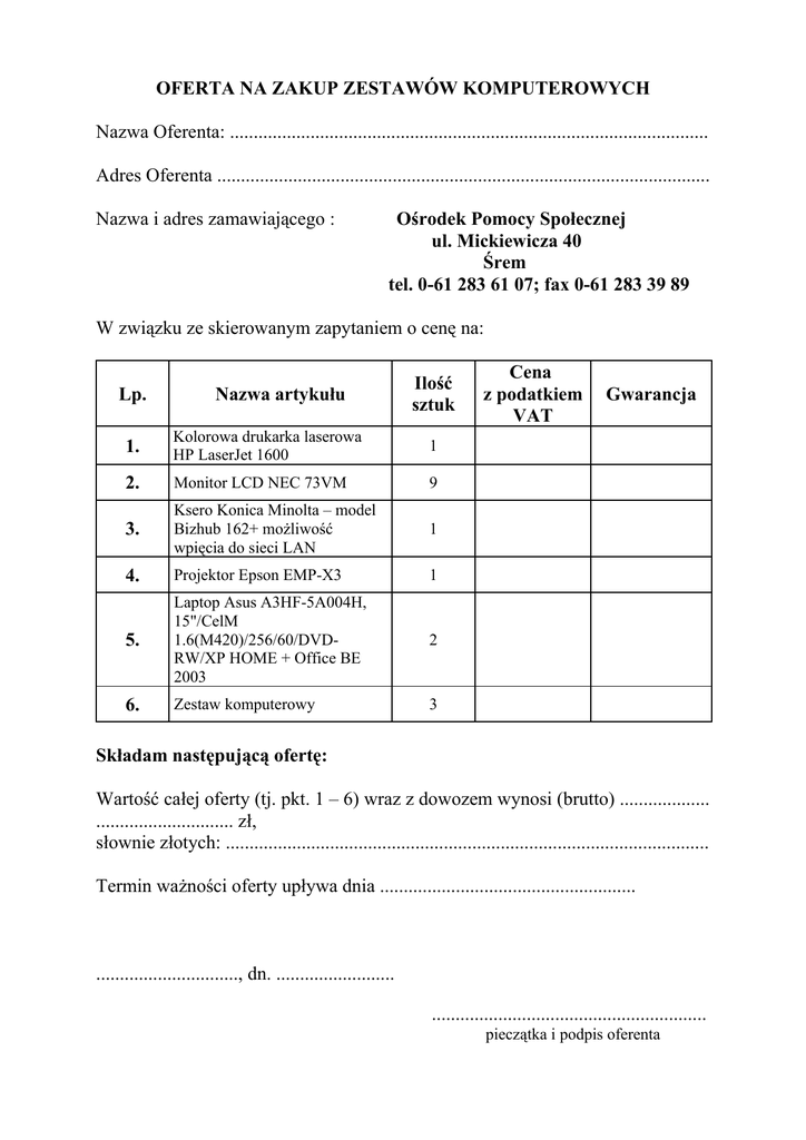 OFERTA NA ZAKUP ZESTAWÓW KOMPUTEROWYCH Nazwa Oferenta: ..................................................................................................... Adres Oferenta ........................................................................................................ Nazwa i adres zamawiającego : Ośrodek Pomocy Społecznej ul. Mickiewicza 40 Śrem tel. 0-61 283 61 07; fax 0-61 283 39 89 W związku ze skierowanym zapytaniem o cenę na: Lp. Nazwa artykułu Ilość sztuk 1. Kolorowa drukarka laserowa HP LaserJet 1600 1 2. Monitor LCD NEC 73VM 9 3. Ksero Konica Minolta – model Bizhub 162+ możliwość wpięcia do sieci LAN 1 4. Projektor Epson EMP-X3 1 5. Laptop Asus A3HF-5A004H, 15"/CelM 1.6(M420)/256/60/DVDRW/XP HOME + Office BE 2003 2 6. Zestaw komputerowy 3 Cena z podatkiem VAT Gwarancja Składam następującą ofertę: Wartość całej oferty (tj. pkt. 1 – 6) wraz z dowozem wynosi (brutto) ................... ............................. zł, słownie złotych: ...................................................................................................... Termin ważności oferty upływa dnia ...................................................... .............................., dn. ......................... .......................................................... pieczątka i podpis oferenta