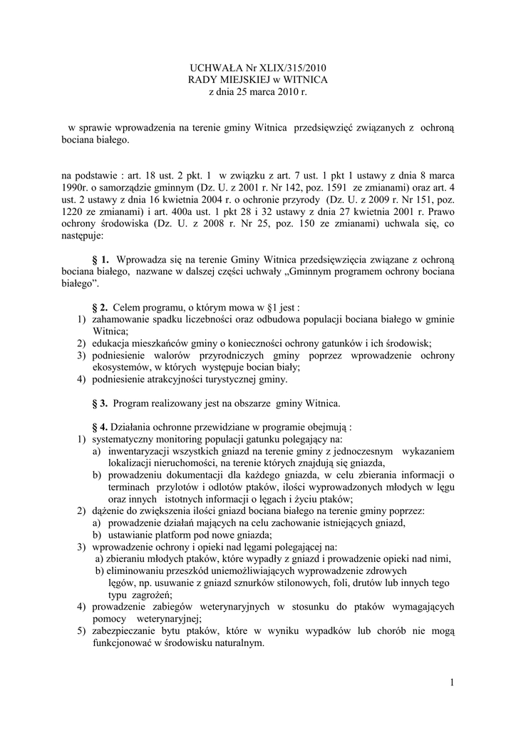 UCHWAŁA Nr XLIX/315/2010 RADY MIEJSKIEJ w WITNICA z dnia 25 marca 2010 r. w sprawie wprowadzenia na terenie gminy Witnica przedsięwzięć związanych z ochroną bociana białego. na podstawie : art. 18 ust. 2 pkt. 1 w związku z art. 7 ust. 1 pkt 1 ustawy z dnia 8 marca 1990r. o samorządzie gminnym (Dz. U. z 2001 r. Nr 142, poz. 1591 ze zmianami) oraz art. 4 ust. 2 ustawy z dnia 16 kwietnia 2004 r. o ochronie przyrody (Dz. U. z 2009 r. Nr 151, poz. 1220 ze zmianami) i art. 400a ust. 1 pkt 28 i 32 ustawy z dnia 27 kwietnia 2001 r. Prawo ochrony środowiska (Dz. U. z 2008 r. Nr 25, poz. 150 ze zmianami) uchwala się, co następuje: § 1. Wprowadza się na terenie Gminy Witnica przedsięwzięcia związane z ochroną bociana białego, nazwane w dalszej części uchwały „Gminnym programem ochrony bociana białego”. § 2. Celem programu, o którym mowa w §1 jest : 1) zahamowanie spadku liczebności oraz odbudowa populacji bociana białego w gminie Witnica; 2) edukacja mieszkańców gminy o konieczności ochrony gatunków i ich środowisk; 3) podniesienie walorów przyrodniczych gminy poprzez wprowadzenie ochrony ekosystemów, w których występuje bocian biały; 4) podniesienie atrakcyjności turystycznej gminy. § 3. Program realizowany jest na obszarze gminy Witnica. § 4. Działania ochronne przewidziane w programie obejmują : 1) systematyczny monitoring populacji gatunku polegający na: a) inwentaryzacji wszystkich gniazd na terenie gminy z jednoczesnym wykazaniem lokalizacji nieruchomości, na terenie których znajdują się gniazda, b) prowadzeniu dokumentacji dla każdego gniazda, w celu zbierania informacji o terminach przylotów i odlotów ptaków, ilości wyprowadzonych młodych w lęgu oraz innych istotnych informacji o lęgach i życiu ptaków; 2) dążenie do zwiększenia ilości gniazd bociana białego na terenie gminy poprzez: a) prowadzenie działań mających na celu zachowanie istniejących gniazd, b) ustawianie platform pod nowe gniazda; 3) wprowadzenie ochrony i opieki nad lęgami polegającej na: a) zbieraniu młodych ptaków, które wypadły z gniazd i prowadzenie opieki nad nimi, b) eliminowaniu przeszkód uniemożliwiających wyprowadzenie zdrowych lęgów, np. usuwanie z gniazd sznurków stilonowych, foli, drutów lub innych tego typu zagrożeń; 4) prowadzenie zabiegów weterynaryjnych w stosunku do ptaków wymagających pomocy weterynaryjnej; 5) zabezpieczanie bytu ptaków, które w wyniku wypadków lub chorób nie mogą funkcjonować w środowisku naturalnym. 1 § 5. Działania edukacyjne przewidziane w programie obejmują: 1) prowadzenie stałej współpracy z instytucjami i organizacjami społecznymi, których statutowa działalność związana jest z ochroną gatunkową zwierząt, a zwłaszcza ptaków i ich siedlisk; 2) prowadzenie i wspieranie działań edukacyjnych mających na celu zapoznanie mieszkańców gminy z biologią gatunku i jego potrzebami życiowymi oraz zagrożeniami jakie dla niego niesie rozwój cywilizacji; 3) prowadzenie stałej współpracy ze szkołami położonymi na terenie gminy w zakresie realizacji programu. § 6. Działania związane z ochroną środowiska naturalnego bociana białego na terenie gminy Witnica obejmują przede wszystkim podejmowanie przez gminę inicjatyw na rzecz ochrony biocenoz łąkowych i obszarów zalewowych, a zwłaszcza prowadzenia melioracji użytków zielonych i hamowania występującej na nich sukcesji ekologicznej; § 7. Działania, o których mowa w §4 - 6 prowadzone lub nadzorowane są przez pracowników Urzędu Miasta i Gminy Witnica. § 8. 1. Działania, o których mowa w §4 - 6 są finansowane z budżetu gminy. 2. Organizacje społeczne lub osoby fizyczne, które realizują zadania przewidziane w programie, mogą ubiegać się o dofinansowanie na ten cel z budżetu gminy. 3. O dofinansowanie z budżetu gminy działań związanych z budową platform pod gniazda mogą ubiegać się podmioty wymienione w ust. 2, pod warunkiem, że: 1) działania, które przewidziane są do dofinansowanie zostaną przeprowadzone na nieruchomościach komunalnych położonych na terenie gminy Witnica; 2) podmiot chcący wybudować platformę pod gniazdo musi okazać się pisemną zgodę właściciela lub zarządcy nieruchomości na wzniesienie platformy; 3) propozycja lokalizacji platformy uzyska akceptację merytorycznego pracownika urzędu gminy (podczas oceny lokalizacji zwraca się szczególną uwagę na to czy położenie platformy i potencjalnego gniazda nie będzie stwarzało konfliktów i nie będzie uciążliwe dla otoczenia, czy będzie bezpieczne dla ptaków, oraz czy gwarantuje długi horyzont czasowy istnienia gniazda). § 9. 1. Dofinansowanie, o którym mowa w § 8 ust. 2 i 3 może być przyznawane przez Burmistrza Miasta i Gminy Witnica, na podstawie indywidualnego wniosku. Podstawą przekazania środków jest umowa. 2. O wysokości dotacji każdorazowo decyduje Burmistrz w formie zarządzenia. § 10. Wykonanie uchwały powierza się Burmistrzowi Miasta i Gminy Witnica. § 11. Traci moc uchwała NR XV/118/2000 Rady Miasta i Gminy Witnica z dnia 29.06.2000 r. w sprawie: wprowadzenia gminnego programu ochrony gatunkowej bociana białego (Ciconia ciconia). § 12. Uchwała wchodzi w życie z dniem podjęcia. Przewodnicząca Rady mgr Krystyna Sikorska 2