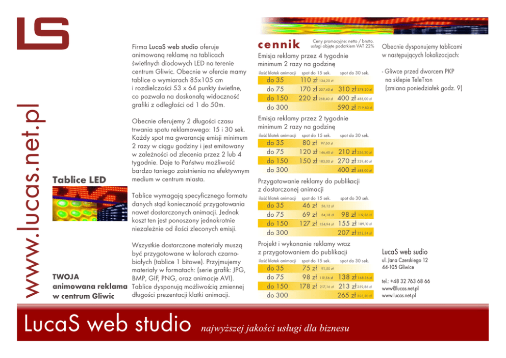 www.lucas.net.pl Firma LucaS web studio oferuje animowan¹ reklamê na tablicach œwietlnych diodowych LED na terenie centrum Gliwic. Obecnie w ofercie mamy tablice o wymiarach 85x105 cm i rozdielczoœci 53 x 64 punkty œwietlne, co pozwala na doskona³¹ widocznoœæ grafiki z odleg³oœci od 1 do 50m. Tablice LED Obecnie oferujemy 2 d³ugoœci czasu trwania spotu reklamowego: 15 i 30 sek. Ka¿dy spot ma gwarancjê emisji minimum 2 razy w ci¹gu godziny i jest emitowany w zale¿noœci od zlecenia przez 2 lub 4 tygodnie. Daje to Pañstwu mo¿liwoœæ bardzo taniego zaistnienia na efektywnym medium w centrum miasta. Tablice wymagaj¹ specyficznego formatu danych st¹d koniecznoœæ przygotowania nawet dostarczonych animacji. Jednak koszt ten jest ponoszony jednokrotnie niezale¿nie od iloœci zleconych emisji. Wszystkie dostarczone materia³y musz¹ byæ przygotowane w kolorach czarnobia³ych (tablice 1 bitowe). Przyjmujemy materia³y w formatach: (serie grafik: JPG, TWOJA BMP, GIF, PNG, oraz animacje AVI). animowana reklama Tablice dysponuj¹ mo¿liwoœci¹ zmiennej d³ugoœci prezentacji klatki animacji. w centrum Gliwic cennik Ceny promocyjne: netto / brutto. us³ugi objête podatkiem VAT 22% Emisja reklamy przez 4 tygodnie minimum 2 razy na godzinê iloœæ klatek animacji do 35 do 75 do 150 do 300 spot do 15 sek. spot do 30 sek. 110 z³ 134,20 z³ 170 z³ 207,40 z³ 310 z³ 378,20 z³ 220 z³ 268,40 z³ 400 z³ 488,00 z³ 590 z³ 719,80 z³ Obecnie dysponujemy tablicami w nastêpuj¹cych lokalizacjach: - Gliwce przed dworcem PKP na sklepie TeleTron (zmiana poniedzia³ek godz. 9) Emisja reklamy przez 2 tygodnie minimum 2 razy na godzinê iloœæ klatek animacji do 35 do 75 do 150 do 300 spot do 15 sek. spot do 30 sek. 80 z³ 97,60 z³ 120 z³ 146,40 z³ 210 z³ 256,20 z³ 150 z³ 183,00 z³ 270 z³ 329,40 z³ 400 z³ 488,00 z³ Przygotowanie reklamy do publikacji z dostarczonej animacji iloœæ klatek animacji do 35 do 75 do 150 do 300 spot do 15 sek. 46 z³ 69 z³ 127 z³ spot do 30 sek. 56,12 z³ 84,18 z³ 154,94 z³ 98 z³ 119,56 z³ 155 z³ 189,10 z³ 207 z³ 252,54 z³ Projekt i wykonanie reklamy wraz z przygotowaniem do publikacji iloœæ klatek animacji do 35 do 75 do 150 do 300 spot do 15 sek. 75 z³ 98 z³ 178 z³ spot do 30 sek. 91,50 z³ 119,56 z³ 217,16 z³ 138 z³ 168,36 z³ 213 z³ 259,86 z³ 265 z³ 323,30 z³ LucaS web sudio ul. Jana Czerskiego 12 44-105 Gliwice tel.: +48 32 763 68 66 [email protected] www.lucas.net.pl