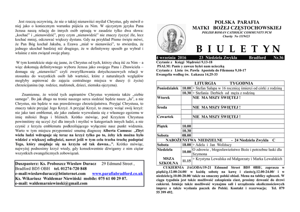Jest rzeczą oczywistą, że nie o takiej nienawiści myślał Chrystus, gdy mówił o niej jako o koniecznym warunku pójścia za Nim. W ojczystym języku Pana Jezusa naszą relację do innych osób opisują w zasadzie tylko dwa słowa: „kochać” i „nienawidzić”, przy czym „nienawidzić” nie znaczy życzyć źle, lecz kochać mniej, odczuwać większy dystans. Gdy na przykład Pismo święte mówi, że Pan Bóg kochał Jakuba, a Ezawa „miał w nienawiści”, to stwierdza, że jednego ukochał bardziej niż drugiego, że w definitywny sposób go wybrał i właśnie z nim związał swoje plany. POLSKA PARAFIA MATKI BOŻEJ CZĘSTOCHOWSKIEJ POLISH ROMAN CATHOLIC COMMUNITY PCM Charity No 1119423 B I U L E T YN 4 września 2016 W tym kontekście staje się jasne, że Chrystus od tych, którzy chcą iść za Nim – a więc dokonują definitywnego wyboru Jezusa jako swojego Pana i Zbawiciela – domaga się „nienawiści” czyli zweryfikowania dotychczasowych relacji w stosunku do wszystkich osób lub wartości, które z naturalnych względów mogłyby aspirować do zajęcia centralnego miejsca w duszy (i życiu) chrześcijanina (np. rodzice, małżonek, dzieci, ziemska ojczyzna). Znamienne, że wśród tych aspirantów Chrystus wymienia także „siebie samego”. Bo jak długo na tronie naszego serca siedzieć będzie nasze „Ja”, a nie Chrystus, nie będzie w nas prawdziwego chrześcijaństwa. Przyjąć Chrystusa, to znaczy także przyjąć Jego Krzyż. A przyjąć Krzyż, to znaczy wziąć swój krzyż: nie jako tani emblemat, ale jako zadanie wyzwalania się z własnego egoizmu w imię miłości Boga i bliźnich. Krótko mówiąc, pod Krzyżem Chrystusa powinniśmy się uczyć żyć dla innych i myśleć w kategoriach innych ludzi, a nie czynić z krzyża emblematu podkreślającego wyłącznie nasz punkt widzenia. Warto w tym miejscu przypomnieć smutną diagnozę Alberta Camusa: „Zbyt wielu ludzi wdrapuje się teraz na krzyż tylko po to, żeby ich można było widzieć z większej odległości, nawet jeśli w tym celu trzeba trochę podeptać Tego, który znajduje się na krzyżu od tak dawna...”. Krótko mówiąc, najwyżej podnosimy krzyż wtedy, gdy konsekwentnie dźwigamy z nim ciężar wszystkich ewangelicznych zobowiązań. Duszpasterz: Ks. Proboszcz Wiesław Duracz 29 Edmund Street , Bradford BD5 OBH tel. 01274-720 848 e-mail:[email protected] www.parafiabradford.co.uk Ks. Wikariusz Waldemar Niewiński mobile: 075 61 00 29 07. e-mail: [email protected] 23 Niedziela Zwykła Bradford Nr.36 Czytanie z Księgi Mądrości 9,13-18 PSALM: Panie y zawsze byłeś nam ucieczką Czytanie z Listu św. Pawła Apostoła do Filemona 9,10-17 Ewangelia według św. Łukasza 14,25-33 LITURGIA TYGODNIA Poniedziałek 10.00 + Stefan Sałapa w 16 rocznicę śmierci od córki z rodziną 10.30 + Stefania Derbich od męża z rodziną Wtorek NIE MA MSZY ŚWIĘTEJ ! Środa NIE MA MSZY ŚWIĘTEJ ! Czwartek NIE MA MSZY ŚWIĘTEJ ! Piątek 10.00 10.30 Sobota 08.00 NABOŻEŃSTWA NIEDZIELNE - 24 Niedziela Zwykła C Sobota 18.00 + Adela i Jan Wolińscy Niedziela O zdrowie , błogosławieństwo Boże i potrzebne łaski dla 10.00 Szymona MSZA + Krystyna Lewalska od Małgorzaty i Marka Lewalskich 11.15 SZKOLNA CUKIERNIA JAGODA/19-21 Edmund Street BD5 0BH/, zaprasza w piątki/g.12.00-24.00/ w każdą sobotę na kawę i ciasto/g.12.00-24.00/ i w niedziele/g.10.00-20.00/ także na smaczny polski obiad. Menu na tablicy ogłoszeń. W ciągu tygodnia jest także możliwość zakupienia ciast, prosimy dzwonić do drzwi cukierni. Istnieje także możliwość wynajmu sali i urządzenia okolicznościowych imprez a także wysłania paczek do Polski. Kontakt i rezerwacja; Tel. 079 55 399 492. Lektorzy – Sobota 10.09.2016 g.18.00 – R. Dziama Niedziela 11.09.2016 g. 10.00 - K. Musztafa g.11.15 - Polska Szkoła Dyżur przedstawiciela PRD Sali św. Brata Alberta, sobota i niedziela 10-11.09.2016 – M.E. Kączkowscy OFIARY Na potrzeby parafii – £ Na kwiaty – £ Taca dla parafii – 28.08.2016 - £ 334.19 Gift Aid 31.07.2016 - £ 80.50 Jeżeli ktoś z Parafian pragnie złożyć ofiarę czekiem/na dowolny cel parafialny/, prosimy go wypisać na –P.C.M. BRADFORD. Zwracamy się w imieniu Parafialnej Rady Duszpasterskiej do wszystkich Parafian z serdeczną prośbą o złożenie raz w roku minimalnej sumy £ 30 na potrzeby naszej parafii. Wszystkim ofiarodawcom składamy serdeczne podziękowanie za złożone ofiary na nasze cele parafialne. Bóg zapłać. *** OGŁOSZENIA DUSZPASTERSKIE *** 1. Pan Jezus stawia nam – swoim uczniom − wysokie wymagania. Ma być w naszym życiu na pierwszym miejscu. Od Niego winno brać początek każde działanie i w Nim znajdować swoje dopełnienie. Jako komentarz do słów dzisiejszej Ewangelii niech posłużą słowa Świętego Augustyna: „Jeśli Bóg jest na pierwszym miejscu w twoim życiu, to wszystko jest na właściwym miejscu, ale jeśli Bóg nie jest na pierwszym miejscu w twoim systemie wartości, to w twoim życiu jest bałagan”. 2. Niech zaskakujące słowa Chrystusa z dzisiejszej Ewangelii pomogą nam już na początku kolejnego roku pracy i nauki poukładać właściwie wszystkie sprawy. Będziemy się o to modlić w czasie niedzielnych nieszporów, na które serdecznie zapraszamy. 3. Zatroszczmy się o dobre wychowanie młodego pokolenia. Postarajmy się znaleźć czas dla naszych dzieci – żywo interesujmy się ich postępami w szkole. Przypominamy ponadto, że przygotowanie do sakramentów świętych – do pierwszej spowiedzi i Komunii świętej oraz do bierzmowania odbywa się przy parafii. 4. W czwartek, 8 września przypada święto Narodzenia NMP, w polskiej tradycji nazywane świętem Matki Bożej Siewnej.5. Solenizantów i jubilatów zapewniamy o naszej życzliwości i modlitwie. W szczególny sposób pragniemy ogarnąć modlitwą ostatnio zmarłych parafian i ich bliskich. Poniedziałek – g.12.00 POK Obiad Sekcji Weteranów/POK/. Ś