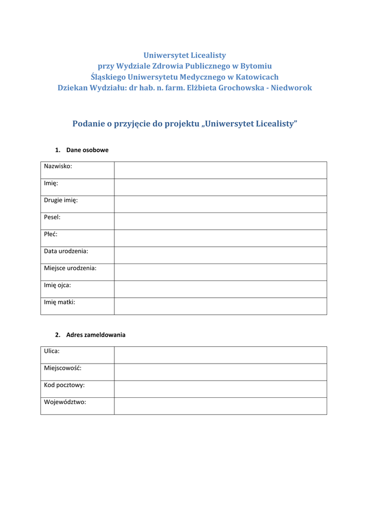Formularz zgłoszeniowy pdf - Śląski Uniwersytet Medyczny w