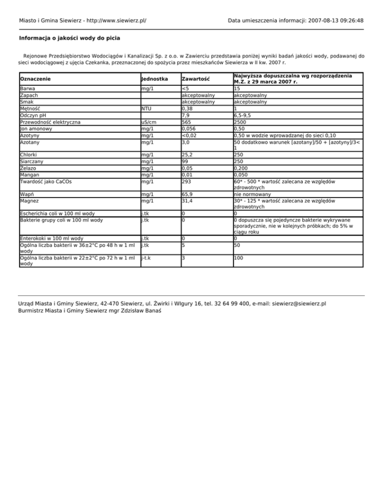 Miasto i Gmina Siewierz - http://www.siewierz.pl/ Data umieszczenia informacji: 2007-08-13 09:26:48 Informacja o jakości wody do picia Rejonowe Przedsiębiorstwo Wodociągów i Kanalizacji Sp. z o.o. w Zawierciu przedstawia poniżej wyniki badań jakości wody, podawanej do sieci wodociągowej z ujęcia Czekanka, przeznaczonej do spożycia przez mieszkańców Siewierza w II kw. 2007 r. Oznaczenie Jednostka Zawartość Barwa Zapach Smak Mętność Odczyn pH Przewodność elektryczna Jon amonowy Azotyny Azotany mg/1 uS/cm mg/1 mg/1 mg/1 <5 akceptowalny akceptowalny 0,38 7,9 565 0,056 <0,02 3,0 Chlorki Siarczany Żelazo Mangan Twardość jako CaCOs mg/1 mg/1 mg/1 mg/1 mg/1 25,2 99 0,05 0,01 293 Wapń Magnez mg/1 mg/1 65,9 31,4 Escherichia coli w 100 ml wody Bakterie grupy coli w 100 ml wody j.tk j.tk 0 0 Enterokoki w 100 ml wody Ogólna liczba bakterii w 36±2°C po 48 h w 1 ml wody Ogólna liczba bakterii w 22±2°C po 72 h w 1 ml wody j.tk j.tk 0 5 Najwyższa dopuszczalna wg rozporządzenia M.Z. z 29 marca 2007 r. 15 akceptowalny akceptowalny 1 6,5-9,5 2500 0,50 0,50 w wodzie wprowadzanej do sieci 0,10 50 dodatkowo warunek [azotany]/50 + [azotyny]/3< 1 250 250 0,200 0,050 60* - 500 * wartość zalecana ze względów zdrowotnych nie normowany 30* - 125 * wartość zalecana ze względów zdrowotnych 0 0 dopuszcza się pojedyncze bakterie wykrywane sporadycznie, nie w kolejnych próbkach; do 5% w ciągu roku 0 50 j-t.k 3 100 NTU Urząd Miasta i Gminy Siewierz, 42-470 Siewierz, ul. Żwirki i WIgury 16, tel. 32 64 99 400, e-mail: [email protected] Burmistrz Miasta i Gminy Siewierz mgr Zdzisław Banaś