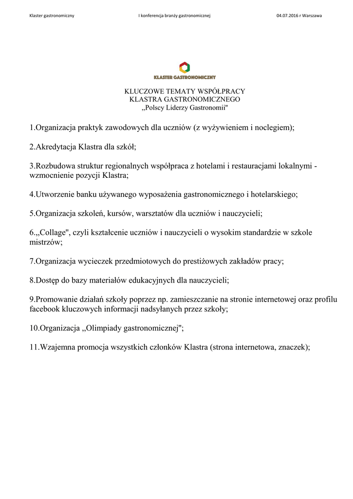 Klaster gastronomiczny I konferencja branży gastronomicznej 04.07.2016 r Warszawa KLUCZOWE TEMATY WSPÓŁPRACY KLASTRA GASTRONOMICZNEGO ,,Polscy Liderzy Gastronomii'' 1.Organizacja praktyk zawodowych dla uczniów (z wyżywieniem i noclegiem); 2.Akredytacja Klastra dla szkół; 3.Rozbudowa struktur regionalnych współpraca z hotelami i restauracjami lokalnymi wzmocnienie pozycji Klastra; 4.Utworzenie banku używanego wyposażenia gastronomicznego i hotelarskiego; 5.Organizacja szkoleń, kursów, warsztatów dla uczniów i nauczycieli; 6.,,Collage'', czyli kształcenie uczniów i nauczycieli o wysokim standardzie w szkole mistrzów; 7.Organizacja wycieczek przedmiotowych do prestiżowych zakładów pracy; 8.Dostęp do bazy materiałów edukacyjnych dla nauczycieli; 9.Promowanie działań szkoły poprzez np. zamieszczanie na stronie internetowej oraz profilu facebook kluczowych informacji nadsyłanych przez szkoły; 10.Organizacja ,,Olimpiady gastronomicznej''; 11.Wzajemna promocja wszystkich członków Klastra (strona internetowa, znaczek);