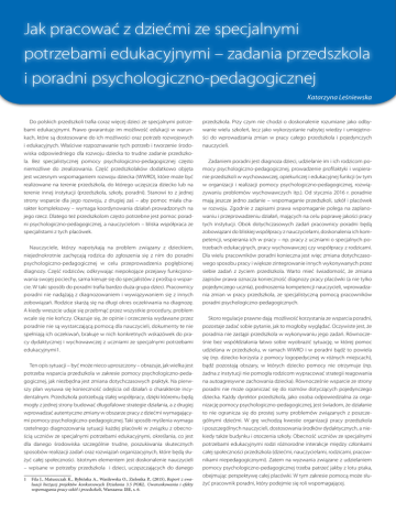 Jak pracować z dziećmi ze specjalnymi potrzebami edukacyjnymi – zadania przedszkola i poradni psychologiczno-pedagogicznej Katarzyna Leśniewska Do polskich przedszkoli trafia coraz więcej dzieci ze specjalnymi potrzebami edukacyjnymi. Prawo gwarantuje im możliwość edukacji w warunkach, które są dostosowane do ich możliwości oraz potrzeb rozwojowych przedszkola. Przy czym nie chodzi o doskonalenie rozumiane jako odbywanie wielu szkoleń, lecz jako wykorzystanie nabytej wiedzy i umiejętności do wprowadzania zmian w pracy całego przedszkola i pojedynczych i edukacyjnych. Właściwe rozpoznawanie tych potrzeb i tworzenie środowiska odpowiedniego dla rozwoju dziecka to trudne zadanie przedszkola. Bez specjalistycznej pomocy psychologiczno-pedagogicznej często niemożliwe do zrealizowania. Część przedszkolaków dodatkowo objęta jest wczesnym wspomaganiem rozwoju dziecka (WWRD), które może być nauczycieli. realizowane na terenie przedszkola, do którego uczęszcza dziecko lub na terenie innej instytucji (przedszkola, szkoły, poradni). Stanowi to z jednej strony wsparcie dla jego rozwoju, z drugiej zaś – aby pomoc miała charakter kompleksowy – wymaga koordynowania działań prowadzonych na jego rzecz. Dlatego też przedszkolom często potrzebne jest pomoc porad- w organizacji i realizacji pomocy psychologiczno-pedagogicznej, rozwiązywaniu problemów wychowawczych itp.). Od stycznia 2016 r. poradnie mają jeszcze jedno zadanie – wspomaganie przedszkoli, szkół i placówek w rozwoju. Zgodnie z zapisami prawa wspomaganie polega na zaplanowaniu i przeprowadzeniu działań, mających na celu poprawę jakości pracy ni psychologiczno-pedagogicznej, a nauczycielom – bliska współpraca ze tych instytucji. Obok dotychczasowych zadań pracownicy poradni będą specjalistami z tych placówek. Nauczyciele, którzy napotykają na problem związany z dzieckiem, niejednokrotnie zachęcają rodzica do zgłoszenia się z nim do poradni zobowiązani do bliskiej współpracy z nauczycielami, doskonalenia ich kompetencji, wspierania ich w pracy – np. pracy z uczniami o specjalnych potrzebach edukacyjnych, pracy wychowawczej czy współpracy z rodzicami. Dla wielu pracowników poradni konieczna jest więc zmiana dotychczaso- psychologiczno-pedagogicznej w celu przeprowadzenia pogłębionej wego sposobu pracy i większe zintegrowanie innych wykonywanych przez diagnozy. Część rodziców, odkrywając niepokojące przejawy funkcjonowania swojej pociechy, sama kieruje się do specjalistów z prośbą o wsparcie. W taki sposób do poradni trafia bardzo duża grupa dzieci. Pracownicy siebie zadań z życiem przedszkola. Warto mieć świadomość, że zmiana zapisów prawa oznacza konieczność diagnozy pracy placówki (a nie tylko pojedynczego ucznia), podnoszenia kompetencji nauczycieli, wprowadza- poradni nie nadążają z diagnozowaniem i wywiązywaniem się z innych zobowiązań. Rodzice skarżą się na długi okres oczekiwania na diagnozę. A kiedy wreszcie udaje się przebrnąć przez wszystkie procedury, problem wcale się nie kończy. Okazuje się, że opinie i orzeczenia wydawane przez poradnie nie są wystarczającą pomocą dla nauczycieli, dokumenty te nie nia zmian w pracy przedszkola, ze specjalistyczną pomocą pracowników poradni psychologiczno-pedagogicznych. spełniają ich oczekiwań, brakuje w nich konkretnych wskazówek do pracy dydaktycznej i wychowawczej z uczniami ze specjalnymi potrzebami poradnia nie zastąpi przedszkola w wykonywaniu jego zadań. Równocześnie bez współdziałania łatwo sobie wyobrazić sytuację, w której pomoc edukacyjnymi1. Ten opis sytuacji – być może nieco uproszczony – obrazuje, jak wielka jest potrzeba wsparcia przedszkola w zakresie pomocy psychologiczno-pedagogicznej, jak niezbędna jest zmiana dotychczasowych praktyk. Na pierw- udzielana w przedszkolu, w ramach WWRD i w poradni bądź to powiela się (np. dziecko korzysta z pomocy logopedycznej w różnych miejscach), bądź pozostają obszary, w których dziecko pomocy nie otrzymuje (np. żadna z instytucji nie pomogła rodzicom wypracować strategii reagowania na autoagresywne zachowania dziecka). Równocześnie wsparcie ze strony szy plan wysuwa się konieczność odejścia od działań o charakterze incydentalnym. Przedszkola potrzebują stałej współpracy, dzięki któremu będą mogły z jednej strony budować długofalowe strategie działania, a z drugiej wprowadzać autentyczne zmiany w obszarze pracy z dziećmi wymagającymi pomocy psychologiczno-pedagogicznej. Taki sposób myślenia wymaga poradni nie może ograniczać się do rozmów dotyczących pojedynczego dziecka. Każdy dyrektor przedszkola, jako osoba odpowiedzialna za organizację pomocy psychologiczno-pedagogicznej, jest świadom, że działanie to nie ogranicza się do prostej sumy problemów związanych z poszczególnymi dziećmi. W grę wchodzą kwestie organizacji pracy przedszkola rzetelnego diagnozowania sytuacji każdej placówki w związku z obecnością uczniów ze specjalnymi potrzebami edukacyjnymi, określania, co jest dla danego środowiska szczególnie trudne, poszukiwania skutecznych sposobów realizacji zadań oraz rozwiązań organizacyjnych, które będą służyć całej społeczności. Istotnym elementem jest doskonalenie nauczycieli i poszczególnych nauczycieli, dostosowania środków dydaktycznych, a niekiedy także budynku i otoczenia szkoły. Obecność uczniów ze specjalnymi potrzebami edukacyjnymi rodzi różnorodne interakcje między członkami całej społeczności przedszkola (dziećmi, nauczycielami, rodzicami, pracownikami niepedagogicznymi). Zatem na wyzwania związane z udzielaniem – wpisane w potrzeby przedszkola i dzieci, uczęszczających do danego pomocy psychologiczno-pedagogicznej trzeba patrzeć jakby z lotu ptaka, obejmując perspektywę całej placówki. W tym zakresie pomocą może służyć pracownik poradni, który podejmie się roli wspomagające
