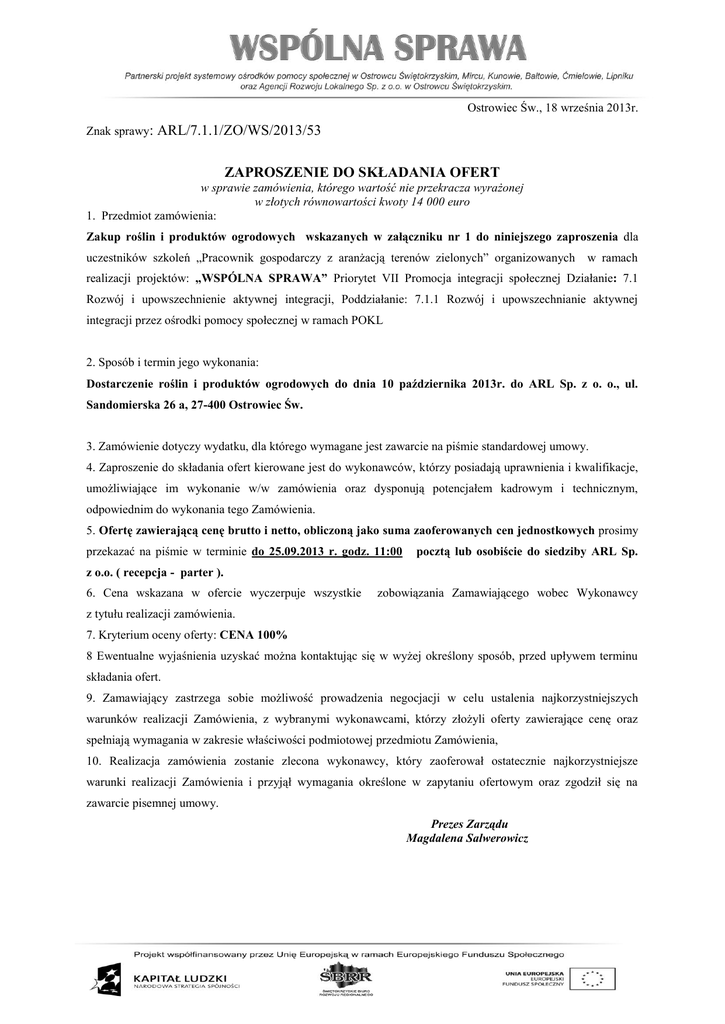 Ostrowiec Św., 18 września 2013r. Znak sprawy: ARL/7.1.1/ZO/WS/2013/53 ZAPROSZENIE DO SKŁADANIA OFERT w sprawie zamówienia, którego wartość nie przekracza wyrażonej w złotych równowartości kwoty 14 000 euro 1. Przedmiot zamówienia: Zakup roślin i produktów ogrodowych wskazanych w załączniku nr 1 do niniejszego zaproszenia dla uczestników szkoleń „Pracownik gospodarczy z aranżacją terenów zielonych” organizowanych w ramach realizacji projektów: „WSPÓLNA SPRAWA” Priorytet VII Promocja integracji społecznej Działanie: 7.1 Rozwój i upowszechnienie aktywnej integracji, Poddziałanie: 7.1.1 Rozwój i upowszechnianie aktywnej integracji przez ośrodki pomocy społecznej w ramach POKL 2. Sposób i termin jego wykonania: Dostarczenie roślin i produktów ogrodowych do dnia 10 października 2013r. do ARL Sp. z o. o., ul. Sandomierska 26 a, 27-400 Ostrowiec Św. 3. Zamówienie dotyczy wydatku, dla którego wymagane jest zawarcie na piśmie standardowej umowy. 4. Zaproszenie do składania ofert kierowane jest do wykonawców, którzy posiadają uprawnienia i kwalifikacje, umożliwiające im wykonanie w/w zamówienia oraz dysponują potencjałem kadrowym i technicznym, odpowiednim do wykonania tego Zamówienia. 5. Ofertę zawierającą cenę brutto i netto, obliczoną jako suma zaoferowanych cen jednostkowych prosimy przekazać na piśmie w terminie do 25.09.2013 r. godz. 11:00 pocztą lub osobiście do siedziby ARL Sp. z o.o. ( recepcja - parter ). 6. Cena wskazana w ofercie wyczerpuje wszystkie zobowiązania Zamawiającego wobec Wykonawcy z tytułu realizacji zamówienia. 7. Kryterium oceny oferty: CENA 100% 8 Ewentualne wyjaśnienia uzyskać można kontaktując się w wyżej określony sposób, przed upływem terminu składania ofert. 9. Zamawiający zastrzega sobie możliwość prowadzenia negocjacji w celu ustalenia najkorzystniejszych warunków realizacji Zamówienia, z wybranymi wykonawcami, którzy złożyli oferty zawierające cenę oraz spełniają wymagania w zakresie właściwości podmiotowej przedmiotu Zamówienia, 10. Realizacja zamówienia zostanie zlecona wykonawcy, który zaoferował ostatecznie najkorzystniejsze warunki realizacji Zamówienia i przyjął wymagania określone w zapytaniu ofertowym oraz zgodził się na zawarcie pisemnej umowy. Prezes Zarządu Magdalena Salwerowicz Załącznik nr 1 do Zaproszenia do składania ofert znak sprawy: ARL/7.1.1/ZO/WS/2013/53 Lp. 1. 2. 3. 4. 5. 6. 7. 8. 9. 10. 11. 12. 13. 14. 15. NAZWA TOWARU Ziemia do iglaków (50 l) Obrzeże trawnikowe plastikowe brązowe 9 m x 10 cm Żwir otoczakowy jasny Rolborder (ok. 6 cm x 30 cm x 250 cm) Nawóz jesienny uniwersalny Włóknina czarna materiałowa (szerokość 1,60) Kostrzewa Popielata – Festuca glauca Pinus mugo var. mughus - Sosna kosodrzewina Pieris japoński „Mountain Fire” Hydrangea macrophylla „Sibilla” Hydrangea paniculata „Limelight” Żurawka drobnokwiatowa PALACE PURPLE Heuchera micrantha Nożyce do trawy do przycinania brzegów trawników - Classic - (873029) Grabie do liści wachlarzowe Fiskars – model: 135560 Sekator dwuręczny dźwigowy 67 cm – model: (3551) /6/ Bellota Jednostka miary Orienta cyjna ilość towaru worek 2 sztuka 2 tona 3 m 12 kg 5 m2 60 sztuka 20 sztuka 8 sztuka 3 sztuka 2 sztuka 2 sztuka 5 sztuka 2 sztuka 2 sztuka 2 JEDNOSTKOWA CENA NETTO JEDNOSTKO WA CENA BRUTTO ŁĄCZNA CENA NETTO ŁĄCZNA CENA BRUTTO 16. 17. 18. Sekator jednoręczny aluminiowy 17 cm – model: (3516) /6/ Bellota Szczotka do zamiatania na zewnątrz z twardym włosiem – model: 251 452 Vikan Szczotka do zamiatania VILEDA UNIWERSALNA długość szczotki z kijem: 143cm sztuka 2 sztuka 2 sztuka 2 Oferowana cena łączna ( suma cen jednostkowych ) ww. produktów: Cena netto …………………………………………… Cena brutto ……………………………………………