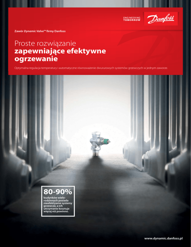 Zawór Dynamic Valve™ firmy Danfoss Proste rozwiązanie zapewniające efektywne ogrzewanie Optymalna regulacja temperatury i automatyczne równoważenie dwururowych systemów grzewczych w jednym zaworze. 80-90% budynków wielo rodzinnych posiada nieefektywne systemy grzewcze, a ich utrzymanie kosztuje więcej niż powinno. www.dynamic.danfoss.pl Klucz do sukcesu to automatyczne równoważenie Możliwość jednoczesnego automatycznego równoważenia i regulacji grzejników w dwururowych systemach grzewczych niezależnie od zmian obciążenia cieplnego budynku, jest kluczem do uzyskania lepszej wydajności systemu, zmniejszenia zużycia energii i zwiększenia poziomu zadowolenia lokatorów. Innowacyjna konstrukcja zaworu Dynamic Valve™ pozwala na wyeliminowanie typowych problemów eksploatacyjnych takich jak hałas, nierównomierna dystrybucja ciepła i nadmierne zużycie energii. regulacyjnym. Zawór Dynamic Valve™ jest niezależny od zmian ciśnienia, co sprawia, że przepływ medium przez grzejnik zawsze utrzymuje się na wymaganym poziomie. Montowany bezpośrednio przy każdym grzejniku, bez konieczności stosowania jakichkolwiek regulatorów podpionowych, zapewnia automatyczne równoważenie hydrauliczne w całym systemie grzewczym, bez względu na zmiany obciążenia cieplnego systemu. Automatyczne równoważenie stało się jeszcze prostsze Innowacyjność zaworu Dynamic Valve™ polega na tym, że wbudowany automatyczny regulator różnicy ciśnień utrzymuje stałe ciśnienie na zaworze Korzyści i zalety automatycznego równoważenia hydraulicznego Automatycznie równoważony system grzewczy zwiększa komfort mieszkańców dzięki zapewnianiu równomiernego dostarczania ciepła do wszystkich pomieszczeń. Eliminuje również problemy związane z hałasem, zwiększa efektywność energetyczną i obniża koszty ogrzewania. Firma Danfoss oferuje dwa możliwe rozwiązania automatycznego równoważenia: zawór Dynamic Valve™ został zaprojektowany do dwururowych systemów grzewczych z grzejnikami bocznozasilanymi. Zawór Dynamic Valve™ pracuje przy ciśnieniu różnicowym w zakresie od 10 do 60 kPa. W przypadku budynków, gdzie ciśnienie dyspozycyjne jest większe od 60kPa lub zamontowano grzejniki dolnozasilane, albo gdy zawory termostatyczne z nastawą wstępną funkcjonują prawidłowo, najlepszym rozwiązaniem są automatyczne zawory równoważące Danfoss typu ASV. Więcej informacji o automatycznym równoważeniu możesz znaleźć na stronie: www.ogrzewanie.danfoss.pl Konkretne rozwiązanie konkretnych potrzeb Zawór Dynamic Valve™ został zaprojektowany przede wszystkim do modernizacji instalacji grzewczych w budownictwie wielorodzinnym oraz budynkach takich jak szkoły, szpitale i biurowce, jednakże można go również stosować w nowym budownictwie. Dzięki zaworom Dynamic Valve™, zaprojektowanym specjalnie na potrzeby systemów dwururowych, firma Danfoss oferuje kompleksowe rozwiązania automatycznego równoważenia bez względu na rozmiar instalacji grzewczej. Automatyczne równoważenie hydrauliczne zapewnia natychmiastowe korzyści w każdych warunkach. Inwestycja w rozwiązanie automatycznego równoważenia zwraca się bardzo szybko i przynosi wymierne korzyści w postaci obniżenia kosztów ogrzewania, wyeliminowania problemów ze zmianami ciśnienia w instalacji, rozwiązania problemów w hałasem oraz zagwarantowania równomiernej dystrybucji ciepła do każdego grzejnika. Skuteczność w najprostszej formie Połączenie w jednym produkcie zaworu termostatycznego oraz automatycznego zaworu równoważącego jest najskuteczniejszym sposobem na rozwiązanie większości problemów z eksploatacją systemów grzewczych. Poprawia się efektywność energetyczna, a ustawienia pompy można łatwo zoptymalizować. Skutkuje to poprawą komfortu, zmniejszeniem strat energii oraz obniżeniem kosztów ogrzewania. Korzyści • Szybkie, równomierne i komfortowe ogrzewanie • Większa efektywność energetyczna i mniejsze koszty • Niezawodne i ciche ogrzewanie • Minimalne niedogodności podczas modernizacji Tylko głowice termostatyczne Danfoss gwarantują prawidłową regulację Zawór Dynamic Valve™ jest dostępny w wersji prostej i kątowej w rozmiarach DN10, DN15 i DN20 oraz w wersjach UK oraz trójosiowej prawej/lewej w rozmiarach DN10 i DN15. Wbudowany automatyczny ogranicznik przepływu ogranicza przepływ przez zawór w zakresie od 25 od 135 l/h, który jest typowy dla większości grzejników stosowanych w budownictwie mieszkaniowym. W zaworach Dynamic Valve™ zastosowano typowe złącze zatrzaskowe RA tak, jak w pozostałych zaworach termostatycznych RAW RA 2920 Głowice cieczowe serii RAW z pełnym zakresem regulacji temperatury 8-28°C lub ograniczonym 16-28°C. Głowice termostatyczne z zabezpieczeniem przed manipulacją stosuje się budynkach użyteczności publicznej i innych budynkach, gdzie konieczne jest zablokowanie nastawy na głowicy. firmy Danfoss, co zapewnia swobodę wyboru spośród wielu różnych typów głowic. Zawory Dynamic Valve™ można zastosować do grzejników bocznozasilanych wszystkich producentów. Danfoss Eco™ / Danfoss Link™ Connect Stosując samodzielne termostaty elektroniczne Eco™ lub bezprzewodowe, programowalne termostaty Connect można uzyskać najwyższą energooszczędność. EN 215 Dynamic Valve™ był pierwszym zaworem termostatycznym, niezależnym od zmian ciśnienia, spełniającym wymagania normy EN 215. Sprawdzone rozwiązanie Chociaż Dynamic Valve™ jest relatywnie nowym produktem, jego efektywność i skuteczność działania została potwierdzona w wielu funkcjonujących instalacjach grzewczych, w których wykorzystano to rozwiązanie. Innowacyjna konstrukcja zaworu Dynamic Valve™ rozwiązuje problemy z hałasem oraz gwarantuje równomierną dystrybucję ciepła do wszystkich grzejników w instalacji, co podnosi komfort mieszkańców. Przekonaj się, jakie korzyści oferuje zawór Dynamic V