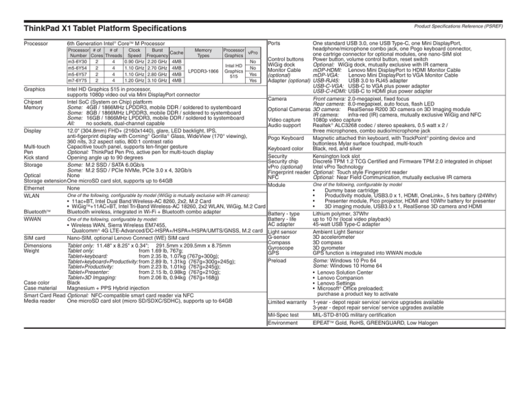 Product Specifications Reference (PSREF) ThinkPad X1 Tablet Platform Specifications 6th Generation Intel® Core™ M Processor One standard USB 3.0, one USB Type-C, one Mini DisplayPort, headphone/microphone combo jack, one Pogo keyboard connector, one cartrige connector for optional modules, one nano-SIM slot Control buttons Power button, volume control button, reset switch 4MB WiGig dock Optional: WiGig dock, mutually exclusive with IR camera 4MB Monitor Cable mDP-HDMI: Lenovo Mini DisplayPort to HDMI Monitor Cable LPDDR3-1866 4MB (optional) mDP-VGA: Lenovo Mini DisplayPort to VGA Monitor Cable 4MB Adapter (optional) USB-RJ45: USB 3.0 to RJ45 adapter USB-C-VGA: USB-C to VGA plus power adapter Graphics Intel HD Graphics 515 in processor, USB-C-HDMI: USB-C to HDMI plus power adapter supports 1080p video out via Mini DisplayPort connector Camera Front camera: 2.0-megapixel, fixed focus Chipset Intel SoC (System on Chip) platform Rear camera: 8.0-megapixel, auto focus, flash LED Memory Some: 4GB / 1866MHz LPDDR3, mobile DDR / soldered to systemboard Optional Cameras 3D camera: RealSense R200 3D camera on 3D Imaging module Some: 8GB / 1866MHz LPDDR3, mobile DDR / soldered to systemboard IR camera: infra-red (IR) camera, mutually exclusive WiGig and NFC Some: 16GB / 1866MHz LPDDR3, mobile DDR / soldered to systemboard Video capture 1080p video capture All: no sockets, dual-channel capable Audio support Realtek® ALC3268 codec / stereo speakers, 0.5 watt x 2 / three microphones, combo audio/microphone jack Display 12.0" (304.8mm) FHD+ (2160x1440), glare, LED backlight, IPS, anti-figerprint display with Corning® Gorilla® Glass, WideView (170° viewing), Pogo Keyboard Magnetic attached thin keyboard, with TrackPoint® pointing device and 360 nits, 3:2 aspect ratio, 800:1 contrast ratio buttonless Mylar surface touchpad, multi-touch Multi-touch Capacitive touch panel, supports ten-finger gesture Keyboard color Black, red, and silver Pen Optional: ThinkPad Pen Pro, active pen for multi-touch display Security Kensington lock slot Kick stand Opening angle up to 90 degrees Security chip Discrete TPM 1.2 TCG Certified and Firmware TPM 2.0 integrated in chipset Storage Some: M.2 SSD / SATA 6.0Gb/s vPro (optional) Intel vPro Technology Some: M.2 SSD / PCIe NVMe, PCIe 3.0 x 4, 32Gb/s Fingerprint reader Optional: Touch style Fingerprint reader Optical None NFC Optional: Near Field Communication, mutually exclusive IR camera Storage extension One microSD card slot, supports up to 64GB One of the following, configurable by model Module Ethernet None • Dummy base cartridge One of the following, configurable by model (WiGig is mutually exclusive with IR camera): • Productivity module, USB3.0 x 1, HDMI, OneLink+, 5 hrs battery (24Whr) WLAN • Presenter module, Pico projector, HDMI and 10Whr battery for presenter • 11ac+BT, Intel Dual Band Wireless-AC 8260, 2x2, M.2 Card • 3D imaging module, USB3.0 x 1, RealSense 3D camera and HDMI • WiGig™+11AC+BT, Intel Tri-Band Wireless-AC 18260, 2x2 WLAN, WiGig, M.2 Card Bluetooth™ Bluetooth wireless, integrated in Wi-Fi + Bluetooth combo adapter Battery - type Lithium polymer, 37Whr One of the following, configurable by model: Battery - life up to 10 hr (local video playback) WWAN AC adapter 45-watt USB Type-C adapter • Wireless WAN, Sierra Wireless EM7455, ® Qualcomm 4G LTE-Advanced/DC-HSPA+/HSPA+/HSPA/UMTS/GNSS, M.2 card Light sensor Ambient Light Sensor G-sensor 3D accelerometer SIM card Nano-SIM, optional Lenovo Connect (WE) SIM card Compass 3D compass Dimensions Tablet only: 11.48" x 8.25" x 0.34"; 291.5mm x 209.5mm x 8.75mm Gyroscope 3D gyrometer Weight Tablet only: from 1.69 lb, 767g; GPS GPS function is integrated into WWAN module Tablet+keyboard: from 2.35 lb, 1.07kg (767g+300g); Preload Some: Windows 10 Pro 64 Tablet+keyboard+Productivity: from 2.89 lb, 1.31kg (767g+300g+245g); Some: Windows 10 Home 64 Tablet+Productivity: from 2.23 lb, 1.01kg (767g+245g); Tablet+Presenter: from 2.15 lb, 0.98kg (767g+210g); • Lenovo Solution Center Tablet+3D Imgaging: from 2.06 lb, 0.94kg (767g+168g) • Lenovo Companion Case color Black • Lenovo Settings Case material Magnesium + PPS Hybrid injection • Microsoft® Office preloaded; purchase a product key to activate Smart Card Read Optional: NFC-compatible smart card reader via NFC Media reader One microSD card slot (micro SD/SDXC/SDHC), supports up to 64GB Limited warranty 1-year - depot repair service/ service upgrades available 3-year - depot repair service/ service upgrades available Mil-Spec test MIL-STD-810G military certification Environment EPEAT™ Gold, RoHS, GREENGUARD, Low Halogen Processor Processor # of # of Clock Burst Number Cores Threads Speed Frequency m3-6Y30 2 4 0.90 GHz 2.20 GHz m5-6Y54 2 4 1.10 GHz 2.70 GHz m5-6Y57 2 4 1.10 GHz 2.80 GHz m7-6Y75 2 4 1.20 GHz 3.10 GHz Ports Cache Memory Types Processor vPro Graphics No Intel HD No Graphics Yes 515 Yes
