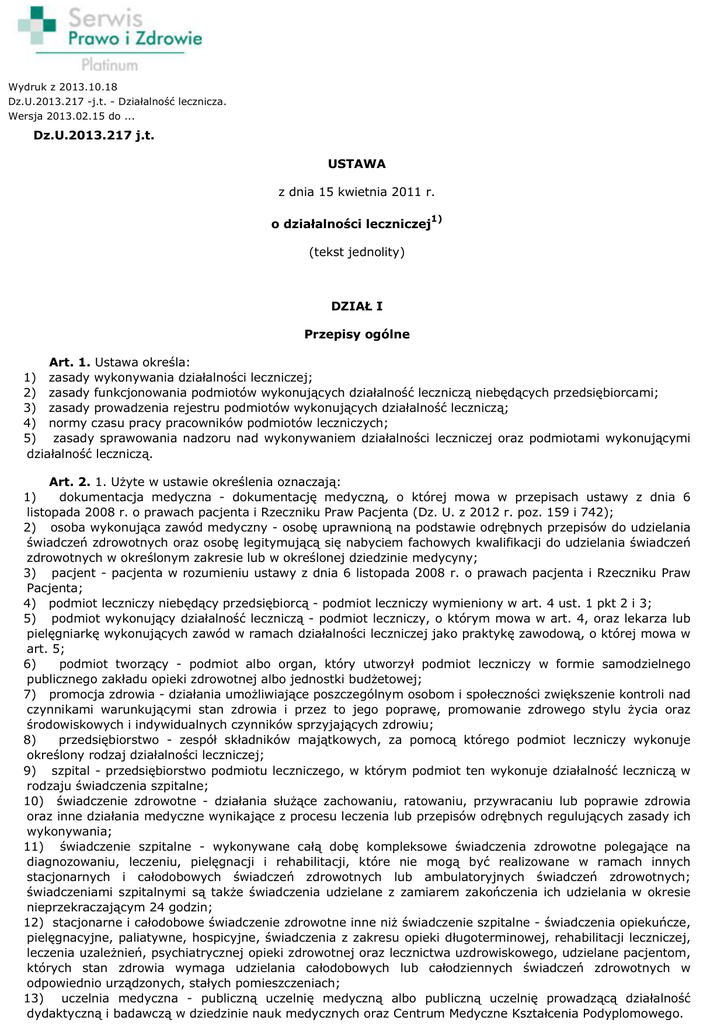 Wydruk z 2013.10.18 Dz.U.2013.217 -j.t. - Działalność lecznicza. Wersja 2013.02.15 do ... Dz.U.2013.217 j.t. USTAWA z dnia 15 kwietnia 2011 r. 1) o działalności leczniczej (tekst jednolity) DZIAŁ I Przepisy ogólne Art. 1. Ustawa określa: 1) zasady wykonywania działalności leczniczej; 2) zasady funkcjonowania podmiotów wykonujących działalność leczniczą niebędących przedsiębiorcami; 3) zasady prowadzenia rejestru podmiotów wykonujących działalność leczniczą; 4) normy czasu pracy pracowników podmiotów leczniczych; 5) zasady sprawowania nadzoru nad wykonywaniem działalności leczniczej oraz podmiotami wykonującymi działalność leczniczą. Art. 2. 1. Użyte w ustawie określenia oznaczają: 1) dokumentacja medyczna - dokumentację medyczną, o której mowa w przepisach ustawy z dnia 6 listopada 2008 r. o prawach pacjenta i Rzeczniku Praw Pacjenta (Dz. U. z 2012 r. poz. 159 i 742); 2) osoba wykonująca zawód medyczny - osobę uprawnioną na podstawie odrębnych przepisów do udzielania świadczeń zdrowotnych oraz osobę legitymującą się nabyciem fachowych kwalifikacji do udzielania świadczeń zdrowotnych w określonym zakresie lub w określonej dziedzinie medycyny; 3) pacjent - pacjenta w rozumieniu ustawy z dnia 6 listopada 2008 r. o prawach pacjenta i Rzeczniku Praw Pacjenta; 4) podmiot leczniczy niebędący przedsiębiorcą - podmiot leczniczy wymieniony w art. 4 ust. 1 pkt 2 i 3; 5) podmiot wykonujący działalność leczniczą - podmiot leczniczy, o którym mowa w art. 4, oraz lekarza lub pielęgniarkę wykonujących zawód w ramach działalności leczniczej jako praktykę zawodową, o której mowa w art. 5; 6) podmiot tworzący - podmiot albo organ, który utworzył podmiot leczniczy w formie samodzielnego publicznego zakładu opieki zdrowotnej albo jednostki budżetowej; 7) promocja zdrowia - działania umożliwiające poszczególnym osobom i społeczności zwiększenie kontroli nad czynnikami warunkującymi stan zdrowia i przez to jego poprawę, promowanie zdrowego stylu życia oraz środowiskowych i indywidualnych czynników sprzyjających zdrowiu; 8) przedsiębiorstwo - zespół składników majątkowych, za pomocą którego podmiot leczniczy wykonuje określony rodzaj działalności leczniczej; 9) szpital - przedsiębiorstwo podmiotu leczniczego, w którym podmiot ten wykonuje działalność leczniczą w rodzaju świadczenia szpitalne; 10) świadczenie zdrowotne - działania służące zachowaniu, ratowaniu, przywracaniu lub poprawie zdrowia oraz inne działania medyczne wynikające z procesu leczenia lub przepisów odrębnych regulujących zasady ich wykonywania; 11) świadczenie szpitalne - wykonywane całą dobę kompleksowe świadczenia zdrowotne polegające na diagnozowaniu, leczeniu, pielęgnacji i rehabilitacji, które nie mogą być realizowane w ramach innych stacjonarnych i całodobowych świadczeń zdrowotnych lub ambulatoryjnych świadczeń zdrowotnych; świadczeniami szpitalnymi są także świadczenia udzielane z zamiarem zakończenia ich udzielania w okresie nieprzekraczającym 24 godzin; 12) stacjonarne i całodobowe świadczenie zdrowotne inne niż świadczenie szpitalne - świadczenia opiekuńcze, pielęgnacyjne, paliatywne, hospicyjne, świadczenia z zakresu opieki długoterminowej, rehabilitacji leczniczej, leczenia uzależnień, psychiatrycznej opieki zdrowotnej oraz lecznictwa uzdrowiskowego, udzielane pacjentom, których stan zdrowia wymaga udzielania całodobowych lub całodziennych świadczeń zdrowotnych w odpowiednio urządzonych, stałych pomieszczeniach; 13) uczelnia medyczna - publiczną uczelnię medyczną albo publiczną uczelnię prowadzącą działalność dydaktyczną i badawczą w dziedzinie nauk medycznych oraz Centrum Medyczne Kształcenia Podyplomowego. 2. Ilekroć w ustawie jest mowa o: 1) kierowniku bez bliższego określenia - rozumie się przez to także zarząd spółki kapitałowej, a w przypadku innych podmiotów wykonujących działalność leczniczą - osobę uprawnioną do kierowania tymi podmiotami i ich reprezentowania na zewnątrz, jeżeli przepisy ustawy nie stanowią inaczej; 2) działalności leczniczej w rodzaju stacjonarne i całodobowe świadczenia zdrowotne bez bliższego określenia - rozumie się przez to działalność leczniczą w rodzaju świadczenia szpitalne, jak i działalność leczniczą w rodzaju stacjonarne i całodobowe świadczenia zdrowotne inne niż szpitalne; 3) pielęgniarce - rozumie się przez to także położną; 4) lekarzu - rozumie się przez to także lekarza dentystę. 3. Przedsiębiorstwo podmiotu leczniczego jest jednostką lokalną w rozumieniu przepisów o statystyce publicznej, dla której nie sporządza się odrębnego bilansu, chyba że podmiot leczniczy postanowi inaczej w regulaminie organizacyjnym, o którym mowa w art. 24. Art. 3. 1. Działalność lecznicza polega na udzielaniu świadczeń zdrowotnych. 2. Działalność lecznicza może również polegać na: 1) promocji zdrowia lub 2) realizacji zadań dydaktycznych i badawczych w powiązaniu z udzielaniem świadczeń zdrowotnych i promocją zdrowia, w tym wdrażaniem nowych technologii medycznych oraz metod leczenia. 3. Podmiot wykonujący działalność leczniczą może uczestniczyć, a podmiot wykonujący działalność leczniczą w zakresie, o którym mowa w ust. 2 pkt 2, uczestniczy w przygotowywaniu osób do wykonywania zawodu medycznego i kształceniu osób wykonujących zawód medyczny na zasadach określonych w odrębnych przepisach regulujących kształcenie tych osób. 4. W ramach struktury organizacyjnej podmiotu leczniczego może zostać wydzielona jednostka organizacyjna, w celu udzielania świadczeń zdrowotnych mieszkańcom domów pomocy społecznej, wychowankom regionalnych placówek opiekuńczo-terapeutycznych lub interwencyjnych ośrodków preadopcyjnych, zlokalizowana na terenie tych podmiotów. 1) Art. 4. 1. Podmiotami leczniczymi są: przedsiębiorcy w rozumieniu przepisów usta