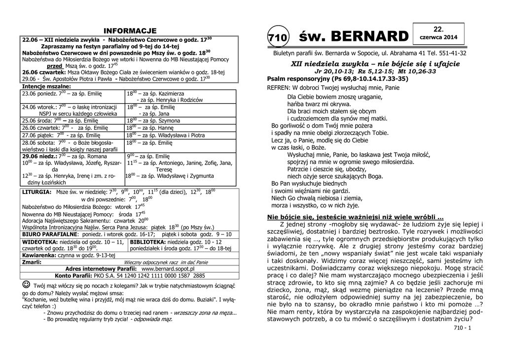 INFORMACJE 30 22.06 – XII niedziela zwykła - Nabożeństwo Czerwcowe o godz. 17 Zapraszamy na festyn parafialny od 9-tej do 14-tej Nabożeństwo Czerwcowe w dni powszednie po Mszy św. o godz. 1830 Nabożeństwa do Miłosierdzia Bożego we wtorki i Nowenna do MB Nieustającej Pomocy przed Mszą św. o godz. 1745 26.06 czwartek: Msza Oktawy Bożego Ciała ze świeceniem wianków o godz. 18-tej 29.06 - Św. Apostołów Piotra i Pawła - Nabożeństwo Czerwcowe o godz. 1730 Intencje mszalne: 23.06 poniedz. 730 – za śp. Emilię 1800 – za śp. Kazimierza - za śp. Henryka i Rodziców 24.06 wtorek.: 700 – o łaskę intronizacji 1800 – za śp. Emilię NSPJ w sercu każdego człowieka - za śp. Jana 25.06 środa: 700 – za śp. Emilię 1800 – za śp. Szymona 26.06 czwartek: 700 - za śp. Emilię 1800 – za śp. Hannę 00 27.06 piątek: 7 - za śp. Emilię 1800 – za śp. Władysława i Piotra 00 28.06 sobota: 7 - o Boże błogosła1800 – za śp. Emilię wieństwo i łaski dla księży naszej parafii 29.06 niedz.: 730 – za śp. Romana 900 – za śp. Emilię 1000 – za śp. Władysława, Józefę, Ryszar- 1115 – za śp. Antoniego, Janinę, Zofię, Jana, da Teresę 1230 – za śp. Henryka, Irenę i zm. z ro1800 – za śp. Władysławę i Zygmunta dziny Łozińskich LITURGIA: Msze św. w niedzielę: 730, 900, 10oo, 1115 (dla dzieci), 1230, 1800 w dni powszednie: 700, 1800 Nabożeństwo do Miłosierdzia Bożego: wtorek 1745 Nowenna do MB Nieustającej Pomocy: środa 1745 Adoracja Najświętszego Sakramentu: czwartek 2000 Wspólnota Intronizacyjna Najśw. Serca Pana Jezusa: piątek 18 30 (po Mszy św.) BIURO PARAFIALNE: poniedz. i wtorek godz. 16-17; piątek i sobota godz. 9 – 10 WIDEOTEKA: niedziela od godz. 10 – 11, BIBLIOTEKA: niedziela godz. 10 - 12 czwartek od godz. 1830 do 1900. poniedziałek i środa godz. 1730 – do 18-tej Kawiarenka: czynna w godz. 9-13-tej Zmarli: Wieczny odpoczynek racz im dać Panie Adres internetowy Parafii: www.bernard.sopot.pl Konto Parafii: PKO S.A. 54 1240 1242 1111 0000 1587 2885 Twój mąż włóczy się po nocach z kolegami? Jak w trybie natychmiastowym ściągnąć go do domu? Należy wysłać mężowi smsa: "Kochanie, weź butelkę wina i przyjdź, mój mąż nie wraca dziś do domu. Buziaki". I wyłączyć telefon :) - Znowu przychodzisz do domu o trzeciej nad ranem - wrzeszczy zona na męza... - Bo prowadzę regularny tryb zycia! - odpowiada mąz. 710 św. BERNARD 22. czerwca 2014 Biuletyn parafii św. Bernarda w Sopocie, ul. Abrahama 41 Tel. 551-41-32 XII niedziela zwykła – nie bójcie się i ufajcie Jr 20,10-13; Rz 5,12-15; Mt 10,26-33 Psalm responsoryjny (Ps 69,8-10.14.17.33-35) REFREN: W dobroci Twojej wysłuchaj mnie, Panie Dla Ciebie bowiem znoszę urąganie, hańba twarz mi okrywa. Dla braci moich stałem się obcym i cudzoziemcem dla synów mej matki. Bo gorliwość o dom Twój mnie pożera i spadły na mnie obelgi złorzeczących Tobie. Lecz ja, o Panie, modlę się do Ciebie w czas łaski, o Boże. Wysłuchaj mnie, Panie, bo łaskawa jest Twoja miłość, spojrzyj na mnie w ogromie swego miłosierdzia. Patrzcie i cieszcie się, ubodzy, niech ożyje serce szukających Boga. Bo Pan wysłuchuje biednych i swoimi więźniami nie gardzi. Niech Go chwalą niebiosa i ziemia, morza i wszystko, co w nich żyje. Nie bójcie się, jesteście ważniejsi niż wiele wróbli … Z jednej strony -mogłoby się wydawać- że ludziom żyje się lepiej i szczęśliwiej, dostatniej i bardziej beztrosko. Tyle rozrywek i możliwości zabawienia się …, tyle ogromnych przedsiębiorstw produkujących tylko i wyłącznie rozrywkę. Ale z drugiej strony jesteśmy coraz bardziej świadomi, że ten „nowy wspaniały świat” nie jest wcale taki wspaniały i taki doskonały. Widzimy coraz więcej nieszczęść, sami jesteśmy ich uczestnikami. Doświadczamy coraz większego niepokoju. Mogę stracić pracę i co dalej? Nie mam wystarczająco mocnego ubezpieczenia i jeśli stracę zdrowie, to kto się mną zajmie? A co będzie jeśli zachoruje mi dziecko, żona, mąż, skąd wezmę pieniądze na leczenie? Przede mną starość, nie odłożyłem odpowiedniej sumy na jej zabezpieczenie, bo nie było na to szansy, bo okradło mnie państwo i kto mi pomoże …? Nie mam renty, która by wystarczyła na zaspokojenie najbardziej podstawowych potrzeb, a co tu mówić o szczęśliwym i dostatnim życiu? 710 - 1 I na to wszystko odpowiedź Chrystusa w dzisiejszej Ewangelii: „Nie bójcie się, nawet włosy na waszych głowach są policzone. Nie bójcie się, jesteście daleko ważniejsi niż wiele wróbli. ” Obyśmy tylko umieli się przyznać do Niego przed ludźmi … Obym tylko umiał wyznać, że jest On Panem mojego życia i uwierzyć, że „policzył nawet włosy na mojej głowie„. Panie w troskach i obawach dnia powszedniego, pozwól mi zobaczyć Twoją -nade mną- opiekę. I pozwól mi się nie bać, bo przecież ważniejszy jestem dla Ciebie niż wiele wróbli. Nie można jednak zapomnieć i o drugiej części dzisiejsze Ewangelii. Słowa Chrystusa: „Do każdego więc, który się przyzna do Mnie przed ludźmi, przyznam się i Ja przed moim Ojcem, który jest w niebie. Lecz kto się Mnie zaprze przed ludźmi, tego zaprę się i Ja przed moim Ojcem, który jest w niebie.” są bardzo zobowiązujące. A co znaczy dzisiaj przyznać się do Chrystusa przed ludźmi? Coraz więcej mamy takich możliwości i okazji. Coraz częściej przyznanie się, „jestem człowiekiem wierzącym” naraża na kpiny i szyderstwa, na społeczny ostracyzm. Wolimy więc nie ryzykować, nie wychylać się, nie obnosić się z naszą wiarą. Zapytałem kiedyś jakiegoś mężczyznę, czy jest katolikiem. Z oburzeniem na twarzy odpowiedział: „Oczywiście księże że jestem katolikiem, nigdy się tego nie zaprę!” Ale kiedy go zapytałem czy co niedzielę chodzi na Mszę odpowiedział z uśmiechem: „Księże ja jestem katolikiem, nie fanatykiem.” Czy o