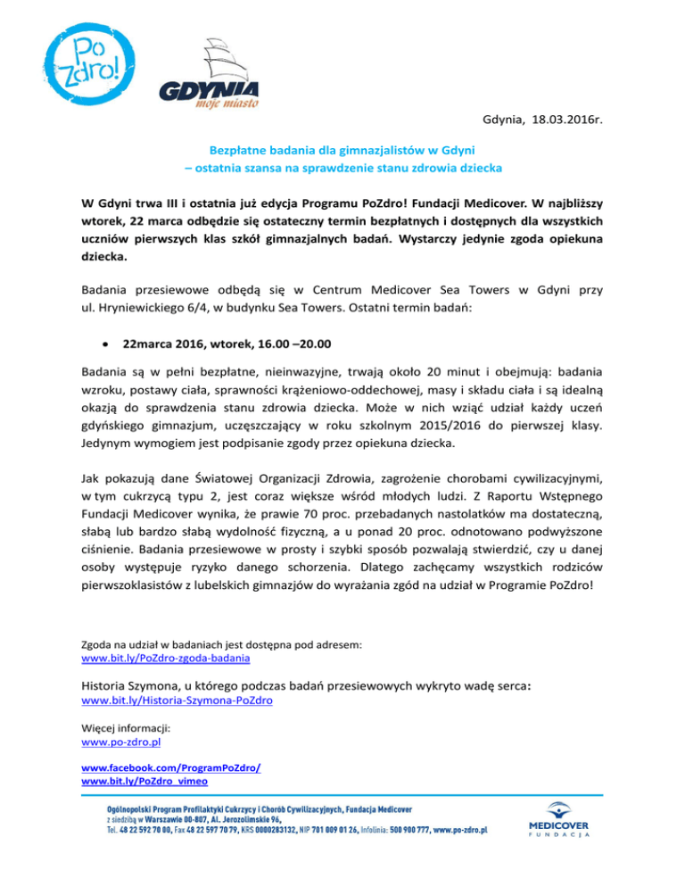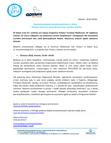 Gdynia, 18.03.2016r. Bezpłatne badania dla gimnazjalistów w Gdyni