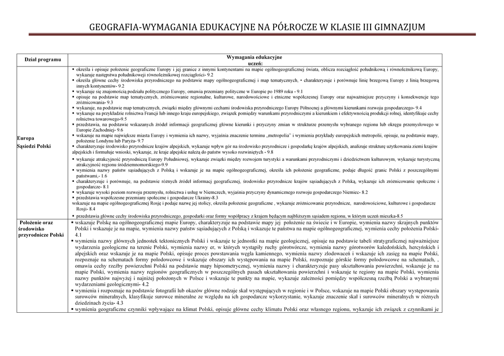GEOGRAFIA-WYMAGANIA EDUKACYJNE NA PÓŁROCZE W KLASIE III GIMNAZJUM Dział programu Europa Sąsiedzi Polski Wymagania edukacyjne uczeń: określa i opisuje położenie geograficzne Europy i jej granice z innymi kontynentami na mapie ogólnogeograficznej świata, oblicza rozciągłość południkową i równoleżnikową Europy, wykazuje następstwa południkoweji równoleżnikowej rozciągłości- 9.2 określa główne cechy środowiska przyrodniczego na podstawie mapy ogólnogeograficznej i map tematycznych, • charakteryzuje i porównuje linię brzegową Europy z linią brzegową innych kontynentów- 9.2 wykazuje się znajomością podziału politycznego Europy, omawia przemiany polityczne w Europie po 1989 roku - 9.1 opisuje na podstawie map tematycznych, zróżnicowanie regionalne, kulturowe, narodowościowe i etniczne współczesnej Europy oraz najważniejsze przyczyny i konsekwencje tego zróżnicowania- 9.3 wykazuje, na podstawie map tematycznych, związki między głównymi cechami środowiska przyrodniczego Europy Północnej a głównymi kierunkami rozwoju gospodarczego- 9.4 wykazuje na przykładzie rolnictwa Francji lub innego kraju europejskiego, związek pomiędzy warunkami przyrodniczymi a kierunkiem i efektywnością produkcji rolnej, identyfikuje cechy rolnictwa towarowego-9.5 przedstawia, na podstawie wskazanych źródeł informacji geograficznej główne kierunki i przyczyny zmian w strukturze przemysłu wybranego regionu lub okręgu przemysłowego w Europie Zachodniej- 9.6 wskazuje na mapie największe miasta Europy i wymienia ich nazwy, wyjaśnia znaczenie terminu „metropolia” i wymienia przykłady europejskich metropolii, opisuje, na podstawie mapy, położenie Londynu lub Paryża- 9.7 charakteryzuje środowisko przyrodnicze krajów alpejskich, wykazuje wpływ gór na środowisko przyrodnicze i gospodarkę krajów alpejskich, analizuje strukturę użytkowania ziemi krajów alpejskich i formułuje wnioski, wykazuje, że kraje alpejskie należą do państw wysoko rozwiniętych - 9.8 wykazuje atrakcyjność przyrodniczą Europy Południowej, wykazuje związki między rozwojem turystyki a warunkami przyrodniczymi i dziedzictwem kulturowym, wykazuje turystyczną atrakcyjność regionu śródziemnomorskiego-9.9 wymienia nazwy państw sąsiadujących z Polską i wskazuje je na mapie ogólnogeograficznej, określa ich położenie geograficzne, podaje długość granic Polski z poszczególnymi państwami,- 1.6 charakteryzuje i porównuje, na podstawie różnych źródeł informacj geograficznej, środowisko przyrodnicze krajów sąsiadujących z Polską, wykazuje ich zróżnicowanie społeczne i gospodarcze- 8.1 wykazuje wysoki poziom rozwoju przemysłu, rolnictwa i usług w Niemczech, wyjaśnia przyczyny dynamicznego rozwoju gospodarczego Niemiec- 8.2 przedstawia współczesne przemiany społeczne i gospodarcze Ukrainy-8.3 wskazuje na mapie ogólnogeograficznej Rosję i podaje nazwę jej stolicy, określa położenie geograficzne , wykazuje zróżnicowanie przyrodnicze, narodowościowe, kulturowe i gospodarcze Rosji- 8.4 przedstawia główne cechy środowiska przyrodniczego, gospodarki oraz formy współpracy z krajem będącym najbliższym sąsiadem regionu, w którym uczeń mieszka-8.5 Położenie oraz środowisko przyrodnicze Polski wskazuje Polskę na ogólnogeograficznej mapie Europy, charakteryzuje na podstawie mapy jej położenie na świecie i w Europie, wymienia nazwy skrajnych punktów Polski i wskazuje je na mapie, wymienia nazwy państw sąsiadujących z Polską i wskazuje te państwa na mapie ogólnogeograficznej, wymienia cechy położenia Polski4.1 wymienia nazwy głównych jednostek tektonicznych Polski i wskazuje te jednostki na mapie geologicznej, opisuje na podstawie tabeli stratygraficznej najważniejsze wydarzenia geologiczne na terenie Polski, wymienia nazwy er, w których wystąpiły ruchy górotwórcze, wymienia nazwy górotworów kaledońskich, hercyńskich i alpejskich oraz wskazuje je na mapie Polski, opisuje proces powstawania węgla kamiennego, wymienia nazwy zlodowaceń i wskazuje ich zasięg na mapie Polski, rozpoznaje na schematach formy polodowcowe i wskazuje obszary ich występowania na mapie Polski, rozpoznaje górskie formy polodowcowe na schematach, , omawia cechy rzeźby powierzchni Polski na podstawie mapy hipsometrycznej, wymienia nazwy i charakteryzuje pasy ukształtowania powierzchni, wskazuje je na mapie Polski, wymienia nazwy regionów geograficznych w poszczególnych pasach ukształtowania powierzchni i wskazuje te regiony na mapie Polski, wymienia nazwy punktów najwyżej i najniżej położonych w Polsce i wskazuje te punkty na mapie, wykazuje zależności pomiędzy współczesną rzeźbą Polski a wybranymi wydarzeniami geologicznymi- 4.2 wymienia i rozpoznaje na podstawie fotografii lub okazów główne rodzaje skał występujących w regionie i w Polsce, wskazuje na mapie Polski obszary występowania surowców mineralnych, klasyfikuje surowce mineralne ze względu na ich gospodarcze wykorzystanie, wykazuje znaczenie skał i surowców mineralnych w różnych dziedzinach życia- 4.3 wymienia geograficzne czynniki wpływające na klimat Polski, opisuje główne cechy klimatu Polski oraz własnego regionu, wykazuje ich związek z czynnikami je GEOGRAFIA-WYMAGANIA EDUKACYJNE NA PÓŁROCZE W KLASIE III GIMNAZJUM kształtującymi, wyjaśnia mechanizm powstawania wiatru halnego i bryzy morskiej- 4.4 wymienia główne rodzaje zasobów naturalnych Polski i własnego regionu: lasów, wód, gleb, surowców mineralnych, korzystając z mapy opisuje ich rozmieszczenie i określa znaczenie gospodarcze