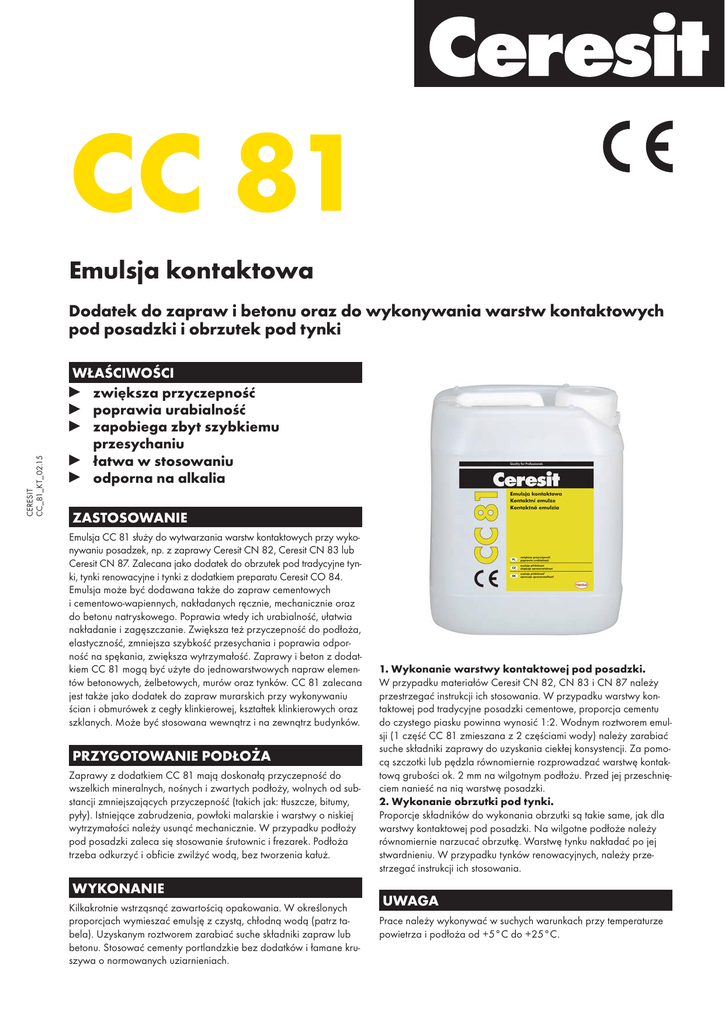 CC 81 Emulsja kontaktowa CERESIT CC_81_KT_02.15 Dodatek do zapraw i betonu oraz do wykonywania warstw kontaktowych pod posadzki i obrzutek pod tynki WŁAŚCIWOŚCI zwiększa przyczepność poprawia urabialność zapobiega zbyt szybkiemu przesychaniu łatwa w stosowaniu odporna na alkalia ZASTOSOWANIE Emulsja CC 81 służy do wytwarzania warstw kontaktowych przy wykonywaniu posadzek, np. z zaprawy Ceresit CN 82, Ceresit CN 83 lub Ceresit CN 87. Zalecana jako dodatek do obrzutek pod tradycyjne tynki, tynki renowacyjne i tynki z dodatkiem preparatu Ceresit CO 84. Emulsja może być dodawana także do zapraw cementowych i cementowo-wapiennych, nakładanych ręcznie, mechanicznie oraz do betonu natryskowego. Poprawia wtedy ich urabialność, ułatwia nakładanie i zagęszczanie. Zwiększa też przyczepność do podłoża, elastyczność, zmniejsza szybkość przesychania i poprawia odporność na spękania, zwiększa wytrzymałość. Zaprawy i beton z dodatkiem CC 81 mogą być użyte do jednowarstwowych napraw elementów betonowych, żelbetowych, murów oraz tynków. CC 81 zalecana jest także jako dodatek do zapraw murarskich przy wykonywaniu ścian i obmurówek z cegły klinkierowej, kształtek klinkierowych oraz szklanych. Może być stosowana wewnątrz i na zewnątrz budynków. PRZYGOTOWANIE PODŁOŻA Zaprawy z dodatkiem CC 81 mają doskonałą przyczepność do wszelkich mineralnych, nośnych i zwartych podłoży, wolnych od substancji zmniejszających przyczepność (takich jak: tłuszcze, bitumy, pyły). Istniejące zabrudzenia, powłoki malarskie i warstwy o niskiej wytrzymałości należy usunąć mechanicznie. W przypadku podłoży pod posadzki zaleca się stosowanie śrutownic i frezarek. Podłoża trzeba odkurzyć i obficie zwilżyć wodą, bez tworzenia kałuż. WYKONANIE Kilkakrotnie wstrząsnąć zawartością opakowania. W określonych proporcjach wymieszać emulsję z czystą, chłodną wodą (patrz tabela). Uzyskanym roztworem zarabiać suche składniki zapraw lub betonu. Stosować cementy portlandzkie bez dodatków i łamane kruszywa o normowanych uziarnieniach. 1. Wykonanie warstwy kontaktowej pod posadzki. W przypadku materiałów Ceresit CN 82, CN 83 i CN 87 należy przestrzegać instrukcji ich stosowania. W przypadku warstwy kontaktowej pod tradycyjne posadzki cementowe, proporcja cementu do czystego piasku powinna wynosić 1:2. Wodnym roztworem emulsji (1 część CC 81 zmieszana z 2 częściami wody) należy zarabiać suche składniki zaprawy do uzyskania ciekłej konsystencji. Za pomocą szczotki lub pędzla równomiernie rozprowadzać warstwę kontaktową grubości ok. 2 mm na wilgotnym podłożu. Przed jej przeschnięciem nanieść na nią warstwę posadzki. 2. Wykonanie obrzutki pod tynki. Proporcje składników do wykonania obrzutki są takie same, jak dla warstwy kontaktowej pod posadzki. Na wilgotne podłoże należy równomiernie narzucać obrzutkę. Warstwę tynku nakładać po jej stwardnieniu. W przypadku tynków renowacyjnych, należy przestrzegać instrukcji ich stosowania. UWAGA Prace należy wykonywać w suchych warunkach przy temperaturze powietrza i podłoża od +5°C do +25°C. ZALECENIA Warstwy wykonane z dodatkiem emulsji CC 81 należy chronić przed zbyt szybkim przesychaniem. SKŁADOWANIE Do 12 miesięcy od daty produkcji, przy składowaniu w chłodnych warunkach i w oryginalnych, nieuszkodzonych opakowaniach. Chronić przed mrozem! OPAKOWANIA Wszelkie porady techniczne można uzyskać pod numerami telefonów: +48 800 120 241 +48 41 3710124. Poza informacjami podanymi w niniejszej karcie technicznej należy przestrzegać zasad sztuki budowlanej, wytycznych branżowych instytutów i stowarzyszeń, przedmiotowych norm krajowych i europejskich, dokumentów aprobacyjnych, przepisów BHP, itp. Wymienione powyżej cechy i właściwości techniczne określone zostały w oparciu o praktyczne doświadczenia oraz przeprowadzone badania. Wszelkie właściwości oraz zastosowania materiałów wykraczające poza zakres podany w niniejszej karcie technicznej wymagają naszego pisemnego potwierdzenia. Wszelkie dane odnoszą się do temperatury podłoża, otoczenia i materiału +23°C oraz wilgotności względnej powietrza 50%, o ile nie podano inaczej. W innych warunkach klimatycznych podane parametry mogą ulec zmianie. Informacje zawarte w niniejszej karcie technicznej, w szczególności zalecenia dotyczące sposobu i warunków aplikacji oraz zakresu zastosowania i użytkowania naszych produktów, zostały opracowane na podstawie naszego doświadczenia zawodowego. Niniejsza karta techniczna określa zakres stosowania materiału i zalecany sposób prowadzenia robót, ale nie może zastąpić zawodowego przygotowania wykonawcy. Producent gwarantuje jakość wyrobu, natomiast nie ma wpływu na warunki i sposób jego użycia. Biorąc pod uwagę, że warunki, w których stosowane są produkty mogą ulegać zmianie, w przypadku wątpliwości zalecane jest przeprowadzenie własnych prób. Nie ponosimy odpowiedzialności z tytułu powyżej wymienionych informacji lub jakiejkolwiek rekomendacji słownej z tym związanej, z wyjątkiem przypadków rażącego niedbalstwa lub winy umyślnej. Niniejsza karta techniczna zastępuje wszystkie poprzednie wersje, mające zastosowanie do tego produktu. Kanister 10 l, 5 l i 2 l. Baza: wodna dyspersja polimerów Gęstość: ok. 1,0 kg/dm3 Proporcje mieszania: patrz tabela Temperatura stosowania: od +5°C do +25°C Czas zużycia: ok. 90 min Umowna zawartość substancji suchej: 43% wg PN-EN 934-3 Wartość pH: 8,6 wg PN-EN 934-3 Maksymalna zawartość chlorków: ≤ 0,1% masy – domieszka bezchlorkowa wg PN-EN 934-3 Maksymalna zawartość alkaliów: ≤ 0,2% masy wg PN-EN 934-3 Oddziaływanie korozyjne: ≤ 10 μA/cm2 wg PN-EN 934-3 Wytrzymałość na ściskanie: ≥ 70% wytrzymałości zaprawy kontrolnej wg PN-EN 934-3 Zawartość powietrza: –po zakończeniu mieszania: –po wydłużonym mieszaniu: –po 1 godz. przetrzymywani
