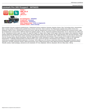 Informacje o produkcie Utworzono 04-03-2017 Lexmark Pro 205 Prospect - 90T6035 Cena : 486,16 zł (netto: 395,25 zł ) Nr katalogowy : 90T6035 Producent : Lexmark Dostępność : Dostępny Stan magazynowy : brak w magazynie Średnia ocena : brak recenzji Klasa produktu: Biurowe urządzenia wielofunkcyjne ; Podstawowe funkcje urządzenia: Drukarka, Kopiarka, Skaner, Faks; Technologia druku: atramentowa; Maks. rozmiar nośnika: A4; Maksymalna szybkość druku (mono): 33 str./min.; Druk w kolorze: Tak; Maksymalna szybkość druku (kolor): 30 str./min.; Wydajność: 5000 str./mies.; Rozdzielczość w poziomie (mono): 2400 dpi; Rozdzielczość w pionie (mono): 1200 dpi; Rozdzielczość w poziomie (kolor): 4800 dpi; Rozdzielczość w pionie (kolor): 2400 dpi; Pojemność podajnika papieru: 100 szt.; Pojemność podajnika dokumentów: 35 szt.; Pojemność tacy odbiorczej: 25 szt.; Obsługiwane nośniki: papier A4, papier A5, papier B5, Papier C5, Papier 10x15, Papier 13x18, papier 10x20, Karta Hagaki, Karta indeksowa, koperty, etykiety papierowe; Obsługiwane systemy operacyjne: Microsoft Windows 2000, Microsoft Windows XP, Microsoft Windows Vista, Microsoft Windows 7, MAC OS Xv10.3.9 lub nowsza; Typ skanera: płaski, technologia CIS; Optyczna rozdzielczość skanowania: 1200 x 2400 dpi; Poziomy wymiar obszaru skanowania: 216 mm; Pionowy wymiar obszaru skanowania: 356 mm; Głębia koloru: 48 bit; Skalowanie: 25-400 %; Złącze zewnętrzne: 1x USB 2.0, Port wydruków bezpośrednich - PictBridge, Bezprzewodowa sieć Ethernet 802.11 g/b, czytnik kart pamięci; Zainstalowane opcje: Podajnik na 100 arkuszy, ADF (automatyczny podajnik dokumentów) pojemność: 35 arkuszy, Tacka odbiorcza na 25 arkuszy, moduł druku dwustronnego; Szybkość wysyłania danych (Upstream): 33,6 kB/s; Zawartość zestawu: Wkład atramentowy czarny, Wkład atramentowy CYAN, Wkład atramentowy MAGENTA, Wkład atramentowy YELLOW, zasilacz i kabel zasilający, sterowniki na CD; Szerokość: 477 mm; Głębokość: 358 mm; Wysokość: 204 mm; Masa netto: 7,98 kg Wygenerowano w programie www.oscGold.com