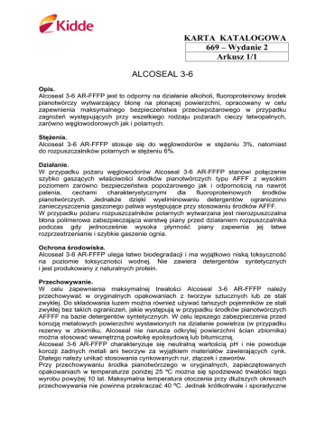 KARTA KATALOGOWA 669 – Wydanie 2 Arkusz 1/1 ALCOSEAL 3-6 Opis. Alcoseal 3-6 AR-FFFP jest to odporny na działanie alkoholi, fluoroproteinowy środek pianotwórczy wytwarzający błonę na płonącej powierzchni, opracowany w celu zapewnienia maksymalnego bezpieczeństwa przeciwpożarowego w przypadku zagrożeń występujących przy wszelkiego rodzaju pożarach cieczy łatwopalnych, zarówno węglowodorowych jak i polarnych. Stężenia. Alcoseal 3-6 AR-FFFP stosuje się do węglowodorów w stężeniu 3%, natomiast do rozpuszczalników polarnych w stężeniu 6%. Działanie. W przypadku pożaru węglowodorów Alcoseal 3-6 AR-FFFP stanowi połączenie szybko gaszących właściwości środków pianotwórczych typu AFFF z wysokim poziomem zarówno bezpieczeństwa popożarowego jak i odpornością na nawrót palenia, cechami charakterystycznymi dla fluoroproteinowych środków pianotwórczych. Jednakże dzięki wyeliminowaniu detergentów ograniczono zanieczyszczenia gaszonego paliwa występujące przy stosowaniu środków AFFF. W przypadku pożaru rozpuszczalników polarnych wytwarzana jest nierozpuszczalna błona polimerowa zabezpieczająca warstwę piany przed działaniem rozpuszczalnika podczas gdy jednocześnie wysoka płynność piany zapewnia jej łatwe rozprzestrzenianie i szybkie gaszenie ognia. Ochrona środowiska. Alcoseal 3-6 AR-FFFP ulega łatwo biodegradacji i ma wyjątkowo niską toksyczność na poziomie toksyczności wodnej. Nie zawiera detergentów syntetycznych i jest produkowany z naturalnych protein. Przechowywanie. W celu zapewnienia maksymalnej trwałości Alcoseal 3-6 AR-FFFP należy przechowywać w oryginalnych opakowaniach z tworzyw sztucznych lub ze stali zwykłej. Do składowania luzem można również używać tańszych pojemników ze stali zwykłej bez takich ograniczeń, jakie występują w przypadku środków pianotwórczych AFFFF na bazie detergentów syntetycznych. W celu lepszego zabezpieczenia przed korozją metalowych powierzchni wystawionych na działanie powietrza (w przypadku rezerwy w zbiorniku, Alcoseal nie narusza odkrytej powierzchni ścian zbiornika) można stosować wewnętrzną powłokę epoksydową lub bitumiczną. Alcoseal 3-6 AR-FFFP charakteryzuje się neutralną wartością pH i nie powoduje korozji żadnych metali ani tworzyw za wyjątkiem materiałów zawierających cynk. Dlatego należy unikać stosowania cynkowanych rur, złączek i zaworów. Przy przechowywaniu środka pianotwórczego w oryginalnych, zapieczętowanych opakowaniach w temperaturze poniżej 25 ºC można się spodziewać trwałości tego wyrobu powyżej 10 lat. Maksymalna temperatura otoczenia przy dłuższych okresach przechowywania nie powinna przekraczać 40 ºC. Jednak krótkotrwałe i sporadyczne okresy wzrostu temperatury nawet powyżej 60 ºC nie mają wpływu na pogorszenie jakości wyrobu. Alcoseal 3-6 AR-FFFP nie jest wrażliwy na cykliczne zamarzanie i rozmrażanie. Charakterystyka wyrobu ALCOSEAL 3-6 AR-FFFP. Rodzaj środka Fluoroproteinowy, odporny na działanie alkoholi (AR-FFFP), pianotwórczego: wytwarzający błonę na płonącej powierzchni. Charakterystyka Bardzo skuteczny środek do gaszenia płonących węglowodorów techniczna: i rozpuszczalników polarnych. Powoduje natychmiastowe tłumienie ognia. Dzięki wyeliminowaniu detergentów jest w wysokim stopniu odporny na zanieczyszczenie paliwa, jak również na nawrót palenia. Stężenia: do gaszenia węglowodorów 3%; rozpuszczalników polarnych 6% Spełnia wymagania norm: UK Defence Specyfications 42-22 i 42-24 Posiadane dopuszczenia: - Underwriters Laboratories jako: FFFP (odpowiadający wymaganiom dla fluoroprotein i AFFF) dla: rozpuszczalników polarnych (alkohole i ketony) dla: MTBE (w stężeniach zarówno 3% jak i 6%) - CNBOP: nr 691/2000/2004 Typowe własności fizyczne Ciężar właściwy pH w temperaturze 20 ºC Lepkość Temperatura zamarzania Najniższa temperatura stosowania Osad w chwili wysyłki Tworzenie błony na płonącej powierzchni Typowe własności piany * Stężenia Liczba spienienia Czas wykraplania 1,09 6,5 – 7,5 Wzrost szybkości ścinania powoduje zmniejszenie lepkości * - 7 ºC - 4 ºC < 0,10 % tak 6% >8 7 min 3% >8 4 min * Próba przy użyciu prądownicy Angus F225; pomiar według wymagań NFPA 11 (A-6-1.1.1). Typowa charakterystyka wysyłkowa Rodzaj pojemnika Prostopadłościenny z tworzywa sztucznego Pojemność 25 [l] lub 5 [gal] Tara 1,2 [kg] Brutto (np. Alcoseal 3-6) 30 lub 27 [kg] Wymiary nominalne 280 x 280 x 440 [mm] Walcowy z tworzywa sztucznego 200/210 [l] lub 45 [gal] 9 [kg] 234/245 [kg] lub 239 [kg] Ø 572 [mm] x 922 [mm] Firma Angus Fire Armour Limited realizuje program ciągłego ulepszania wyrobów. Zastrzega się więc prawo wprowadzania zmian wszelkich publikowanych charakterystyk bez uprzedniego powiadamiania klientów, którzy proszeni są o potwierdzenie aktualności wydania każdej zastosowanej karty wyrobu. Wszelkich dodatkowych informacji udziela firma KIDDE Polska Sp. z o.o. 02-777 Warszawa Al. Komisji Edukacji Narodowej 95, k.18b. lok.2; tel. 644 93 32 ; fax. 644 73 55
