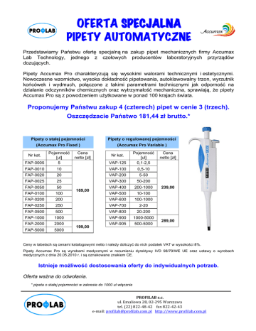 OFERTA SPECJALNA PIPETY AUTOMATYCZNE Przedstawiamy Państwu ofertę specjalną na zakup pipet mechanicznych firmy Accumax Lab Technology, jednego z czołowych producentów laboratoryjnych przyrządów dozujących. Pipety Accumax Pro charakteryzują się wysokimi walorami technicznymi i estetycznymi. Nowoczesne wzornictwo, wysoka dokładność pipetowania, autoklawowalny trzon, wyrzutnik końcówek i wydmuch, połączone z takimi parametrami technicznymi jak odporność na działanie odczynników chemicznych oraz wytrzymałość mechaniczna, sprawiają, że pipety Accumax Pro są z powodzeniem użytkowane w ponad 100 krajach świata. Proponujemy Państwu zakup 4 (czterech) pipet w cenie 3 (trzech). Oszczędzacie Państwo 181,44 zł brutto.* Pipety o stałej pojemności Pipety o regulowanej pojemności (Accumax Pro Fixed ) (Accumax Pro Variable ) FAP-0005 Pojemność [ul] 5 VAP-125 Pojemność [ul] 0,1-2,5 FAP-0010 10 VAP-100 0,5-10 FAP-0020 20 VAP-200 5-50 FAP-0025 25 VAP-300 50-200 VAP-400 200-1000 VAP-500 10-100 Nr kat. Cena netto [zł] Nr kat. FAP-0050 50 FAP-0100 100 FAP-0200 200 VAP-600 100-1000 FAP-0250 250 VAP-700 2-20 FAP-0500 500 VAP-800 20-200 FAP-1000 1000 VAP-900 1000-5000 FAP-2000 2000 VAP-905 500-5000 FAP-5000 5000 169,00 199,00 Cena netto [zł] 239,00 289,00 Ceny w tabelach są cenami katalogowymi netto i należy doliczyć do nich podatek VAT w wysokości 8%. Pipety Accumax Pro są wyrobami medycznymi w rozumieniu dyrektywy IVD 98/79/WE UE oraz ustawy o wyrobach medycznych z dnia 20.05.2010 r. i są oznakowane znakiem CE. Istnieje możliwość dostosowania oferty do indywidualnych potrzeb. Oferta ważna do odwołania. * pipeta o stałej pojemności w zakresie do 1000 ul włącznie PROFILAB s.c. ul. Emaliowa 28, 02-‐295 Warszawa tel. (22) 822-‐48-‐42 fax 822-‐42-‐43 e-‐mail: [email protected] http://www.profilab.com.pl