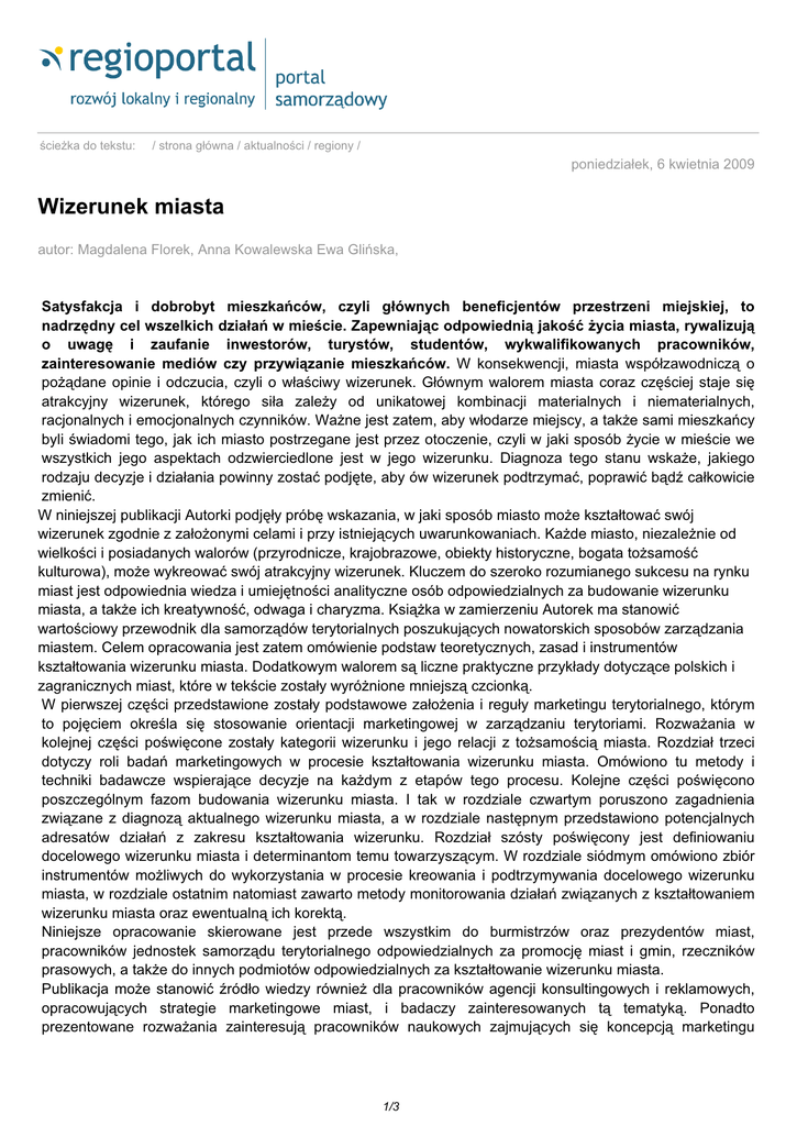 ścieżka do tekstu: / strona główna / aktualności / regiony / poniedziałek, 6 kwietnia 2009 Wizerunek miasta autor: Magdalena Florek, Anna Kowalewska Ewa Glińska, Satysfakcja i dobrobyt mieszkańców, czyli głównych beneficjentów przestrzeni miejskiej, to nadrzędny cel wszelkich działań w mieście. Zapewniając odpowiednią jakość życia miasta, rywalizują o uwagę i zaufanie inwestorów, turystów, studentów, wykwalifikowanych pracowników, zainteresowanie mediów czy przywiązanie mieszkańców. W konsekwencji, miasta współzawodniczą o pożądane opinie i odczucia, czyli o właściwy wizerunek. Głównym walorem miasta coraz częściej staje się atrakcyjny wizerunek, którego siła zależy od unikatowej kombinacji materialnych i niematerialnych, racjonalnych i emocjonalnych czynników. Ważne jest zatem, aby włodarze miejscy, a także sami mieszkańcy byli świadomi tego, jak ich miasto postrzegane jest przez otoczenie, czyli w jaki sposób życie w mieście we wszystkich jego aspektach odzwierciedlone jest w jego wizerunku. Diagnoza tego stanu wskaże, jakiego rodzaju decyzje i działania powinny zostać podjęte, aby ów wizerunek podtrzymać, poprawić bądź całkowicie zmienić. W niniejszej publikacji Autorki podjęły próbę wskazania, w jaki sposób miasto może kształtować swój wizerunek zgodnie z założonymi celami i przy istniejących uwarunkowaniach. Każde miasto, niezależnie od wielkości i posiadanych walorów (przyrodnicze, krajobrazowe, obiekty historyczne, bogata tożsamość kulturowa), może wykreować swój atrakcyjny wizerunek. Kluczem do szeroko rozumianego sukcesu na rynku miast jest odpowiednia wiedza i umiejętności analityczne osób odpowiedzialnych za budowanie wizerunku miasta, a także ich kreatywność, odwaga i charyzma. Książka w zamierzeniu Autorek ma stanowić wartościowy przewodnik dla samorządów terytorialnych poszukujących nowatorskich sposobów zarządzania miastem. Celem opracowania jest zatem omówienie podstaw teoretycznych, zasad i instrumentów kształtowania wizerunku miasta. Dodatkowym walorem są liczne praktyczne przykłady dotyczące polskich i zagranicznych miast, które w tekście zostały wyróżnione mniejszą czcionką. W pierwszej części przedstawione zostały podstawowe założenia i reguły marketingu terytorialnego, którym to pojęciem określa się stosowanie orientacji marketingowej w zarządzaniu terytoriami. Rozważania w kolejnej części poświęcone zostały kategorii wizerunku i jego relacji z tożsamością miasta. Rozdział trzeci dotyczy roli badań marketingowych w procesie kształtowania wizerunku miasta. Omówiono tu metody i techniki badawcze wspierające decyzje na każdym z etapów tego procesu. Kolejne części poświęcono poszczególnym fazom budowania wizerunku miasta. I tak w rozdziale czwartym poruszono zagadnienia związane z diagnozą aktualnego wizerunku miasta, a w rozdziale następnym przedstawiono potencjalnych adresatów działań z zakresu kształtowania wizerunku. Rozdział szósty poświęcony jest definiowaniu docelowego wizerunku miasta i determinantom temu towarzyszącym. W rozdziale siódmym omówiono zbiór instrumentów możliwych do wykorzystania w procesie kreowania i podtrzymywania docelowego wizerunku miasta, w rozdziale ostatnim natomiast zawarto metody monitorowania działań związanych z kształtowaniem wizerunku miasta oraz ewentualną ich korektą. Niniejsze opracowanie skierowane jest przede wszystkim do burmistrzów oraz prezydentów miast, pracowników jednostek samorządu terytorialnego odpowiedzialnych za promocję miast i gmin, rzeczników prasowych, a także do innych podmiotów odpowiedzialnych za kształtowanie wizerunku miasta. Publikacja może stanowić źródło wiedzy również dla pracowników agencji konsultingowych i reklamowych, opracowujących strategie marketingowe miast, i badaczy zainteresowanych tą tematyką. Ponadto prezentowane rozważania zainteresują pracowników naukowych zajmujących się koncepcją marketingu 1/3 terytorialnego oraz studentów uczelni wyższych kształcących się w zakresie: zarządzania i marketingu, administracji, gospodarki przestrzennej, socjologii oraz politologii. Autorki wyrażają nadzieję, że oddana w ręce czytelników publikacja dostarczy rzetelnych i zrozumiałych podstaw metodologicznych i metodycznych oraz będzie źródłem inspiracji dla kreowania atrakcyjnego i unikatowego wizerunku miast polskich. Próby świadomego podejmowania działań w celu kształtowania tożsamości i promowania miast jest ściśle związane z istnieniem i funkcjonowaniem samorządów. Miasta od dawna miały bowiem potrzebę odróżniania się od siebie, podkreślania własnej indywidualności w dążeniu do ekonomicznych, politycznych i socjopsychologicznych celów. Propagowanie miasta nie jest więc ideą nową, ale współcześnie stało się niezwykle popularne w wyniku wzrastającej konkurencji pomiędzy miejscami, jak też w związku ze spadkiem efektywności tradycyjnych instrumentów miejskiego planowania1. W dobie globalizacji i dużej konkurencji pomiędzy miastami coraz większe znaczenie ma już nie tyle wielkość miast czy ich strategiczna lokalizacja, ale niematerialne zasoby decydujące o pozycji na rynku jednostek terytorialnych. Takim zasobem jest przede wszystkim subiektywny wizerunek istniejący w świadomości odbiorców działań miasta. W czasach dominacji kultury medialnej miasta nie mogą nie skorzystać z możliwości wielopoziomowego oddziaływania na świadomość odbiorców. Szczególnego znaczenia nabiera aktywność marketingowa władz samorządowych, ich kreatywność i przedsiębiorczość, wyrażająca się w umiejętności oddziaływania na wizerunek miasta poprzez budowanie jego pożądanej tożsamości. Już klasycy socjologii a zwłaszcza reprezentanci humanistycznej socjologii miasta, której inicjatorami byli F. Znaniecki i M. Weber uważali, że w socjologicznym 