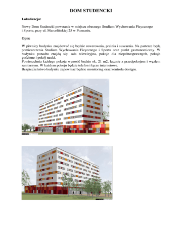 DOM STUDENCKI Lokalizacja: Nowy Dom Studencki powstanie w miejscu obecnego Studium Wychowania Fizycznego i Sportu, przy ul. Marcelińskiej 25 w Poznaniu. Opis: W piwnicy budynku znajdować się będzie rowerownia, pralnia i suszarnia. Na parterze będą pomieszczenia Studium Wychowania Fizycznego i Sportu oraz punkt gastronomiczny. W budynku ponadto znajdą się: sala telewizyjna, pokoje dla niepełnosprawnych, pokoje gościnne i pokój nauki. Powierzchnia każdego pokoju wynosić będzie ok. 21 m2, łącznie z przedpokojem i węzłem sanitarnym. W każdym pokoju będzie telefon i łącze internetowe. Bezpieczeństwo budynku zapewniać będzie monitoring oraz kontrola dostępu. Projekt architektoniczny: Autorzy Projektu: mgr inż. arch. WOJCIECH KRAWCZUK mgr inż. arch. MARCIN SAKSON mgr inż. arch. PAWEŁ KOBRYŃSKI Współpraca: stud. arch.ARKADIUSZ SZCZEREK stud. arch PAULINA PISKUŁA stud. arch. MARTA PIETRUCHA