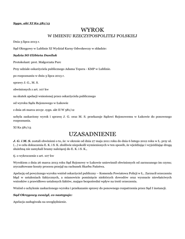 Sygn. akt XI Ka 581/13 WYROK W IMIENIU RZECZYPOSPOLITEJ POLSKIEJ Dnia 3 lipca 2013 r. Sąd Okręgowy w Lublinie XI Wydział Karny Odwoławczy w składzie: Sędzia SO Elżbieta Daniluk Protokolant: prot. Małgorzata Purc Przy udziale oskarżyciela publicznego Adama Tepera - KMP w Lublinie. po rozpoznaniu w dniu 3 lipca 2013 r. sprawy J. G., M. S. obwinionych z art. 107 kw na skutek apelacji wniesionej przez oskarżyciela publicznego od wyroku Sądu Rejonowego w Łukowie z dnia 26 marca 2013r. sygn. akt II W 581/12 uchyla zaskarżony wyrok i sprawę J. G. oraz M. S. przekazuje Sądowi Rejonowemu w Łukowie do ponownego rozpoznania. XI Ka 581/13 UZASADNIENIE J. G. i M. S. zostali obwinieni o to, że: w okresie od dnia 27 maja 2011 roku do dnia 6 lutego 2012 roku w Ł. przy ul. (...) w celu dokuczenia E. K. i S. K. złośliwie niepokoili wymienionych w ten sposób, że wjeżdżając i wyjeżdżając drogą służebną nie zamykali bramy należącej do E. K. i S. K., tj. o wykroczenie z art. 107 kw Wyrokiem z dnia 26 marca 2013 roku Sąd Rejonowy w Łukowie uniewinnił obwinionych od zarzucanego im czynu; zryczałtowane koszty procesu przejął na rachunek Skarbu Państwa. Apelację od powyższego wyroku wniósł oskarżyciel publiczny – Komenda Powiatowa Policji w Ł.. Zarzucił orzeczeniu błąd w ustaleniach faktycznych, a mianowicie pominięcie niektórych dowodów oraz wysnucie niewłaściwych wniosków z prawidłowo ustalonych faktów, mające bezpośredni wpływ na treść orzeczenia. Wniósł o uchylenie zaskarżonego wyroku i przekazanie sprawy do ponownego rozpatrzenia przez Sąd I instancji. Sąd Okręgowy zważył, co następuje: Apelacja zasługiwała na uwzględnienie. Zaskarżony wyrok jest wadliwy, bowiem został wydany w konsekwencji jednostronnej i fragmentarycznej oceny dowodów, nieuwzględnienia z obrazą art. 4, 7, 366 i 410 kpk wszystkich istotnych dla rozstrzygnięcia sprawy okoliczności, oraz obrazą przepisu art. 424 kpk. Kontrola odwoławcza wykazała, że Sąd Rejonowy przeprowadził postępowanie dowodowe w sposób mało dokładny, pomijając szereg dowodów i wynikających z nich okoliczności, a zachowanie obwinionych ocenił w sposób fragmentaryczny. Poczynione ustalenia faktyczne nie mogą być zatem uznane za trafne. Sam fakt korzystania przez obwinionych z drogi koniecznej, a przebiegającej przez nieruchomość, której właścicielami są pokrzywdzeni nie jest w sprawie kwestionowany i nie budzi wątpliwości. Kwestią natomiast, która wymagała rozważenia w sprawie jest to, czy sposób korzystania przez obwinionych z obciążonej w ten sposób nieruchomości, ogrodzonej i z bramą wjazdową, wyczerpuje znamiona zarzucanego im wykroczenia. Obwinieni do zarzucanych im czynów nie przyznali się. W swoich wyjaśnieniach wskazywali, iż nie zamykają bramy wjazdowej, albowiem pozostawienie samochodów we wjeździe w celu zamknięcia bramy powoduje korek uliczny i stwarza zagrożenie bezpieczeństwa w ruchu drogowym z uwagi na odległość bramy wjazdowej od nawierzchni jezdni, która jest o połowę mniejsza niż długość ich samochodów. Oceniając zgromadzony w sprawie materiał dowodowy Sąd Rejonowy uznał, iż nie sposób doszukać się w postępowaniu obwinionych niezbędnego dla bytu wykroczenia z art. 107 kw znamienia złośliwości, co z kolei skutkowało wydaniem wyroku uniewinniającego. Istotnie, wskazywane przez obu obwinionych przyczyny niezamykania bramy w sytuacji opuszczania posesji, mogą wskazywać na brak tego elementu czynu w ich zachowaniu, to należy dostrzec, iz poza zakresem uwagi Sądu pozostały powody, które zadecydowały o tym, iż brama nie była przez nich zamykana również podczas jazdy w kierunku odwrotnym, a mianowicie przy wjeżdżaniu na posesję. Sąd meritii, z przyczyn zupełnie niezrozumiałych i przy tym w sposób nieuprawniony, tak postępowanie dowodowe jak i ocenę zgromadzonego w sprawie materiału dowodowego ograniczył wyłącznie do fragmentu czynności sprawczych zarzuconych obu obwinionym, pomijając równocześnie przy tym treści wynikające z zeznań pokrzywdzonych oraz świadków – A. M., Z. M., A. K., jak również protokołu odtworzenia utrwalonych zapisów monitoringu. Te dowody i wynikające z nich okoliczności, wbrew dyspozycji art. 410, 7 i 366 kpk, pozostały poza zakresem uwagi Sądu I instancji, o czy wprost świadczy stwierdzenie zawarte w pisemnych motywach wyroku k.126 – zdanie pierwsze. Uchybienie niniejsze stanowi jednocześnie rażącą obrazę art. 424§1 pkt.1 kpk, która również niewątpliwie miała wpływ na treść wyroku. Z tych przyczyn zaskarżony wyrok musiał zostać uchylony. Przy ponownym rozpoznaniu sprawy Sąd Rejonowy przeprowadzi postępowanie dowodowe od początku. Wnikliwie przesłucha obwinionych (o ile zechcą oni składać wyjaśnienia) i świadków, nie tracąc z pola uwagi granic rozpoznania sprawy zakreślonych we wnioskach o ukaranie. Wyeliminuje błędy w zakresie postępowania dowodowego o których była mowa powyżej – ich charakter wskazuje jednoznacznie na sposób ich usunięcia. Zgromadzony materiał dowodowy podda kompleksowej, pełnej ocenie stosując reguły zawarte w art. 7 kpk, posługując się zasadami prawidłowego rozumowania i doświadczenia życiowego. W razie potrzeby, sporządzi uzasadnienie zaskarżonego wyroku odpowiadające wymogom art. 424 kpk. Marginalnie należy wskazać, iż stosownie do uregulowania art. 413§1 pkt.4 kpk, każdy wyrok winien zawierać przytoczenie opisu i kwalifikacji prawnej czynu, którego popełnienie zarzucił oskarżyciel, co oznacza brak uprawnień sądu orzekającego do dokonywania w tym zakresie jakichkolwiek modyfikacji. Innymi słowy – komparacja wyroku winna być dokładnym powtórzeniem czynu zarzuconego przez oskarżyciela każdemu z obwinionych ze wszystkimi jego elementami. Z tych wszystkich powodów, Sąd Okręgowy orzekł jak w wyroku.