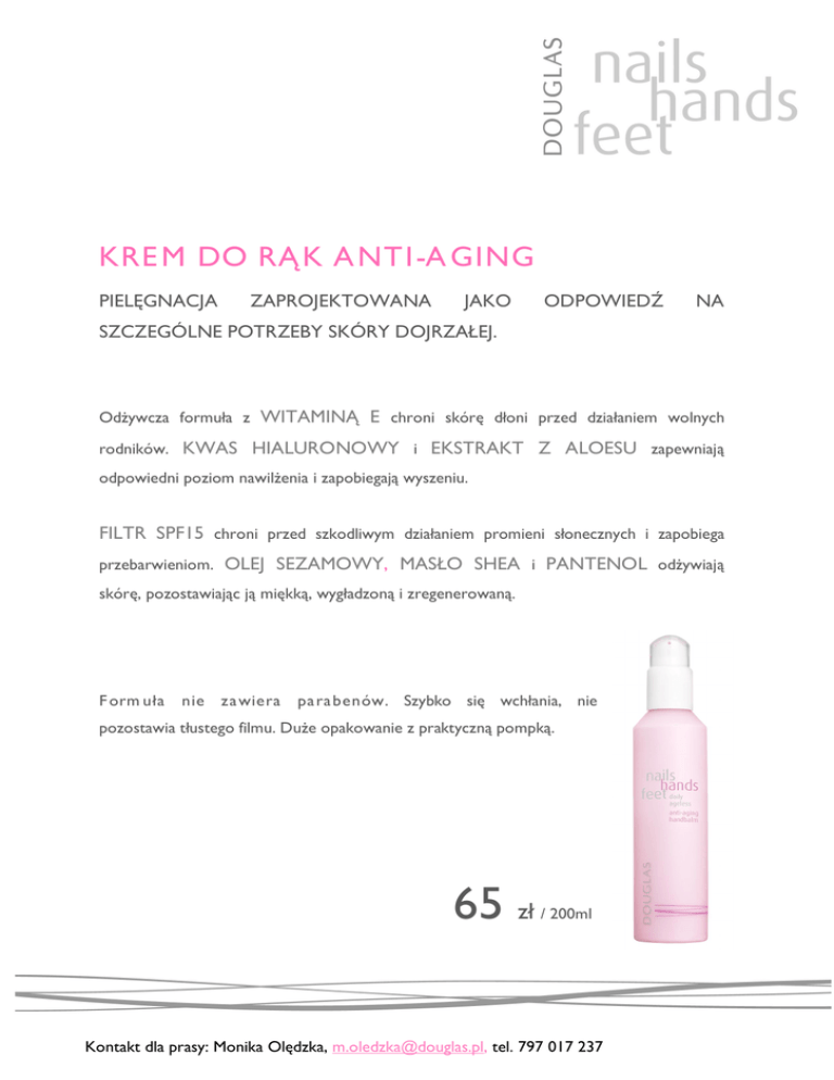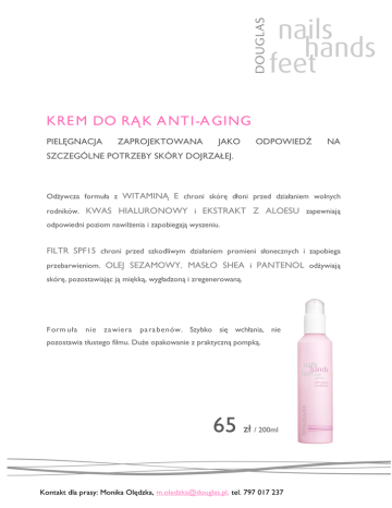 KRE M DO RĄ K A NT I-A GING PIELĘGNACJA ZAPROJEKTOWANA JAKO ODPOWIEDŹ NA SZCZEGÓLNE POTRZEBY SKÓRY DOJRZAŁEJ. Odżywcza formuła z WITAMINĄ E chroni skórę dłoni przed działaniem wolnych rodników. KWAS HIALURONOWY i EKSTRAKT Z ALOESU zapewniają odpowiedni poziom nawilżenia i zapobiegają wyszeniu. FILTR SPF15 chroni przed szkodliwym działaniem promieni słonecznych i zapobiega przebarwieniom. OLEJ SEZAMOWY, MASŁO SHEA i PANTENOL odżywiają skórę, pozostawiając ją miękką, wygładzoną i zregenerowaną. F orm uła nie za wiera pa ra benów. Szybko się wchłania, nie pozostawia tłustego filmu. Duże opakowanie z praktyczną pompką. 65 zł / 200ml Kontakt dla prasy: Monika Olędzka, [email protected], tel. 797 017 237