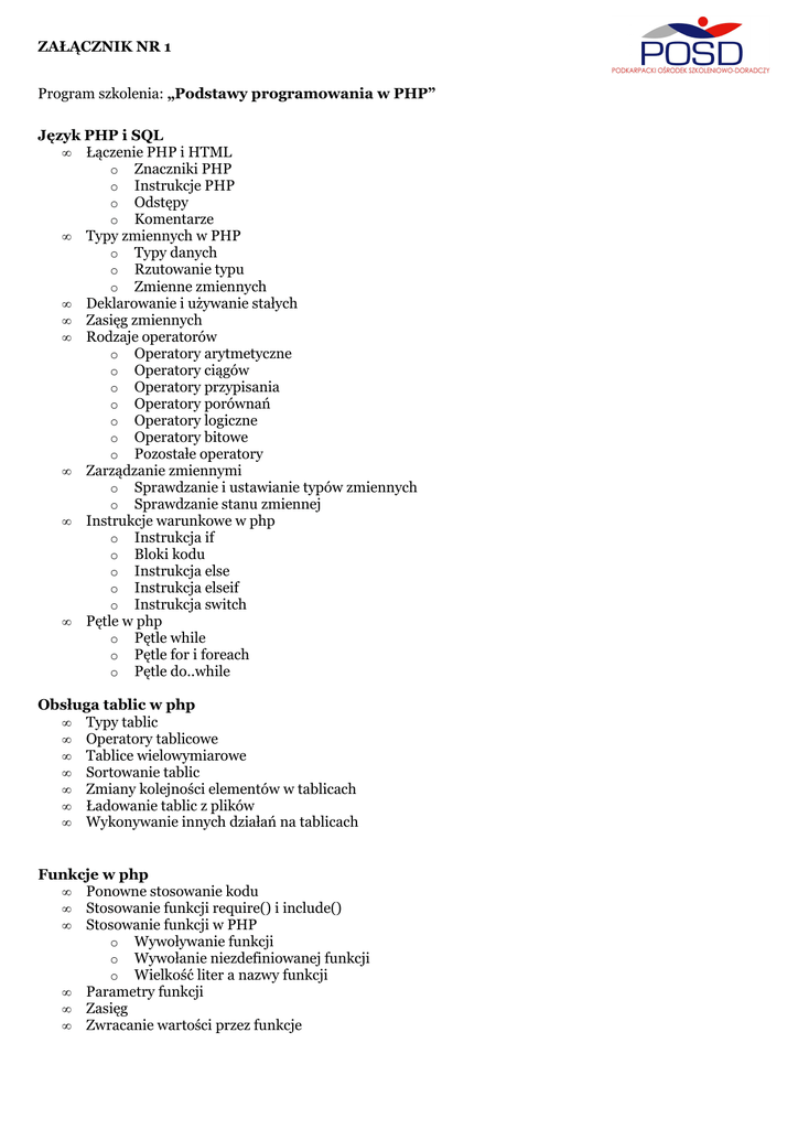ZAŁĄCZNIK NR 1 Program szkolenia: „Podstawy programowania w PHP” Język PHP i SQL • Łączenie PHP i HTML o Znaczniki PHP o Instrukcje PHP o Odstępy o Komentarze • Typy zmiennych w PHP o Typy danych o Rzutowanie typu o Zmienne zmiennych • Deklarowanie i używanie stałych • Zasięg zmiennych • Rodzaje operatorów o Operatory arytmetyczne o Operatory ciągów o Operatory przypisania o Operatory porównań o Operatory logiczne o Operatory bitowe o Pozostałe operatory • Zarządzanie zmiennymi o Sprawdzanie i ustawianie typów zmiennych o Sprawdzanie stanu zmiennej • Instrukcje warunkowe w php o Instrukcja if o Bloki kodu o Instrukcja else o Instrukcja elseif o Instrukcja switch • Pętle w php o Pętle while o Pętle for i foreach o Pętle do..while Obsługa tablic w php • Typy tablic • Operatory tablicowe • Tablice wielowymiarowe • Sortowanie tablic • Zmiany kolejności elementów w tablicach • Ładowanie tablic z plików • Wykonywanie innych działań na tablicach Funkcje w php • Ponowne stosowanie kodu • Stosowanie funkcji require() i include() • Stosowanie funkcji w PHP o Wywoływanie funkcji o Wywołanie niezdefiniowanej funkcji o Wielkość liter a nazwy funkcji • Parametry funkcji • Zasięg • Zwracanie wartości przez funkcje Łączenie się z bazą MySQL za pomocą PHP • Ogólnie o działaniu baza danych • Wykonywanie zapytań do bazy danych z poziomu strony WWW o Sprawdzenie poprawności wpisanych danych o Ustanawianie połączenia z bazą danych o Wybór właściwej bazy danych o Wysyłanie zapytań do bazy danych o Odczytywanie rezultatów zapytań o Zamykanie połączenia z bazą danych • Używanie instrukcji przygotowywanych • Używanie innych interfejsów bazodanowych PHP Operacje na bazach danych • Tworzenie zapytań w MySQL • Pobieranie wyniku • Pobieranie opisu danych • Korzystanie z wielokrotnych połączeń • Kontrola błędów • Tworzenie baz danych MySQL za pomocą PHP • Typy danych MySQL • Funkcje MySQL Uwierzytelnianie z wykorzystaniem PHP i MySQL • Identyfikacja użytkowników • Implementacja kontroli dostępu • Metody uwierzytelniania • Implementacja własnej metody uwierzytelniania Sesje w PHP • Podstawowa zasada działania sesji • Implementacja prostych sesji • Konfiguracja kontroli sesji • Implementacja uwierzytelniania w kontroli sesji Grafika • Omówienie możliwości • Grafiki HTML • Tworzenie obrazków przy użyciu biblioteki gd • Rozwiązywanie problemów