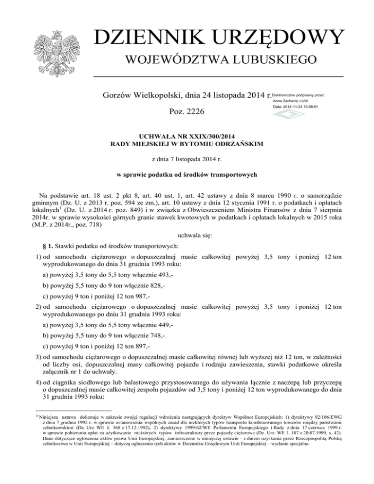 DZIENNIK URZĘDOWY WOJEWÓDZTWA LUBUSKIEGO Gorzów Wielkopolski, dnia 24 listopada 2014 r.Elektronicznie podpisany przez: Anna Zacharia; LUW Poz. 2226 Data: 2014-11-24 13:08:51 UCHWAŁA NR XXIX/300/2014 RADY MIEJSKIEJ W BYTOMIU ODRZAŃSKIM z dnia 7 listopada 2014 r. w sprawie podatku od środków transportowych Na podstawie art. 18 ust. 2 pkt 8, art. 40 ust. 1, art. 42 ustawy z dnia 8 marca 1990 r. o samorządzie gminnym (Dz. U. z 2013 r. poz. 594 ze zm.), art. 10 ustawy z dnia 12 stycznia 1991 r. o podatkach i opłatach lokalnych1 (Dz. U. z 2014 r. poz. 849) i w związku z Obwieszczeniem Ministra Finansów z dnia 7 sierpnia 2014r. w sprawie wysokości górnych granic stawek kwotowych w podatkach i opłatach lokalnych w 2015 roku (M.P. z 2014r., poz. 718) uchwala się: § 1. Stawki podatku od środków transportowych: 1) od samochodu ciężarowego o dopuszczalnej masie całkowitej powyżej 3,5 tony i poniżej 12 ton wyprodukowanego do dnia 31 grudnia 1993 roku: a) powyżej 3,5 tony do 5,5 tony włącznie 493,b) powyżej 5,5 tony do 9 ton włącznie 828,c) powyżej 9 ton i poniżej 12 ton 987,2) od samochodu ciężarowego o dopuszczalnej masie całkowitej powyżej 3,5 tony i poniżej 12 ton wyprodukowanego po dniu 31 grudnia 1993 roku: a) powyżej 3,5 tony do 5,5 tony włącznie 449,b) powyżej 5,5 tony do 9 ton włącznie 748,c) powyżej 9 ton i poniżej 12 ton 897,3) od samochodu ciężarowego o dopuszczalnej masie całkowitej równej lub wyższej niż 12 ton, w zależności od liczby osi, dopuszczalnej masy całkowitej pojazdu i rodzaju zawieszenia, stawki podatkowe określa załącznik nr 1 do uchwały. 4) od ciągnika siodłowego lub balastowego przystosowanego do używania łącznie z naczepą lub przyczepą o dopuszczalnej masie całkowitej zespołu pojazdów od 3,5 tony i poniżej 12 ton wyprodukowanego do dnia 31 grudnia 1993 roku: ______________________ 1] Niniejsza ustawa dokonuje w zakresie swojej regulacji wdrożenia następujących dyrektyw Wspólnot Europejskich: 1) dyrektywy 92/106/EWG z dnia 7 grudnia 1992 r. w sprawie ustanowienia wspólnych zasad dla niektórych typów transportu kombinowanego towarów między państwami członkowskimi (Dz. Urz. WE L 368 z 17.12.1992), 2) dyrektywy 1999/62/WE Parlamentu Europejskiego i Rady z dnia 17 czerwca 1999 r. w sprawie pobierania opłat za użytkowanie niektórych typów infrastruktury przez pojazdy ciężarowe (Dz. Urz. WE L 187 z 20.07.1999, s. 42). Dane dotyczące ogłoszenia aktów prawa Unii Europejskiej, zamieszczone w niniejszej ustawie - z dniem uzyskania przez Rzeczpospolitą Polską członkostwa w Unii Europejskiej – dotyczą ogłoszenia tych aktów w Dzienniku Urzędowym Unii Europejskiej – wydanie specjalne. Dziennik Urzędowy Województwa Lubuskiego –2– Poz. 2226 a) od 3,5 tony do 5,5 tony włącznie 1.153,b) powyżej 5,5 ton do 9 ton włącznie 1.454,c) powyżej 9 ton i poniżej 12 ton 1.886,5) od ciągnika siodłowego lub balastowego przystosowanego do używania łącznie z naczepą lub przyczepą o dopuszczalnej masie całkowitej zespołu pojazdów od 3,5 tony i poniżej 12 ton wyprodukowanego po dniu 31 grudnia 1993 roku: a) od 3,5 tony do 5,5 tony włącznie 1.051,b) powyżej 5,5 ton do 9 ton włącznie 1.324,c) powyżej 9 ton a poniżej 12 ton 1.713,6) od ciągnika siodłowego lub balastowego przystosowanego do używania łącznie z naczepą lub przyczepą o dopuszczalnej masie całkowitej zespołu pojazdów równej lub wyższej niż 12 ton – stawki podatkowe określa załącznik nr 2 do uchwały. 7) od przyczepy lub naczepy, które łącznie z pojazdem silnikowym posiadają dopuszczalną masę całkowitą od 7 ton i poniżej 12 ton wyprodukowane do dnia 31 grudnia 1993 roku, z wyjątkiem związanych wyłącznie z działalnością rolniczą prowadzoną przez podatnika podatku rolnego: a) od 7 ton do 10 ton włącznie 987,b) powyżej 10 ton a poniżej 12 ton 1.153,8) od przyczepy lub naczepy, które łącznie z pojazdem silnikowym posiadają dopuszczalną masę całkowitą od 7 ton i poniżej 12 ton wyprodukowane po dniu 31 grudnia 1993 roku, z wyjątkiem związanych wyłącznie z działalnością rolniczą prowadzoną przez podatnika podatku rolnego: a) od 7 ton do 10 ton włącznie 897,b) powyżej 10 ton a poniżej 12 ton 1.051,9) od przyczepy lub naczepy, które łącznie z pojazdem silnikowym posiadają dopuszczalną masę całkowitą równą lub wyższą niż 12 ton, z wyjątkiem związanych wyłącznie z działalnością rolniczą prowadzoną przez podatnika podatku rolnego, stawki podatkowe określa załącznik nr 3 do uchwały. 10) od autobusu wyprodukowanego do dnia 31 grudnia 1993 roku w zależności od liczby miejsc do siedzenia: a) mniejszej niż 30 miejsc 1.153,b) równej lub wyższej niż 30 miejsc 1.454,11) od autobusu wyprodukowanego po dniu 31 grudnia 1993 roku w zależności od liczby miejsc do siedzenia: a) mniejszej niż 30 miejsc 1.051,b) równej lub wyższej niż 30 miejsc 1.324,§ 2. Traci moc uchwała Nr XXIII/220/2013 Rady Miejskiej w Bytomiu Odrzańskim z dnia 25 października 2013 roku w sprawie podatku od środków transportowych. § 3. Wykonanie uchwały powierza się Burmistrzowi Bytomia Odrzańskiego. § 4. Uchwała wchodzi w życie po upływie 14 dni od dnia ogłoszenia w Dzienniku Urzędowym Województwa Lubuskiego, a określone w niej stawki obowiązują od dnia 1 stycznia 2015 roku. Przewodniczący Rady Miejskiej Andrzej Chmielewski Dziennik Urzędowy Województwa Lubuskiego –3– Poz. 2226 Załącznik Nr 1 do Uchwały Nr XXIX/300/2014 Rady Miejskiej w Bytomiu Odrzańskim z dnia 7 listopada 2014 r. Stawki podatku od środków transportowych od samochodów ciężarowych o dopuszczalnej masie całkowitej równej lub wyższej niż 12 ton Liczba osi i dopuszczalna masa całkowita w tonach Nie mniej niż Mniej niż Stawka podatku (w złotych) Oś jezdna (osie jezdne) z zawieszeniem pneumatycznym lub zawieszeniem uznanym za równoważne Inne systemy zawieszenia osi jezdny