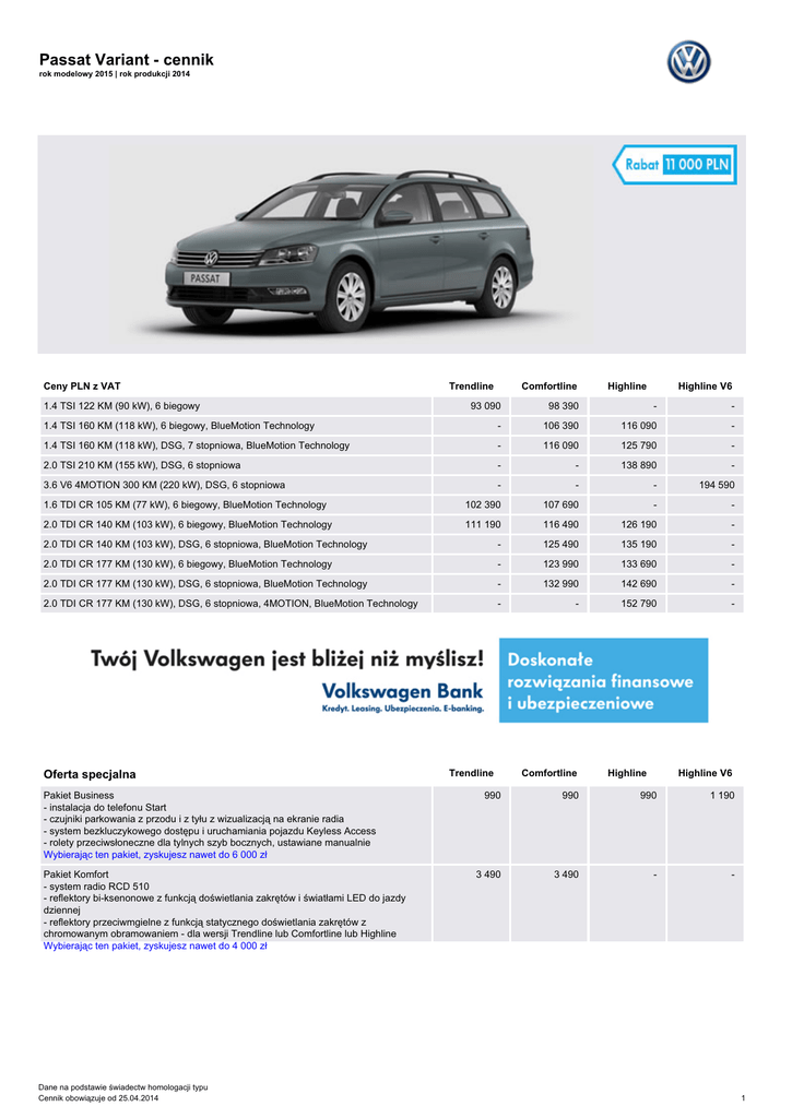 Passat Variant - cennik rok modelowy 2015 | rok produkcji 2014 Ceny PLN z VAT 1.4 TSI 122 KM (90 kW), 6 biegowy Trendline Comfortline Highline Highline V6 93 090 98 390 - - 1.4 TSI 160 KM (118 kW), 6 biegowy, BlueMotion Technology - 106 390 116 090 - 1.4 TSI 160 KM (118 kW), DSG, 7 stopniowa, BlueMotion Technology - 116 090 125 790 - 2.0 TSI 210 KM (155 kW), DSG, 6 stopniowa - - 138 890 - 3.6 V6 4MOTION 300 KM (220 kW), DSG, 6 stopniowa - - - 194 590 1.6 TDI CR 105 KM (77 kW), 6 biegowy, BlueMotion Technology 102 390 107 690 - - 2.0 TDI CR 140 KM (103 kW), 6 biegowy, BlueMotion Technology 111 190 116 490 126 190 - 2.0 TDI CR 140 KM (103 kW), DSG, 6 stopniowa, BlueMotion Technology - 125 490 135 190 - 2.0 TDI CR 177 KM (130 kW), 6 biegowy, BlueMotion Technology - 123 990 133 690 - 2.0 TDI CR 177 KM (130 kW), DSG, 6 stopniowa, BlueMotion Technology - 132 990 142 690 - 2.0 TDI CR 177 KM (130 kW), DSG, 6 stopniowa, 4MOTION, BlueMotion Technology - - 152 790 - Oferta specjalna Pakiet Business - instalacja do telefonu Start - czujniki parkowania z przodu i z tyłu z wizualizacją na ekranie radia - system bezkluczykowego dostępu i uruchamiania pojazdu Keyless Access - rolety przeciwsłoneczne dla tylnych szyb bocznych, ustawiane manualnie Wybierając ten pakiet, zyskujesz nawet do 6 000 zł Pakiet Komfort - system radio RCD 510 - reflektory bi-ksenonowe z funkcją doświetlania zakrętów i światłami LED do jazdy dziennej - reflektory przeciwmgielne z funkcją statycznego doświetlania zakrętów z chromowanym obramowaniem - dla wersji Trendline lub Comfortline lub Highline Wybierając ten pakiet, zyskujesz nawet do 4 000 zł Dane na podstawie świadectw homologacji typu Cennik obowiązuje od 25.04.2014 Trendline Comfortline Highline Highline V6 990 990 990 1 190 3 490 3 490 - - 1 Passat Variant - cennik Wyposażenie standardowe Trendline Comfortline Highline Highline V6 Kierunkowskazy boczne (LED) zintegrowane w obudowach lusterek S S S S Listwy na osłonie wlotu powietrza do chłodnicy, chromowane S S S S Oznaczenie BlueMotion Technology na pokrywie bagażnika - dla BMT S S S - Szyby termoizolacyjne S S S S Światła do jazdy dziennej S S S S Zderzaki, obudowy lusterek zewnętrznych i klamki lakierowane w kolorze nadwozia S S S S Listwy dookoła szyb bocznych, chromowane - S S S Listwy w dolnej części drzwi oraz zderzaka przedniego, czarne S - - - Listwy w dolnej części drzwi oraz zderzaka przedniego, chromowane - S S S Listwy progowe ze stali szlachetnej z napisem "Passat" - - S S Reflektory przeciwmgielne z funkcją statycznego doświetlania zakrętów, z chromowanym obramowaniem O O S S Zawieszenie z adaptacyjną regulacją "DCC", nadwozie obniżone o ok. 10 mm - dla 2.0 TSI 210 KM i V6 4MOTION - O S S Relingi dachowe, czarne S S - - Relingi dachowe, chromowane - - S S Końcówki układu wydechowego, dwie chromowane - dla wersji V6 4MOTION - - - S Podłokietnik z przodu regulowany na wysokość, ze schowkiem S S S S Schowek w desce rozdzielczej po stronie pasażera, zamykany, podświetlany, z funkcją chłodzenia S S S S Zegarek analogowy w środkowej części deski rozdzielczej S S S S Schowek w konsoli środkowej z przodu z 2 miejscami na napoje i gniazdem 12V S - - - Schowek w konsoli środkowej z przodu z 2 miejscami na napoje i gniazdem 12V, zamykany żaluzją - S S S Dywaniki materiałowe z przodu i z tyłu - S S S Kieszenie w oparciach przednich foteli - S S S Oświetlenie wnętrza z opóźnionym wyłączaniem i funkcją przyciemniania, dwie lampki do czytania z przodu i z tyłu - S S S Fotele przednie z regulacją wysokości S S S S Fotele przednie komfortowe - S S S Fotele przednie z regulacją odcinka lędźwiowego oraz kąta pochylenia oparcia, dla kierowcy elektryczną - S S S Kierownica 3 ramienna z tworzywa sztucznego S - - - Kierownica 3 ramienna i dźwignia zmiany biegów obszyte skórą O S - - Kierownica 3 ramienna, multifunkcyjna, obszyta skórą - dźwignia zmiany biegów obszyta skórą - możliwość sterowania radiem, komputerem pokładowym lub telefonem O O S - Kierownica 3 ramienna, multifunkcyjna, obszyta skórą z funkcją Tiptronic - dla samochodów ze skrzynią DSG - dźwignia zmiany biegów obszyta skórą - możliwość sterowania radiem, komputerem pokładowym lub telefonem - łopatki do zmiany biegów przy kierownicy - O S S Listwy dekoracyjne na desce rozdzielczej, konsoli środkowej i drzwiach "Chrom matt" S - - - Listwy dekoracyjne na desce rozdzielczej, konsoli środkowej i przednich drzwiach "Iridium" - S - - Listwy dekoracyjne na desce rozdzielczej, konsoli środkowej i przednich drzwiach "Szczotkowane aluminium" - - S S Listwy dekoracyjne na desce rozdzielczej, przednich drzwiach z drewna orzechowego, konsola środkowa "Szczotkowane aluminium" - dla tapicerki beżowej Desert - - S S Lusterka "Make up" w osłonach przeciwsłonecznych po stronie kierowcy i pasażera S - - - Lusterka "Make up" w osłonach przeciwsłonecznych po stronie kierowcy i pasażera, podświetlane - S S S Oparcie tylnej kanapy, funkcja składania z bagażnika S S S S Zewnętrzne Wewnętrzne Wyposażenie: standardowe (S), dostępne za dopłatą (O), niedostępne (-) Cennik obowiązuje od 25.04.2014 2 Trendline Comfortline Highline Highline V6 Oparcie tylnej kanapy, dzielone z podłokietnikiem S - - - Oparcie tylnej kanapy, dzielone z podłokietnikiem, miejscem na napoje i otworem do przewożenia długich przedmiotów - S S S Tapicerka siedzeń "Conte" S - - - Tapicerka siedzeń "Matera" - S - - Tapicerka siedzeń - środkowa część foteli pokryta skórą Alcantara, boczne części siedzeń oraz górny fragment podłokietnika pokryte skórą "Vienna" - - S S Deaktywacja poduszki powietrznej pasażera S S S S ESP - system stabilizacji toru jazdy wraz z ASR, ABS, EDS, MSR, asystentem siły hamowania i stabilizacją toru jazdy przyczepy S S S S Isofix - przygotowanie do montażu 2 fotelików na zewnetrzych siedzeniach tylnej kanapy S S S S Poduszki powietrzne czołowe oraz b