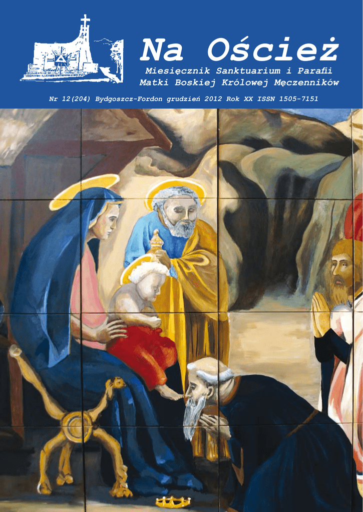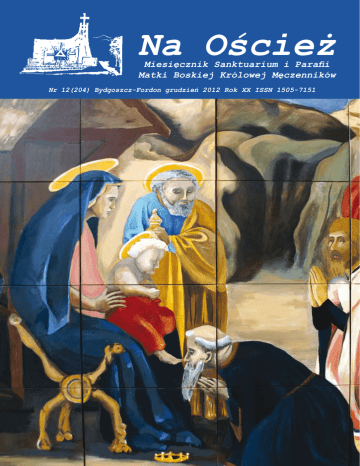 Na Oścież Miesięcznik Sanktuarium i Parafii Matki Boskiej Królowej Męczenników Nr 12(204) Bydgoszcz-Fordon grudzień 2012 Rok XX ISSN 1505-7151 M n ożna ie czytać ... Hasło aktualnego wydania „Na Oścież” brzmi: „Narodziny dla nieba”. W wydaniu jest rozmowa z młodymi osobami, które przygotowują się do posługi wolontariusza, a także wolontariuszem - Seniorem pomagającym w hospicjum - Domu Sue Ryder w Bydgoszczy. Choć treść rozmowy jest krótka, warto ją przeczytać. Obok w „Zamyśleniach” ks. Proboszcza, jak i wewnątrz wydania możemy przeczytać dalsze refleksje na temat przeżywanego Roku Wiary i na temat nowego Roku Kościelnego pod hasłem „Bądźcie solą ziemi”, wg słów Jezusa skierowanych do uczniów: „Wy jesteście solą ziemi, a jeśli sól utraci swój smak, to czym ją przywrócić? Nie przydaje się na nic!” (Mt 5,13). Wydanie zawiera relacje z wydarzeń parafialnych i stałe działy. Jest również informacja o ukazaniu się nowego kalendarza parafialnego na rok 2013. Oprócz tradycyjnych treści, jak kalendarium, planowanych celebracji i uroczystości parafialnych zawiera również rodzaj opisowej kroniki parafii z okzji przypadającego w 2013 roku XXX rocznicy jej powstania. Zamieszczono też (na str. 13) szczególny apel z okazji X rocznicy śmierci ks. Zygmunta Trybowskiego - pierwszego proboszcza naszej parafii. Myślę, że osoby, które częściej kontaktowały się z śp. ks. Zygmuntem mają choćby jedno doświadczenie, które warto przypomnieć. Są zapowiedzi tradycyjnych celebracji świątecznych z udziałem Żywego Żłóbka, koncertów kolęd i plan „Kolędy”. Od listopada br. trwają prace, najpierw przygotowawcze, a później już bardziej widoczne, nad wystrojem naszej świątyni. Można zauważyć, jak powstaje znacznych rozmiarów portret bł. papieża Jana Pawła II. W planie są jeszcze inne prace, które potrwają wiele miesięcy. Na zakończenie warto życzyć sobie lepszego Nowego Roku 2013. Fred w numerze m.in.: Porta Fidei Mija X lat Plan Kolędy 2012-13 w następnych numerach: Krzyże płaskorzeźby (s. 5) (s. 13) (s. 15) str. 1 - fragment pracy „Pokłon Trzech Króli” (składającej się 40 elementów), która jest interpretacją wg Masaccia (właśc. Tommaso di Ser Giovanni di Simone), praca zbiorowa studentów I roku kierunku „Architektura wnętrz” Wydziału Budownictwa i Inżynierii Środowiska Uniwersytetu Technologiczno - Przyrodniczego w Bydgoszczy pod kier. prof. dr hab. Aleksandry Simińskiej i dr hab. Anny Bochenek, prof. UTP, pracowników Katedry Sztuk Wizualnych, fot. Mieczysław Pawłowski (*) - z wiersza o. Franciszka Czarnowskiego, który zamieszczono na str. 8 2 12/2012 Na Oścież Proboszczowskie zamyślenia Na Boże narodzenie Rozpoczął się nowy rok kościelny, którego hasło brzmi: „Być solą ziemi”. Zastanawiamy się jakie podjąć dobrowolne adwentowe umartwienia, by okres oczekiwania na święta nie był czasem zmarnowanych łask Bożych. Jak wypełnić czas Adwentu i Bożego Narodzenia, by ogłoszony przez Ojca Świętego Rok Wiary zagospodarować przemyśleniami i przeżyciami zbliżającymi nas, nasze rodziny i parafie do Boga. Obecny rok kościelny to trzydziesta rocznica powstania naszej parafii. Niestety powoli zaczynają odchodzić do „Domu Ojca” budowniczowie naszego kościoła. Pamiętamy, że w tym roku jest już dziesiąta rocznica śmierci charyzmatycznego kapłana, księdza prałata Zygmunta Trybowskiego, który w 1983 roku odprawił przy wejściu do Doliny Śmierci polową Mszę św. w miejscu, gdzie dziś stoi nasza świątynia. Wnętrze kościoła zaczynamy ozdabiać polichromią, monumentalnymi malowidłami o treści nawiązującej do Golgoty Chrystusa. Chcemy, by cała Kalwaria Bydgoska, z jej duchowym centrum i sercem, jaką jest świątynia, były na dziesięciolecia dowodem i znakiem naszej miłości i symbolem głębokiego zaufania i zawierzenia Bogu. Zawsze, a zwłaszcza dziś, w Roku Wiary, tu w naszym Sanktuarium ogłoszonym Kościołem Stacyjnym, czyli miejscem szczególnych łask Roku Wiary, wierzyć w Chrystusa, znaczy przyjąć cały depozyt Jego Boskiego posłannictwa, uwierzyć w Jego obecność na ołtarzach całego świata, uwierzyć w to, że jest i będzie z nami zawsze obecny. Rok wiary przypomina, że sprawowana tutaj Najświętsza Eucharystia, to nie symbol obecności żywego Chrystusa między nami lecz prawdziwa Jego obecność, taka sama jak była kiedyś w synagodze w Nazarecie, czy w Jerozolimie w wieczerniku. Taka sama, jaka miała miejsce w betlejemskiej grocie, czy na górze Kalwarii. Choć jest tu ukryty pod postacią chleba, to przecież jest żywy i prawdziwy. Czy wierzysz w Niego? Czy Mu ufasz, że niesie Tobie i mnie największą wartość - łaskę wiecznego zbawienia? Przed nami 21 grudnia - dzień adwentowego nawrócenia. Całodzienna spowiedź św. Nie możemy Bożego Narodzenia ograniczyć jedynie do czasu obfitującego w obrzędy i rytuały, nawet te najpiękniejsze i często pochodzące z bardzo odległych czasów. Sedno i sens tych Uroczystości Bożonarodzeniowych to fakt i głęboka wiara, że Maryja, nasza Sanktuaryjna Patronka, która odważnie powiedziała Bogu „fiat” – niech mi się stanie według Słowa Twego - uczy wszystkich bezgranicznego zaufania narodzonemu Dziecięciu, Jezusowi Chrystusowi. A nasze piękne tradycje, współczesne i codzienne troski, przyozdobiona choinka i sianko pod obrusem, zwierzęta przemawiające w wigilijną noc ludzkim głosem, niech wiarę w Jezusa utwierdzają i wzmacniają. ks. proboszcz Jan Przychodzi W Święta Bożego Narodzenia Anno Domini 2012, Chrystus znów przychodzi do nas – do naszych codziennych spraw, trosk, problemów. „Odwieczny Bóg w Dzieciątku zesłał znak miłości” (*). Przychodzi, by na nowo napełnić nas nadzieją, że z Nim wszystko jest możliwe. Takiej nadziei, miłości i zatrzymania się w refleksji nad dobrocią i miłosie