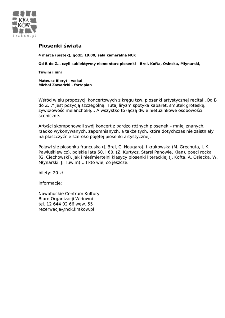 Piosenki świata 4 marca (piątek), godz. 19.00, sala kameralna NCK Od B do Z… czyli subiektywny elementarz piosenki – Brel, Kofta, Osiecka, Młynarski, Tuwim i inni Mateusz Bieryt - wokal Michał Zawadzki - fortepian Wśród wielu propozycji koncertowych z kręgu tzw. piosenki artystycznej recital „Od B do Z…” jest pozycją szczególną. Tutaj liryzm spotyka kabaret, smutek groteskę, żywiołowość melancholię… A wszystko to łączą dwie nietuzinkowe osobowości sceniczne. Artyści skomponowali swój koncert z bardzo różnych piosenek – mniej znanych, rzadko wykonywanych, zapomnianych, a także tych, które dotychczas nie zaistniały na płaszczyźnie szeroko pojętej piosenki artystycznej. Pojawi się piosenka francuska (J. Brel, C. Nougaro), i krakowska (M. Grechuta, J. K. Pawluśkiewicz), polskie lata 50. i 60. (Z. Kurtycz, Starsi Panowie, Klan), poeci rocka (G. Ciechowski), jak i nieśmiertelni klasycy piosenki literackiej (J. Kofta, A. Osiecka, W. Młynarski, J. Tuwim)… I kto wie, co jeszcze. bilety: 20 zł informacje: Nowohuckie Centrum Kultury Biuro Organizacji Widowni tel. 12 644 02 66 wew. 55 [email protected] Powered by TCPDF (www.tcpdf.org)