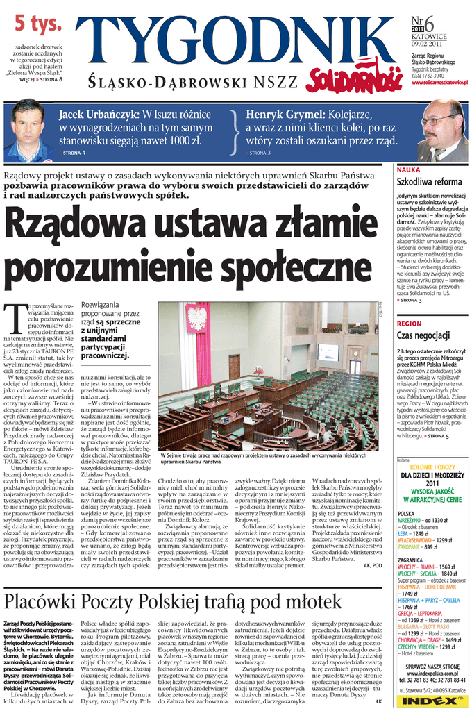 5 tys. Nr 2011 sadzonek drzewek zostanie rozdanych w tegorocznej edycji akcji pod hasłem „Zielona Wyspa Śląsk” WIĘCEJ » STRONA 8 Zarząd Regionu Śląsko-Dąbrowskiego Tygodnik bezpłatny ISSN 1732-3940 www.solidarnosckatowice.pl Jacek Urbańczyk: W Isuzu różnice w wynagrodzeniach na tym samym stanowisku sięgają nawet 1000 zł. Henryk Grymel: Kolejarze, a wraz z nimi klienci kolei, po raz wtóry zostali oszukani przez rząd. » STRONA 4 » STRONA 3 NAUKA Rządowy projekt ustawy o zasadach wykonywania niektórych uprawnień Skarbu Państwa pozbawia pracowników prawa do wyboru swoich przedstawicieli do zarządów i rad nadzorczych państwowych spółek. Szkodliwa reforma Foto: TŚD Rządowa ustawa złamie porozumienie społeczne T o przemyślane rozwiązania, mające na celu pozbawienie pracowników dostępu do informacji na temat sytuacji spółki. Nie czekając na zmiany w ustawie, już 23 stycznia TAURON PE S.A. zmienił statut, tak by wyeliminować przedstawicieli załogi z rady nadzorczej. – W ten sposób chce się nas odciąć od informacji, które jako członkowie rad nadzorczych zawsze wcześniej otrzymywaliśmy. Teraz o decyzjach zarządu, dotyczących również pracowników, dowiadywać będziemy się już po fakcie – mówi Zdzisław Przydatek z rady nadzorczej z Południowego Koncernu Energetycznego w Katowicach, należącego do Grupy TAURON PE S.A. Utrudnienie stronie społecznej dostępu do zasadniczych informacji, będących podstawą do podejmowania najważniejszych decyzji dotyczących przyszłości spółki, to nic innego jak pozbawienie pracowników możliwości szybkiej reakcji i sprzeciwienia się działaniom, które mogą okazać się niekorzystne dla załogi. Przydatek przyznaje, że proponując zmiany, rząd powołuje się na obowiązującą ustawę o informowaniu pracowników i przeprowadza- Rozwiązania proponowane przez rząd są sprzeczne z unijnymi standardami partycypacji pracowniczej. niu z nimi konsultacji, ale to nie jest to samo, co wybór przedstawiciela załogi do rady nadzorczej. – W ustawie o informowaniu pracowników i przeprowadzaniu z nimi konsultacji napisane jest dość ogólnie, że zarząd będzie informował pracowników, dlatego w praktyce może przekazać tylko te informacje, które będzie chciał. Natomiast na Radzie Nadzorczej musi złożyć wszystkie dokumenty – dodaje Zdzisław Przydatek. Zdaniem Dominika Kolorza, szefa górniczej Solidarności rządowa ustawa otworzy furtkę do pośpiesznej i dzikiej prywatyzacji. Jeżeli wejdzie w życie, jej zapisy złamią pewne wcześniejsze porozumienie społeczne. – Gdy komercjalizowano przedsiębiorstwa państwowe uznano, że załogi będą miały swoich przedstawicieli w radach nadzorczych czy zarządach tych spółek. Polsce władze spółki zapowiadały już w lecie ubiegłego roku. Program pilotażowy, zakładający zastępowanie urzędów pocztowych zewnętrznymi agencjami, miał objąć Chorzów, Kraków i Warszawę-Południe. Dzisiaj okazuje się jednak, że likwidacje nastąpią w znacznie większej liczbie miast. Jak informuje Danuta Dyszy, zarząd Poczty Pol- Jedynym skutkiem nowelizacji ustawy o szkolnictwie wyższym będzie dalsza degradacja polskiej nauki – alarmuje Solidarność. Związkowcy krytykują przede wszystkim zapisy zastępujące mianowania nauczycieli akademickich umowami o pracę,, skrócenie okresu habilitacji oraz ograniczenie możliwości studiowania na dwóch kierunkach. – Studenci wybierają dodatkowe kierunki aby zwiększyć swoje szanse na rynku pracy – komentuje Ewa Żurawska, przewodnicząca Solidarności na UŚ. » STRONA 3 REGION Czas negocjacji 2 lutego ostatecznie zakończył się proces przejęcia Nitroergu przez KGHM Polska Miedź. Związkowców z zakładowej Solidarności czekają w najbliższych miesiącach negocjacje na temat gwarancji pracowniczych, płac oraz Zakładowego Układu Zbiorowego Pracy. – W ciągu najbliższych tygodni wystosujemy do właściciela pismo z wnioskiem o spotkanie – zapowiada Piotr Nowak, przewodniczacy Solidarności w Nitroergu. » STRONA 5 W Sejmie trwają prace nad rządowym projektem ustawy o zasadach wykonywania niektórych uprawnień Skarbu Państwa Chodziło o to, aby pracownicy mieli choć minimalny wpływ na zarządzanie w swoim przedsiębiorstwie. Teraz nawet to minimum próbuje się im odebrać – ocenia Dominik Kolorz. Związkowcy alarmują, że rozwiązania proponowane przez rząd są sprzeczne z unijnymi standardami partycypacji pracowniczej. – Udział pracowników w zarządzaniu przedsiębiorstwem jest nie- zwykle ważny. Dzięki niemu załoga uczestniczy w procesie decyzyjnym i z mniejszymi oporami przyjmuje zmiany – podkreśla Henryk Nakonieczny z Prezydium Komisji Krajowej. Solidarność krytykuje również inne rozwiązania zawarte w projekcie ustawy. Kontrowersje wzbudza propozycja powołania komitetu nominacyjnego, którego skład miałby ustalać premier. Reklama W radach nadzorczych spółek Skarbu Państwa mogłyby zasiadać tylko te osoby, które uzyskają nominację komitetu. Związkowcy sprzeciwiają się też przewidywanym przez ustawę zmianom w strukturze właścicielskiej. Projekt zakłada przeniesienie nadzoru właścicielskiego nad górnictwem z Ministerstwa Gospodarki do Ministerstwa Skarbu Państwa. AK, POD Placówki Poczty Polskiej trafią pod młotek Zarząd Poczty Polskiej postanowił zlikwidować urzędy pocztowe w Chorzowie, Bytomiu, Świętochłowicach i Piekarach Śląskich. – Na razie nie wiadomo, ile placówek ulegnie zamknięciu, ani co się stanie z pracownikami – mówi Danuta Dyszy, przewodnicząca Solidarności Pracowników Poczty Polskiej w Chorzowie. Likwidację placówek w kilku dużych miastach w 6 KATOWICE 09.02.2011 skiej zapowiedział, że pracownicy likwidowanych placówek w naszym regionie zostaną zatrudnieni w Węźle Ekspedycyjno-Rozdzielczym w Zabrzu. – Sprawa ta może dotyczyć nawet 100 osób. Jednostka w Zabrzu nie jest p