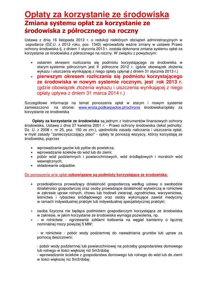 Opłaty za korzystanie ze środowiska Zmiana systemu opłat za korzystanie ze środowiska z półrocznego na roczny Ustawa z dnia 16 listopada 2012 r. o redukcji niektórych obciąŜeń administracyjnych w ospodarce (DZ.U. z 2012 roku, poz. 1342) wprowadziła waŜne zmiany w ustawie Prawo ochrony środowiska tj. z dniem 1 stycznia 2013 r. została dokonana zmiana systemu opłat za korzystanie ze środowiska z półrocznego na roczny. W związku z powyŜszym: • • ostatnim okresem rozliczania się podmiotu korzystającego ze środowiska w starym systemie półrocznym jest II półroczne 2012 r. (gdzie obowiązek złoŜenia wykazu i uiszczenia wynikającej z niego opłaty upłynął z dniem 31 stycznia 2013 r.) pierwszym okresem rozliczania się podmiotu korzystającego ze środowiska w nowym systemie rocznym, jest rok 2013 r. (gdzie obowiązek złoŜenia wykazu i uiszczenia wynikającej z niego opłaty upływa z dniem 31 marca 2014 r.) Szczegółowe informacje na temat ponoszenia opłat w starym i nowym systemie zamieszczono na stronie: www.wrota.podkarpackie.pl/ochrona środowiska/opłaty za korzystanie ze środowiska Opłaty za korzystanie ze środowiska są jednym z instrumentów finansowych ochrony środowiska. Ustawa z dnia 27 kwietnia 2001 r. - Prawo ochrony środowiska (tekst jednolity: Dz. U. z 2008 r. nr 25, poz. 150 ze zm.), ujednoliciła zasady naliczania i uiszczania opłat, w myśl zasady "zanieczyszczający płaci" - opłaty te ponoszą wszyscy, którzy korzystają ze środowiska, poprzez • • • • wprowadzanie gazów lub pyłów do powietrza; wprowadzanie ścieków do wód lub do ziemi; pobór wód podziemnych i powierzchniowych, wód śródlądowych i morskich wód wewnętrznych; składowanie odpadów. Do ponoszenia w/w opłat zobowiązane są podmioty korzystające ze środowiska: • przedsiębiorca prowadzący działalność gospodarczą według ustawy o swobodzie działalności gospodarczej oraz osoby prowadzące działalność wytwórczą w rolnictwie w zakresie upraw rolnych, chowu lub hodowli zwierząt, ogrodnictwa, warzywnictwa, leśnictwa i rybactwa śródlądowego oraz osoby wykonujące zawód medyczny w ramach indywidualnej praktyki lub indywidualnej specjalistycznej praktyki; • osoba fizyczna nie będąca podmiotem gospodarczym korzystająca ze środowiska w zakresie, w jakim korzystanie ze środowiska wymaga pozwolenia, np. - w rolnictwie - ogrzewanie szklarni kotłownia na węgiel kamienny o łącznej nominalnej mocy powyŜej 5 MW; • - w rolnictwie - pobór wody podziemnej do nawadniania gruntów lub upraw za pomocą deszczowni; - pobór wody podziemnej lub powierzchniowej na potrzeby gospodarstwa domowego lub rolnego w ilości większej niŜ 5m3/dobę - wprowadzanie ścieków z gospodarstwa domowego lub rolnego do wód lub do ziemi w ilości większej niz 5m3/dobę; • jednostka organizacyjna nie będąca przedsiębiorcą w rozumieniu ustawy o swobodzie działalności gospodarczej (urzędy, gminne zakłady gospodarki komunalnej, szkoły, stowarzyszenia, fundacje, itp.) adres składania wykazów: Urząd Marszałkowski Województwa Podkarpackiego w Rzeszowie Al. Łukasza Cieplińskiego 4; 35-010 Rzeszów z dopiskiem Departament Rolnictwa i Gospodarki Wodnej