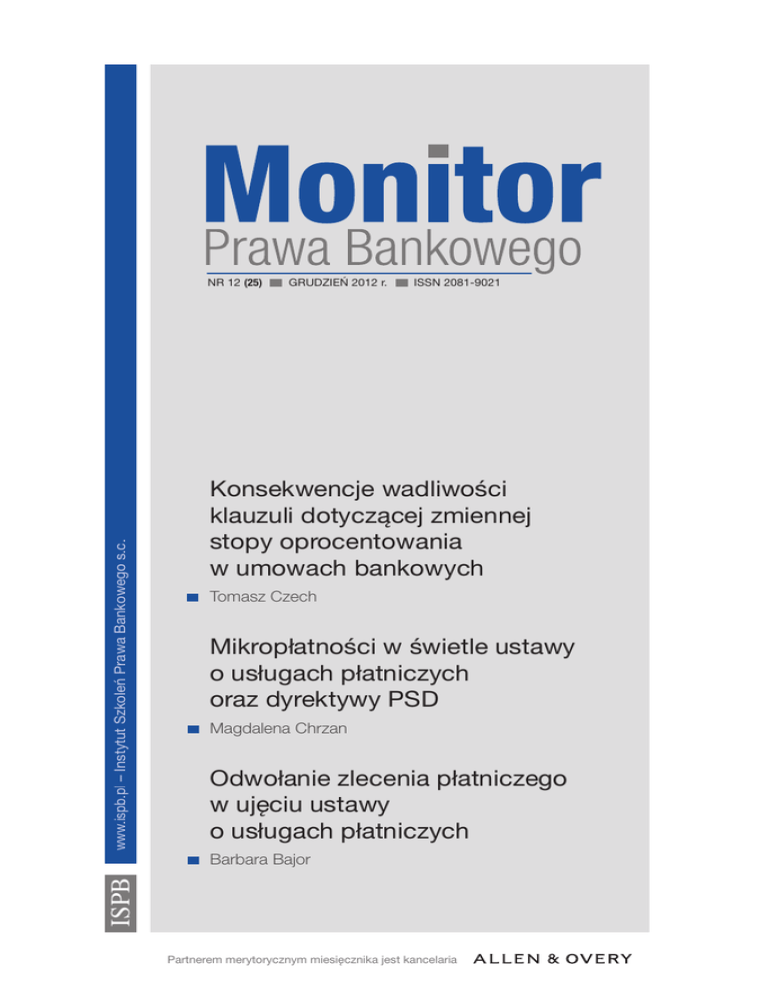 www.ispb.pl – Instytut Szkoleń Prawa Bankowego s.c. NR 12 (25) GRUDZIEŃ 2012 r. ISSN 2081-9021 Konsekwencje wadliwości klauzuli dotyczącej zmiennej stopy oprocentowania w umowach bankowych Tomasz Czech Mikropłatności w świetle ustawy o usługach płatniczych oraz dyrektywy PSD Magdalena Chrzan Odwołanie zlecenia płatniczego w ujęciu ustawy o usługach płatniczych ISPB Barbara Bajor Partnerem merytorycznym miesięcznika jest kancelaria — SPIS TREŚCI — Stanowiska organów regulacyjnych Zasady dokonywania oceny klienta – pismo Urzędu KNF z 16 kwietnia 2010 r. ..............................................................2 Zmienne składniki wynagrodzenia osób zajmujących stanowiska kierownicze w banku – pismo Urzędu KNF z 22 maja 2012 r. (DRBI/0735/13/2/12) .................................4 Rejestracja zbioru danych przedsiębiorców – stanowisko Generalnego Inspektora Ochrony Danych Osobowych .................11 Orzecznictwo sądów Zabezpieczenie roszczenia pauliańskiego hipoteką przymusową – wyrok SA we Wrocławiu z 10 maja 2012 r. (I ACz 705/12) .................................13 Zwrot dotacji na rzecz ARiMR – wyrok SN z 4 listopada 2011 r. (I CSK 799/10) ...................................................15 Sprzeczność poręczenia wekslowego z zasadami współżycia społecznego – wyrok SN z 2 marca 2012 r. (II CSK 351/11) ...................................................... 20 Status podatkowy spółdzielczej kasy oszczędnościowo-pożyczkowej – wyrok NSA z 14 października 2011 r. (II FSK 748/10) .........................................29 Glosy VAT od usług SWIFT – glosa do wyroku Trybunału Sprawiedliwości UE z 28 lipca 2011 r. (C-350/10) ...................................................................................36 Szymon Wróblewski Poglądy Konsekwencje wadliwości klauzuli dotyczącej zmiennej stopy oprocentowania w umowach bankowych .............................................................41 Tomasz Czech Mikropłatności w świetle ustawy o usługach płatniczych oraz dyrektywy PSD .........................................................57 Magdalena Chrzan Odwołanie zlecenia płatniczego w ujęciu ustawy o usługach płatniczych ...........66 Barbara Bajor Z praktyki Usługi płatnicze – Rekomendacja Rady Prawa Bankowego i Zespołu ds. Regulacji Płatniczych przy Związku Banków Polskich z 13 czerwca 2012 r. w sprawie wybranych problemów interpretacyjnych ustawy o usługach płatniczych..............................80 1 Monitor Prawa Bankowego | GRUDZIEŃ 2012 r. | www.ispb.pl