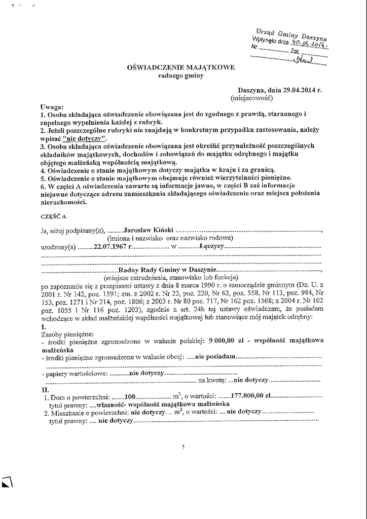 ................... 2a/. ......... _" OSWIADCZENIE MAJ4TKOWE radnego gminy Daszyna, dnia 29.04.2014 r. (miejscowosc) Uwaga: 1. Osoba skiadaj^ca Oswiadczenie obowiazana jest do zgodnego z prawd% starannego i zupelnego wypelnienia kazdej z rubryk. 2. Jezeli poszczegolne rubryki nie znajduja^ w konkretnym przypadku zastosowania, nalezy wpisac "nie dotyczy". 3. Osoba skladaj^ca Oswiadczenie obowiazana jest okreslic przynaleznosc poszczegolnych skladnikow majaj;kowych, dochodow i zobowiajzan do maj^tku odrejbnego i majatku obj^tego malzenskq wspolnoscisj maj^tkowq. 4. Oswiadczenie o stanie majqtkowym dotyczy maj^tku w kraju i za granicq. 5. Oswiadczenie o stanie maj^tkowym obejmuje rowniez wierzytelnosci pieni^zne. 6. W czejsci A oswiadczenia zawarte sq iuformacje jawne, w cz^sci B zas informacje niejawne dotycza_ce adresu zamieszkania skladajqcego Oswiadczenie oraz miejsca polozenia nieruchomosci. CZ^SC A Ja, nizej podpisany(a), urodzony(a) Jaroslaw Kinski (imiona i nazwisko oraz naz\visko rodowe) 22.07.1967 r w te_czycy Radny Rady Grainy w Baszynie..., , (miejsce zatrudnienia, stanowisko lub funkcja) po zapoznaniu si? z przepisami ustawy z dnia 8 marca 1990 r. o samorzadzie gminnym (Dz. U. z 2001 r. Nr 142, poz. 1591; zm. z 2002 r. Nr 23, poz. 220, Nr 62, poz. 558, Nr 113, poz. 984, Nr 153, poz. 1271 i Nr 214, poz. 1806; z 2003 r. Nr 80 poz. 717, Nr 162 poz. 1568; z 2004 r. Nr 102 poz. 1055 i Nr 116 poz. 1203), zgodnie z art. 24h tej ustawy oswiadczam, ze posiadam wchodzace w sklad malzenskiej wspolnos'ci maj^tkowej lub stanowi^ce rnqj majatek odr^bny: I. Zasoby pieni^zne: - srodki pieni^zne zgromadzone w walucie polskiej: 9 000,00 zl - wspolnosc maj^tkowa malzenska - srodki pieni^zne zgromadzone w walucie obcej: nie posiadam - papiery wartosciowe; nie dotyczy nakwot§: ...nie dotyczy II. 1. Dom o powierzchni: 100 rn2, o wartosci: 177.800,00 zl tytul prawny: ....wlasnosc- wspolnosc niajqtkowa malzenska 2. Mieszkanie o powierzchni: nie dotyczy... m2, o wartosci: ... nie dotyczy tytul prawny:.... nie dotyczy 3. Gospodarstwo rolne: rodzaj gospodarstwa: ogolnorolne , powierzchnia: 8,96 ha oraz 3,0854 ha dzierzawa o wartosci: .267 000,00 zl rodzaj zabudowy: obora, stodola drewniana, budynek gospodarczy, garaze tytul prawny: wlasnosc - wspolnosc majatkowa malzeriska z tego tytuhi osia_gna_lem(elam) w roku bieza_cym przychod w wysokosci: 76 000,00 zl dochod w wysokosci: 24 500,00 zl 4. Inne nieruchomosci: powierzchnia: nie posiadam : o wartosci: ...nie dotyczy tytul prawny:.... nie dotyczy m. 1. Posiadarn udziafy w spolkach handlowych z udzialem gminnych osob prawnych lub przedsiebiorcow, w ktorych uczestnicza^ takie osoby - nalezy podac liczbe. i emitenta udzialow: nie posiadam , udzialy te stanowiq. pakiet wiekszy niz 10%udzial6wwspotce:... nie dotyczy z tego tytuhi osi^gn^lem(^tarri) w roku ubiegtym dochod w wysokosci: nie dotyczy 2. Posiadam udziaty w innych spolkach handlowych - nalezy podac liczb$ i emitenta udzialow: nie posiadam z tego tytulu osiaj*naj:em(elani) w roku ubieglym dochod w wysokosci:... nie dotyczy IV. 1. Posiadam akcj e w spolkach handlowych z udziatem grninnych osob prawnych lub przedsiebiorcow, w ktorych uczestnicz^ takie osoby - nalezy podac liczbe i emitenta akcji: nie posiadam akcjete stanowi^ pakiet wiekszy mt 10% akcji w spolce: nie dotyczy z tego tytulu osi^gn^lem(elam) w roku ubieglym dochod w wysokosci: nie dotyczy 2. Posiadam akcje w innych spolkach handlowych - nalezy podac liczb§ i emitenta akcji: nie dotyczy z tego tytuhi osi^gn^lem(eiam) w roku ubieglym dochod w wysokosci: nie osiajrnalem.... V. Nabylem(am) (nabyl moj malzonek, z wylaczeniem mienia przynaleznego do jego majatku odrebnego) od Skarbu Panstwa, innej panstwowej osoby prawnej, jednosteksamorz^du terytorialnego, ich zwi^zkow lub od komunalnej osoby prawnej nastepuj^ce mienie, ktore podlegalo zbyciu w drodze przetargu - nalezy podac opis mienia i date nabycia, od kogo: nienabylem VI. 1. Prowadze; dziatalnosc gospodarczy (nalezy podac forme; prawna_ i przedmiot dzialalnosci): nieprowadz^ - osobiscie nie dotyczy - wspolnie z innymi osobami nie dotyczy z tego tytulu osiajmaj:em(elam) w roku ubieglym przychod w wysokosci: nie dotyczy i dochod w wysokosci: nie dotyczy 2. Zarzadzam dzialalnosci^ gospodarczy lub jestem przedstawicielem pemomocnikiem takiej dziaJalnosci (nalezy podac form$ prawna^ i przedmiot dzialalnos'ci): nie zarzqdzam - osobiscie nie dotyczy - wspolnie z innymi osobami.... nie dotyczy z tego tytulu osiajmaj:em(ej:ain) w roku ubieglym dochod w wysokosci:.... nie dotyczy. VII. W spolkach handlowych (nazwa, siedziba spolki): nie dotyczy - jestem czlonkiem zarz^du (od kiedy):... nie dotyczy - jestem czlonkiem rady nadzorczej (od kiedy):... nie dotyczy -jestem cztonkiem komisji rewizyjnej (od kiedy): .. nie dotyczy , z tego tytulu osiajmalem(e^am) w roku ubiegiym dochod w wysokosci: .... nie dotyczy. VIII. Inne dochody osi^gane z tytuhi zatrudnienia lub mnej dzialalnosci zarobkowej lub zaj^c, z podaniem kwot uzyskiwanych z kazdego tytuhi: Diety radnego - 8.960,00 z 1- od 01.01.2013 do 31.12,2013 - wspolnosc maj^tkowa mafzenska IX. Skladniki mienia ruchomego o wartosci powyzej 10.000 zlotych (w przypadku pojazdow mechanicznych nalezy podac mark?, model i rok produkcji): Kombajn zbozowy ,,BIZON" Z056 - 1986 r. - 25 000 zl CiqgnikUrsus C-360-3P-1985 r. - 15.000 zl Ciqgnik Ursus C-330- 1980 r. - spadek wartosci ponizej 10 000 zl - wspolnosc maj^tkowa malzenska X. Zobowiqzania pieni^zne o wartosci powyzej 10.000 zlotych, w tym zaci^gni^te kredyty i pozyczki oraz warunki, na jakich zostaty udzielone (wobec kogo, w zwi^zku z jakim zdarzeniem, w jakiej wysokosci): Kredyt inwestycyjny na zakup uzytkow rolnych w BGZ o/L^czyca, oprocentowanie 2%, splata do 31.03.2026 r., w kwocie 45.000,00 zl - stan na 31.12.2013 r. 39.200,00 zl - wspolnosc maj^tkowa malzenska CZ^SC B Powyzsze oswiadczenie skladam swiadomy(a), iz na podstawie art, 233 § 1 Kodeksu karnego za podanie nieprawdy lub zatajenie prawdy grozi