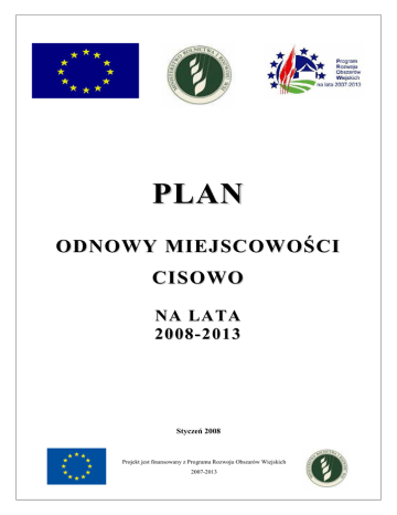 PLAN ODNOWY MIEJSCOWOŚCI CISOWO NA LATA 2008-2013 Styczeń 2008 Projekt jest finansowany z Programu Rozwoju Obszarów Wiejskich 2007-2013 PLAN ODNOWY MIE JSC OWOŚCI NA LATA 20 08 - 20 13 C ISOWO Zleceniodawca: Urząd Gminy Darłowo ul. Dąbrowskiego 4 76-150 Darłowo tel.: 094-344-63-01 fax: 094-344-63-09 e-mail: [email protected] http: www.ugdarlowo.pl Autor: Rada Sołecka Sołectwa Cisowo Koordynator opracowania: mgr Aleksandra Korzeniewska ___________________ Wykonawca: Business Mobility International Spółka z o.o. al. 3-go Maja 11 76-200 Słupsk tel. (0 59) 8 456 301-302 fax.(0 59) 8 456 303 e-mail: [email protected] http: www.bmintl.com Biuro regionalne: Business Mobility International Spółka z o.o. ul. Drewsa 4E 61 – 606 Poznań tel/fax (061) 825 78 60 e-mail: [email protected] 2 PLAN ODNOWY MIE JSC OWOŚCI NA LATA 20 08 - 20 13 C ISOWO SPIS TREŚCI: WSTĘP...................................................................................................................................................................................... 4 1. UCZESTNICY DEBATY STRATEGICZNEJ REPREZENTUJĄCY MIEJSCOWOŚĆ CISOWO .................... 5 2. METODOLOGIA.......................................................................................................................................................... 6 3. RAPORT O STANIE .................................................................................................................................................... 8 3.1. MIEJSCOWOŚĆ CISOWO ........................................................................................................................................ 8 3.2. SYNTETYCZNA CHARAKTERYSTYKA MIEJSCOWOŚCI .......................................................................................... 10 3.2.1. PołoŜenie ....................................................................................................................................................... 10 3.2.2. Miejscowość w statystyce............................................................................................................................. 11 3.2.3. Struktura uŜytkowania gruntów w Cisowie .............................................................................................. 11 3.2.4. Struktura wieku ........................................................................................................................................... 12 3.2.5. Gospodarka .................................................................................................................................................. 13 3.2.6. Rolnictwo ...................................................................................................................................................... 13 3.2.7. Bezrobocie .................................................................................................................................................... 14 3.2.8. Oświata ......................................................................................................................................................... 15 3.2.9. Ochrona zdrowia.......................................................................................................................................... 16 3.2.10. Kultura .................................................................................................................................................... 16 3.2.11. Sport i wypoczynek................................................................................................................................. 17 3.2.12. Infrastruktura techniczna i komunikacyjna ........................................................................................ 17 3.2.12.1. Transport i komunikacja .................................................................................................................. 17 3.2.12.2. Telekomunikacja ............................................................................................................................... 17 3.2.12.3. Zaopatrzenie w ciepło........................................................................................................................ 18 3.2.12.4. Zaopatrzenie w gaz............................................................................................................................ 18 3.2.12.5. Zaopatrzenie w wodę......................................................................................................................... 18 3.2.12.6. Kanalizacja ........................................................................................................................................ 18 3.2.13. Gospodarka odpadami ........................................................................................................................... 18 3.2.14. Zasoby przyrodnicze, środowiskowe i stan środowiska....................................................................... 19 3.2.15. Zasoby kulturowe i historyczne ............................................................................................................. 20 4. OBSZAR I CZAS REALIZACJI PLANU ODNOWY MIEJSCOWOŚCI CISOWO........................................... 21 5. ANALIZA SWOT........................................................................................................................................................ 22 6. OCENA SYTUACJI SPOŁECZNO-GOSPODARCZEJ MIEJSCOWOŚCI CISOWO....................................... 25 7. MISJA........................................................................................................................................................................... 27 8. ANKIETY POGLĄDOWE ......................................................................................................................................... 29 9. DIAGNOZA STANU..................................................................................................