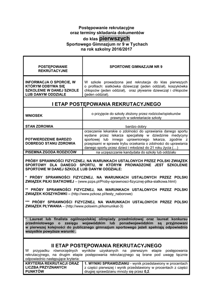 Postępowanie rekrutacyjne oraz terminy składania dokumentów do klas pierwszych Sportowego Gimnazjum nr 9 w Tychach na rok szkolny 2016/2017 POSTĘPOWANIE REKRUTACYJNE SPORTOWE GIMNAZJUM NR 9 INFORMACJA O SPORCIE, W KTÓRYM ODBYWA SIĘ SZKOLENIE W DANEJ SZKOLE LUB DANYM ODDZIALE W szkole prowadzona jest rekrutacja do klas pierwszych o profilach: siatkówka dziewcząt (jeden oddział), koszykówka chłopców (jeden oddział), oraz pływanie dziewcząt i chłopców (jeden oddział). I ETAP POSTĘPOWANIA REKRUTACYJNEGO o przyjęcie do szkoły złożony przez rodziców/opiekunów prawnych w sekretariacie szkoły WNIOSEK STAN ZDROWIA POTWIERDZENIE BARDZO DOBREGO STANU ZDROWIA PISEMNA ZGODA RODZICÓW bardzo dobry orzeczenie lekarskie o zdolności do uprawiania danego sportu wydane przez lekarza specjalistę w dziedzinie medycyny sportowej lub innego uprawnionego lekarza, zgodnie z przepisami w sprawie trybu orzekania o zdolności do uprawiania danego sportu przez dzieci i młodzież do 21 roku życia (…) na uczęszczanie kandydata do szkoły lub oddziału PRÓBY SPRAWNOŚCI FIZYCZNEJ, NA WARUNKACH USTALONYCH PRZEZ POLSKI ZWIĄZEK SPORTOWY DLA DANEGO SPORTU, W KTÓRYM PROWADZONE JEST SZKOLENIE SPORTOWE W DANEJ SZKOLE LUB DANYM ODDZIALE: * PRÓBY SPRAWNOŚCI FIZYCZNEJ, NA WARUNKACH USTALONYCH PRZEZ POLSKI ZWIĄZEK PIŁKI SIATKOWEJ – (www.pzps.pl/Proby-sprawnosci-fizycznej-pilka-siatkowa.html) ** PRÓBY SPRAWNOŚCI FIZYCZNEJ, NA WARUNKACH USTALONYCH PRZEZ POLSKI ZWIĄZEK KOSZYKÓWKI – (http://www.pzkosz.pl/testy_naborowe) *** PRÓBY SPRAWNOŚCI FIZYCZNEJ, NA WARUNKACH USTALONYCH PRZEZ POLSKI ZWIĄZEK PŁYWANIA – (http://www.polswim.pl/komunikat-3) * Laureat lub finalista ogólnopolskiej olimpiady przedmiotowej oraz laureat konkursu przedmiotowego o zasięgu wojewódzkim lub ponadwojewódzkim są przyjmowani w pierwszej kolejności do publicznego gimnazjum sportowego jeżeli spełniają odpowiednio wszystkie powyższe warunki . II ETAP POSTĘPOWANIA REKRUTACYJNEGO W przypadku równorzędnych wyników uzyskanych na pierwszym etapie postępowania rekrutacyjnego, na drugim etapie postępowania rekrutacyjnego są brane pod uwagę łącznie odpowiednio następujące kryteria: KRYTERIA REKRUTACJI ORAZ 1. WYNIKI SPRAWDZIANU - wynik przedstawiony w procentach LICZBA PRZYZNANYCH z części pierwszej i wynik przedstawiony w procentach z części PUNKTÓW drugiej sprawdzianu mnoży się przez 0,2. W przypadku osób zwolnionych z obowiązku przystąpienia do sprawdzianu przelicza się na punkty oceny z języka polskiego, matematyki i języka obcego nowożytnego, wymienione na świadectwie ukończenia szkoły podstawowej, przy czym za uzyskanie: 1) z języka polskiego i matematyki oceny wyrażonej w stopniu: a) celującym – przyznaje się po 20 punktów, b) bardzo dobrym – przyznaje się po 16 punktów, c) dobrym – przyznaje się po 12 punktów, d) dostatecznym – przyznaje się po 8 punktów, e) dopuszczającym – przyznaje się po 2 punkty – oraz liczbę punktów uzyskaną po zsumowaniu punktów z tych zajęć edukacyjnych dzieli się przez 2; 2) z języka obcego nowożytnego oceny wyrażonej w stopniu: a) celującym – przyznaje się 20 punktów, b) bardzo dobrym – przyznaje się 16 punktów, c) dobrym – przyznaje się 12 punktów, d) dostatecznym – przyznaje się 8 punktów, e) dopuszczającym – przyznaje się 2 punkty. W przypadku osób zwolnionych z obowiązku przystąpienia do danej części sprawdzianu, przelicza się na punkty, w sposób wyżej określony, oceny wymienione na świadectwie ukończenia szkoły podstawowej z zajęć edukacyjnych, z których jest przeprowadzana część sprawdzianu, której dotyczy zwolnienie. 2. ŚWIADECTWO UKOŃCZENIA SZKOŁY PODSTAWOWEJ Z WYRÓŻNIENIEM – przyznaje się 5 punktów. 3. WOLONTARIAT – przyznaje się 2 punkty. 4. SZCZEGÓLNE OSIĄGNIĘCIA SPORTOWE - wymienione na świadectwie ukończenia szkoły podstawowej – uzyskanie wysokiego miejsca na szczeblu: ● międzynarodowym - 4 punkty, ● krajowym – 3 punkty, ● wojewódzkim – 2 punkty, ● powiatowym – 1 punkt. Maksymalna liczba punktów możliwych do uzyskania za wszystkie osiągnięcia wynosi 13 pkt III ETAP POSTĘPOWANIA REKRUTACYJNEGO W przypadku równorzędnych wyników uzyskanych na drugim etapie postępowania rekrutacyjnego, na trzecim etapie postępowania rekrutacyjnego są brane pod uwagę łącznie kryteria, które mają jednakową wartość: KRYTERIA REKRUTACJI ORAZ 1) wielodzietność rodziny kandydata LICZBA PRZYZNANYCH 2) niepełnosprawność kandydata PUNKTÓW 3) niepełnosprawność jednego z rodziców kandydata 4) niepełnosprawność obojga rodziców kandydata 5) niepełnosprawność rodzeństwa kandydata 6) samotne wychowywanie kandydata w rodzinie 7) objęcie kandydata pieczą zastępczą TERMINY Rodzaj czynności Złożenie wniosku o przyjęcie do gimnazjum wraz z dokumentami potwierdzającymi spełnianie przez kandydata warunków lub kryteriów branych pod uwagę w postępowaniu rekrutacyjnym do gimnazjum sportowego. Postępowanie rekrutacyjne Postępowanie uzupełniające od 6 maja do 20 maja 2016 r. od 22 lipca do 27 lipca 2016 r. 23.05.2016 r. godz. 16:00 siatkówka dziewcząt sala gimnastyczna w ZSS Przeprowadzenie prób sprawności fizycznej, o których mowa w art. 20h ust. 1 pkt 3 i ust. 4 ustawy. 24.05.2016 r. godz. 16:00 koszykówka chłopców sala gimnastyczna ZSS do 29 lipca 2016 r. 25.05.2016 r. godz. 16:00 pływanie dziewcząt i chłopców pływalnia w ZSS 31.05.2016 r. termin dodatkowy (w zależności od potrzeb) Podanie do publicznej wiadomości przez komisję rekrutacyjną listy kandydatów, którzy uzyskali pozytywne wyniki ww. prób sprawności fizycznej. Uzupełnienie wniosku o przyjęcie do gimnazjum o świadectwo ukończenia szkoły podstawowej oraz zaświadczenie o wynikach sprawdzianu. Weryfikacja przez komisję rekrutacyjną wniosków o przyjęcie do gimnazjum i dokumentów potwierdzających spełnianie przez kandydata war