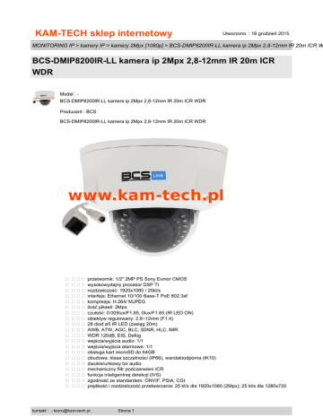 KAM-TECH sklep internetowy Utworzono : 18 grudzień 2015 MONITORING IP > kamery IP > kamery 2Mpx [1080p] > BCS-DMIP8200IR-LL kamera ip 2Mpx 2,8-12mm IR 20m ICR W BCS-DMIP8200IR-LL kamera ip 2Mpx 2,8-12mm IR 20m ICR WDR Model : BCS-DMIP8200IR-LL kamera ip 2Mpx 2,8-12mm IR 20m ICR WDR Producent : BCS BCS-DMIP8200IR-LL kamera ip 2Mpx 2,8-12mm IR 20m ICR WDR � ��� przetwornik: 1/2" 2MP PS Sony Exmor CMOS � ��� wysokowydajny procesor DSP TI � ��� rozdzielczość: 1920x1080 / 25kl/s � ��� interfejs: Ethernet 10/100 Base-T PoE 802.3af � ��� kompresja: H.264/ MJPEG � ��� ilość pikseli: 2Mpx � ��� czułość: 0.005lux/F1.65, 0lux/F1.65 (IR LED ON) � ��� obiektyw regulowany: 2.8~12mm (F1.4) � ��� 28 diod ø5 IR LED (zasięg 20m) � ��� AWB, ATW, AGC, BLC, 3DNR, HLC, MIR � ��� WDR 120dB, EIS, Defog � ��� wejścia/wyjścia audio: 1/1 � ��� wejścia/wyjścia alarmowe: 1/1 � ��� obsługa kart microSD do 64GB � ��� obudowa: klasa szczelności (IP66), wandaloodporna (IK10) � ��� dwukierunkowy tor audio � ��� mechaniczny filtr podczerwieni ICR � ��� funkcja inteligentnej detekcji (IVS) � ��� zgodność ze standardem: ONVIF, PSIA, CGI � ��� prędkość i rozdzielczość przetwarzania: 25 kl/s dla 1920x1080 (2Mpx); 25 kl/s dla 1280x720 kontakt : - [email protected] Strona 1 KAM-TECH sklep internetowy Utworzono : 18 grudzień 2015 MONITORING IP > kamery IP > kamery 2Mpx [1080p] > BCS-DMIP8200IR-LL kamera ip 2Mpx 2,8-12mm IR 20m ICR W BCS-DMIP8200IR-LL kamera ip 2Mpx 2,8-12mm IR 20m ICR WDR (720p); 25 kl/s dla 704x576 (D1); 25 kl/s dla 352x288 (CIF) � ��� bitrate:� 32K ~ 8192Kbps � ��� podgląd obrazu: przeglądarki internetowe: IE, Firefox, Chrome, Opera; urządzenia mobilne z systemami: iOS, Android, Windows Phone, Symbian, BlackBerry � ��� zasilanie: DC 12V / AC 24V lub PoE 48V (802.3af) � ��� gwarancja: 24 miesiące Uniwersalna kamera kopułowa 2 megapixelowa, wandaloodporna z obiektywem zmiennoogniskowym 4-8mm F1.65 MOTOZOOM. Funkcja Ultra WDR poprawiająca dynamikę kamery wydobywa większą ilość szczegółów z kontrastowego planu obserwacyjnego. Wbudowane gniazdo pamięci pozwala na podłączenie do kamery karty micro SD o pojemności do 64 GB. Obudowa wandaloodporna umozliwia zastosowanie kamery w miejscach zagrożonych aktami wandalizmu. Kamera zasilana jest napięciem 12 VDC / 24 VAC oraz poprzez PoE (802.3af). Model BCS-DMIP8200IR-LL System skanowania Progressice scan Przetwornik 1/1.9” 2Megapixel PS CMOS Ilość pikseli 1920(H)�1080(V) Wyjście Video 1 V p-p, kompozytowe, 75 Ohm Czułość Kolor: 0. 005Lux/F1.65, 0Lux/F1.2(wł. IR)/td> Stosunek S/N > 50dB (AGC wył.) Balans bieli (ATW) automatyczny/ręczny Obiektyw 4-8mm F1.65 MOTOZOOM kontakt : - [email protected] Strona 2 KAM-TECH sklep internetowy Utworzono : 18 grudzień 2015 MONITORING IP > kamery IP > kamery 2Mpx [1080p] > BCS-DMIP8200IR-LL kamera ip 2Mpx 2,8-12mm IR 20m ICR W BCS-DMIP8200IR-LL kamera ip 2Mpx 2,8-12mm IR 20m ICR WDR Kompensacja tła Wył. - wł (BLC) Funkcja poszerzonej dynamiki Wył.-wł (Ultra WDR) płynna regulacja do 120dB Migawka Auto, Ręczna (1/3-1/10000), zabezpieczenie przed migotaniem Kontrola wzmocnienia (AGC) Wył. - wł Redukcja szumów 3D DNR Wył. - wł Detekcja ruchu wł./wył. 4 strefy (regulacja położenia, rozmiaru, czułości pól detekcji) Strefy zastrzeżone wł./wył. 4 obszary Odbicie lustrzne wł./wył. Wyostrzanie wł./wył - płynna regulacja Funkcja dzień/noc Mechaniczny filtr IR (ICR) Promiennik podczerwieni Zasięg 50m Wejście / wyjście alarmowe 2/ 1 Kompresja H.264 / MJPEG kontakt : - [email protected] Strona 3 KAM-TECH sklep internetowy Utworzono : 18 grudzień 2015 MONITORING IP > kamery IP > kamery 2Mpx [1080p] > BCS-DMIP8200IR-LL kamera ip 2Mpx 2,8-12mm IR 20m ICR W BCS-DMIP8200IR-LL kamera ip 2Mpx 2,8-12mm IR 20m ICR WDR Rozdzielczość 1080P(1920�1080) / 720P(1280�720) / D1(704�576) / CIF(352�288) Prędkość transmisji strumienia głównego 1080P(1 ~ 50kl/sek) Prędkość transmisji drugiego strumienia D1/CIF(1 ~ 25kl/sek) Prędkość transmisji trzeciego strumienia 1080P/720P/D1(1 ~ 25kl/sek) Przepływność H.264: 32K ~ 8192Kbps, MJPEG: 32K ~ 12288Kbps Podłączenie sieci RJ-45 (10/100Base-T) Protokoły IPv4/IPv6, HTTP, HTTPS, SSL, TCP/IP, UDP, UPnP, ICMP, IGMP, SNMP, RTSP, RTP, SMTP, NTP, DHCP, DNS, PPPOE, DDNS, FTP, IP Filter, QoS, Bonjour Kompatybilność ONVIF, PSIA, CGI Użytkownicy mobilni iPhone, iPad, Android, Windows Phone Użytkownicy Maksymalnie 10 zalogowanych Zabezpieczenia dostępu Hasło dostępu do konfiguracji i podglądu Gniazdo pamięci Micro SD do 64GB Zasilanie: 12VDC /24VAC / POE (802.3af) kontakt : - [email protected] Strona 4 KAM-TECH sklep internetowy Utworzono : 18 grudzień 2015 MONITORING IP > kamery IP > kamery 2Mpx [1080p] > BCS-DMIP8200IR-LL kamera ip 2Mpx 2,8-12mm IR 20m ICR W BCS-DMIP8200IR-LL kamera ip 2Mpx 2,8-12mm IR 20m ICR WDR Pobór mocy 12W z wł IR Temperatura pracy -30�C ~ +60�C Waga 1,25kg Wymiary dł/wys/szer Φ151�119mm Cena : 3.382,50 zł Brutto ( 2.750,00 zł Netto) Dostępność: Produkt dostępny w naszym sklepie od 18 grudzień 2015 kontakt : - [email protected] Strona 5
