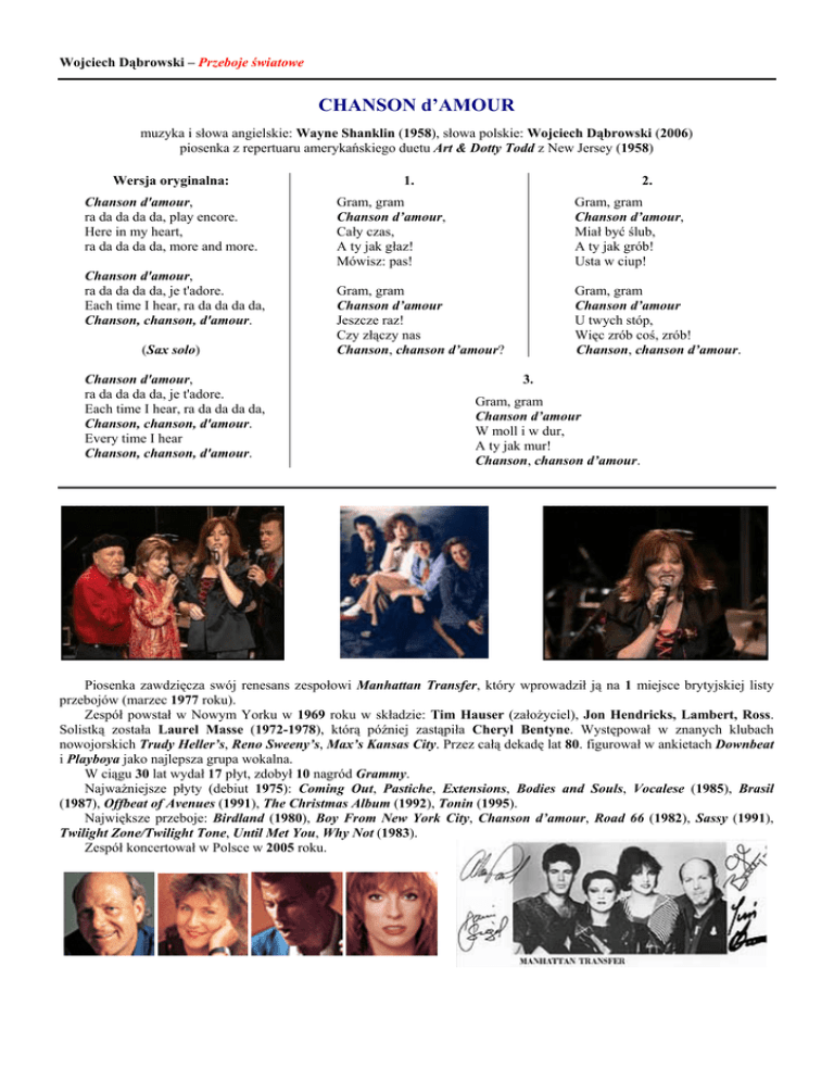 Wojciech Dąbrowski – Przeboje światowe CHANSON d’AMOUR muzyka i słowa angielskie: Wayne Shanklin (1958), słowa polskie: Wojciech Dąbrowski (2006) piosenka z repertuaru amerykańskiego duetu Art & Dotty Todd z New Jersey (1958) Wersja oryginalna: Chanson d'amour, ra da da da da, play encore. Here in my heart, ra da da da da, more and more. Chanson d'amour, ra da da da da, je t'adore. Each time I hear, ra da da da da, Chanson, chanson, d'amour. (Sax solo) Chanson d'amour, ra da da da da, je t'adore. Each time I hear, ra da da da da, Chanson, chanson, d'amour. Every time I hear Chanson, chanson, d'amour. 1. 2. Gram, gram Chanson d’amour, Cały czas, A ty jak głaz! Mówisz: pas! Gram, gram Chanson d’amour, Miał być ślub, A ty jak grób! Usta w ciup! Gram, gram Chanson d’amour Jeszcze raz! Czy złączy nas Chanson, chanson d’amour? Gram, gram Chanson d’amour U twych stóp, Więc zrób coś, zrób! Chanson, chanson d’amour. 3. Gram, gram Chanson d’amour W moll i w dur, A ty jak mur! Chanson, chanson d’amour. Piosenka zawdzięcza swój renesans zespołowi Manhattan Transfer, który wprowadził ją na 1 miejsce brytyjskiej listy przebojów (marzec 1977 roku). Zespół powstał w Nowym Yorku w 1969 roku w składzie: Tim Hauser (założyciel), Jon Hendricks, Lambert, Ross. Solistką została Laurel Masse (1972-1978), którą później zastąpiła Cheryl Bentyne. Występował w znanych klubach nowojorskich Trudy Heller’s, Reno Sweeny’s, Max’s Kansas City. Przez całą dekadę lat 80. figurował w ankietach Downbeat i Playboya jako najlepsza grupa wokalna. W ciągu 30 lat wydał 17 płyt, zdobył 10 nagród Grammy. Najważniejsze płyty (debiut 1975): Coming Out, Pastiche, Extensions, Bodies and Souls, Vocalese (1985), Brasil (1987), Offbeat of Avenues (1991), The Christmas Album (1992), Tonin (1995). Największe przeboje: Birdland (1980), Boy From New York City, Chanson d’amour, Road 66 (1982), Sassy (1991), Twilight Zone/Twilight Tone, Until Met You, Why Not (1983). Zespół koncertował w Polsce w 2005 roku.